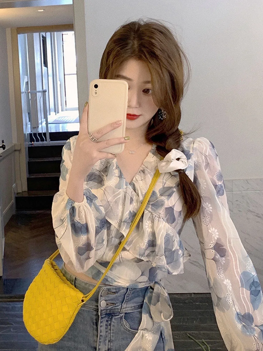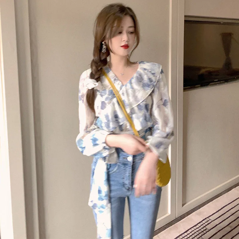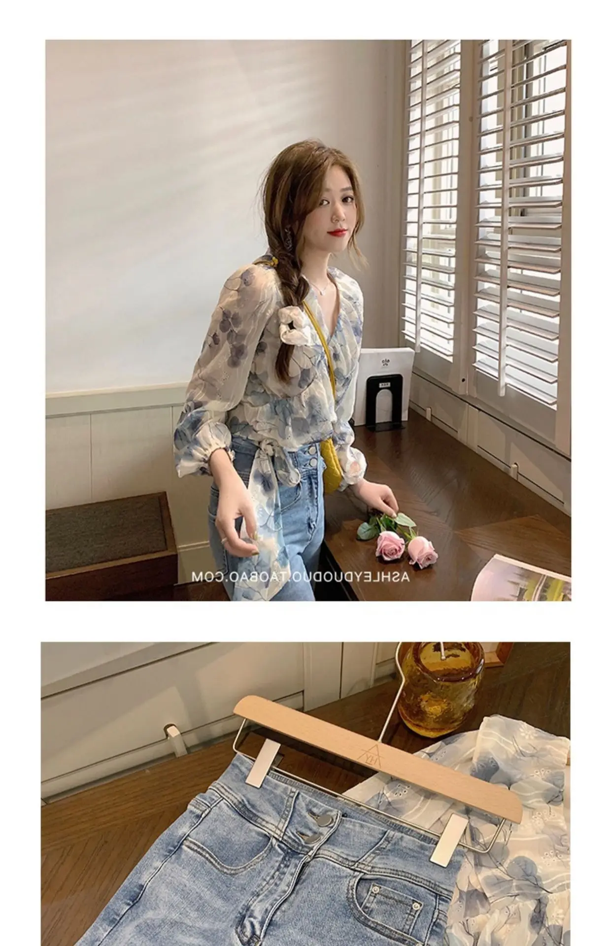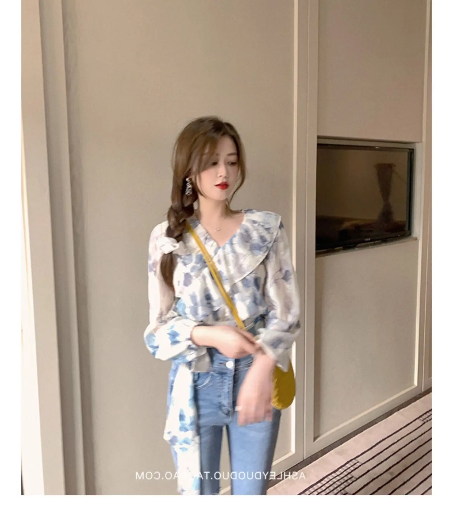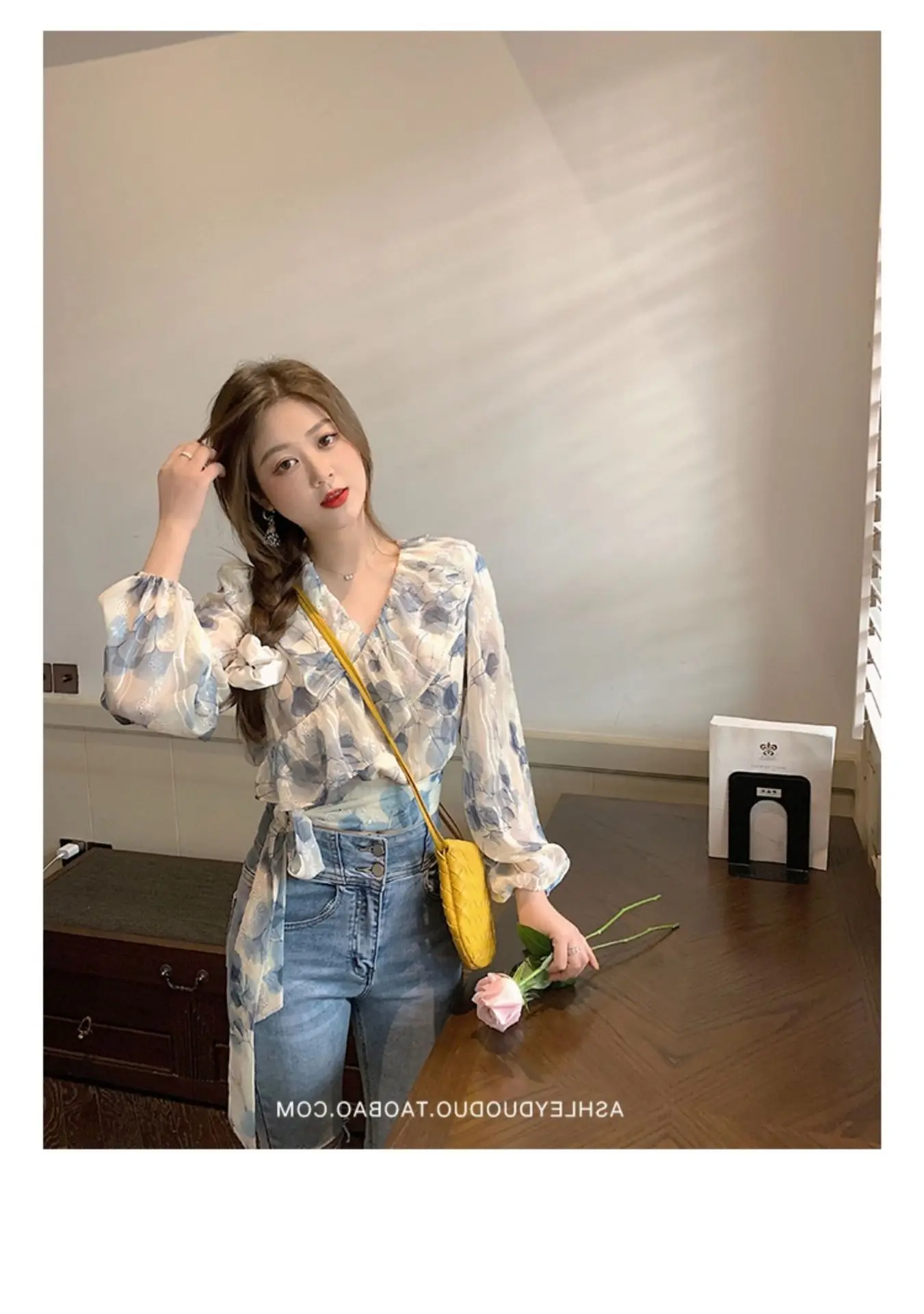 2021 Summer new spring V-neck top temperament chiffon shirt sweet floral shirt women's design