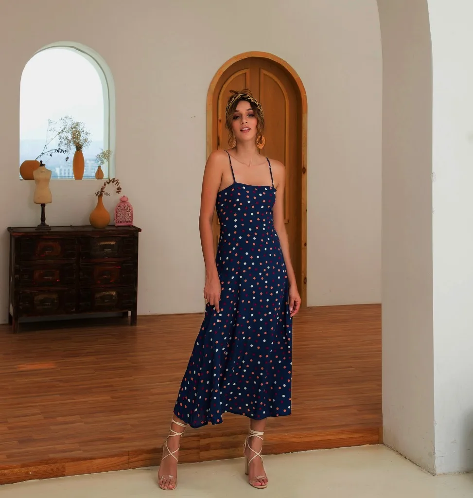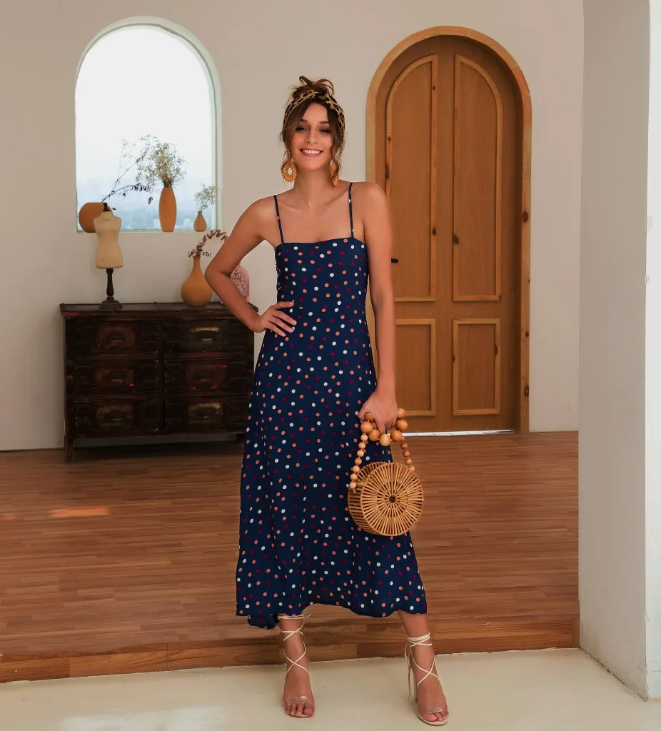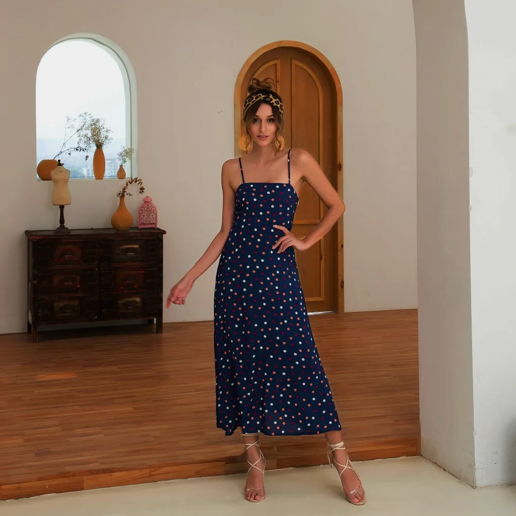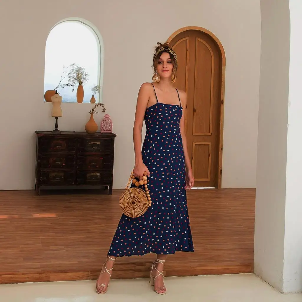 2021 Summer New Women's Fashion Casual Print Slash Neck Spaghetti Straps Sleeveless Backless Loose Waist Ankle Lenght Dress Lady