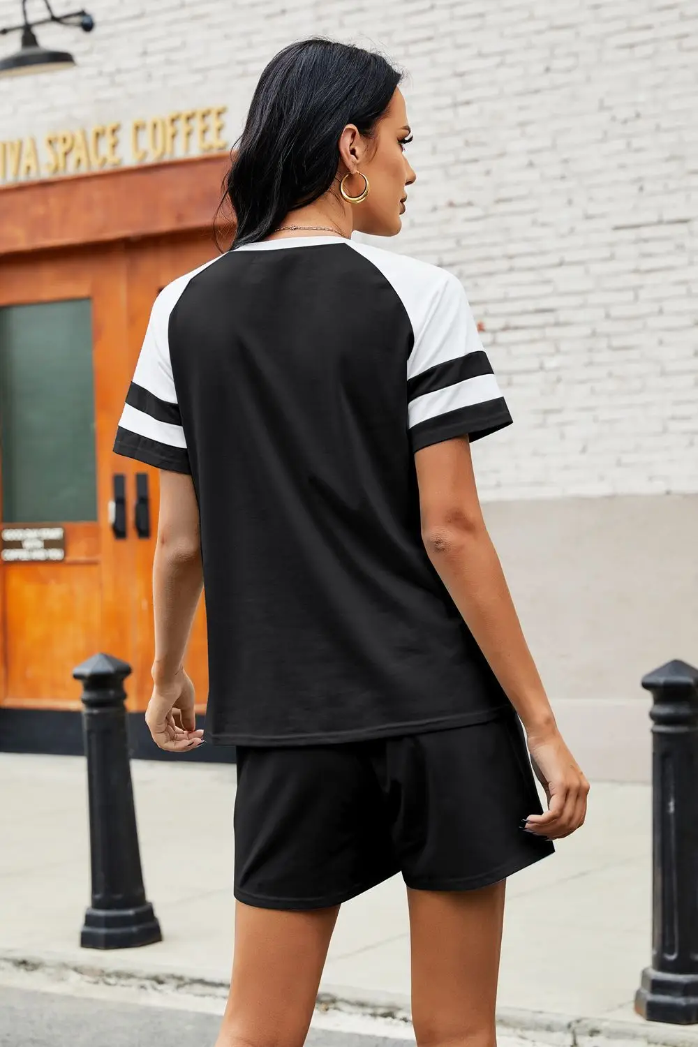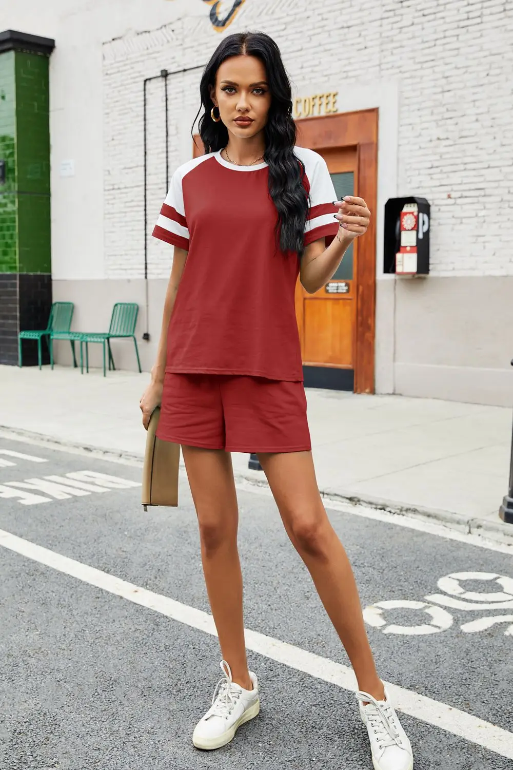 2021 Summer New Women's Fashion Casual Solid Patchwork O Neck Short Sleeve Top Elastic Waist Pockets Straight Short Pant Ladies