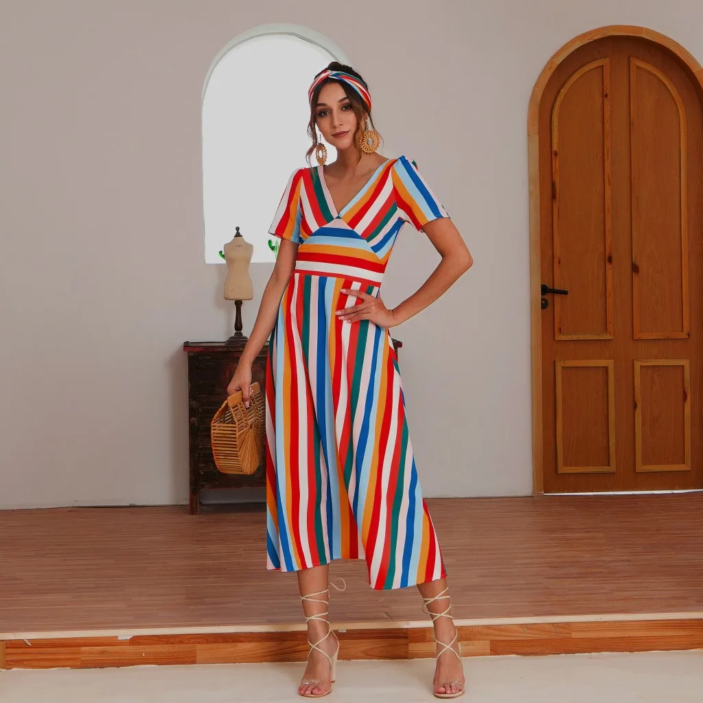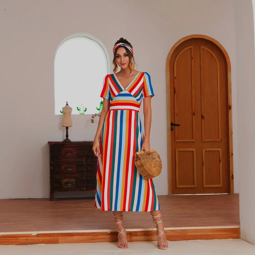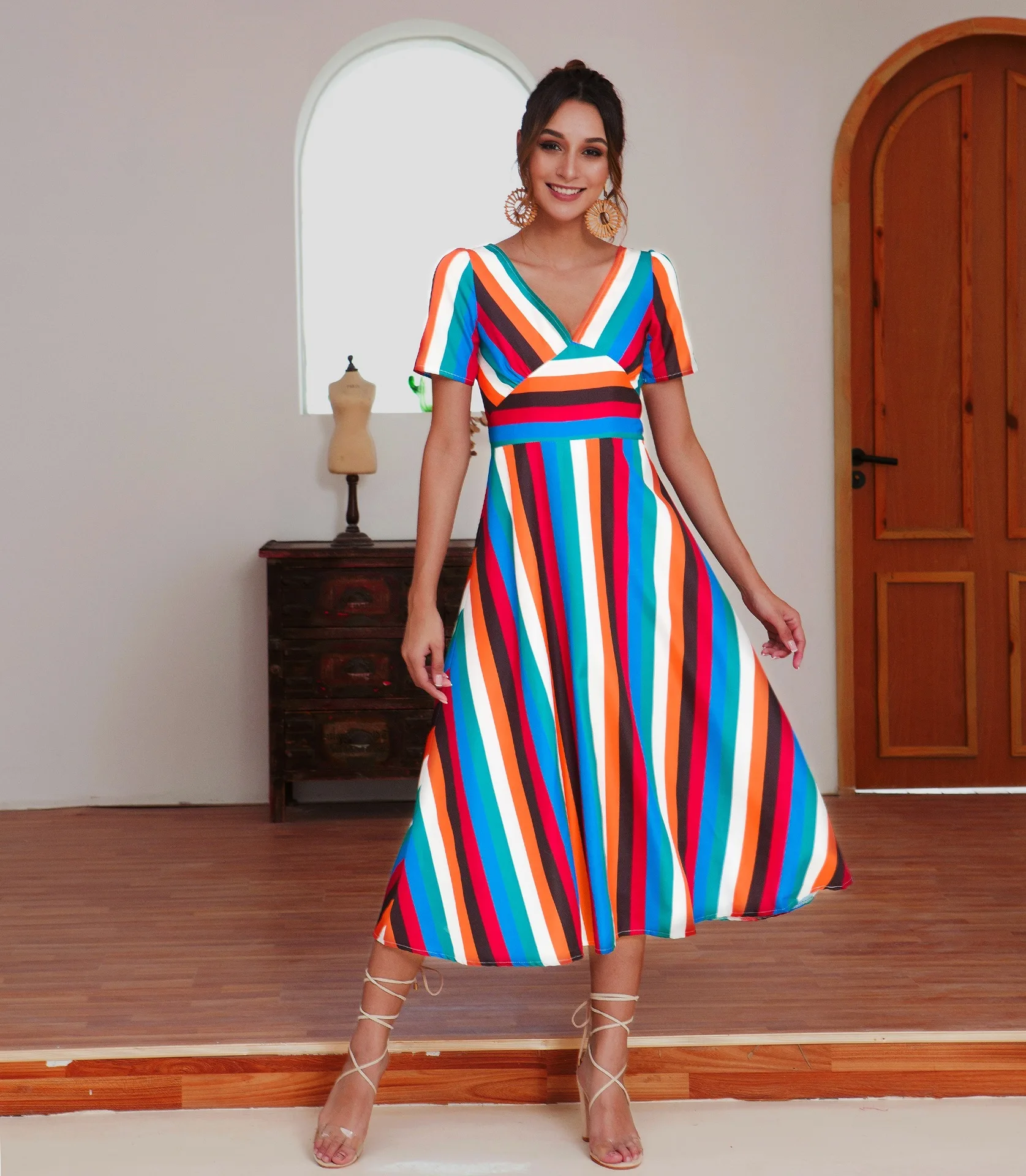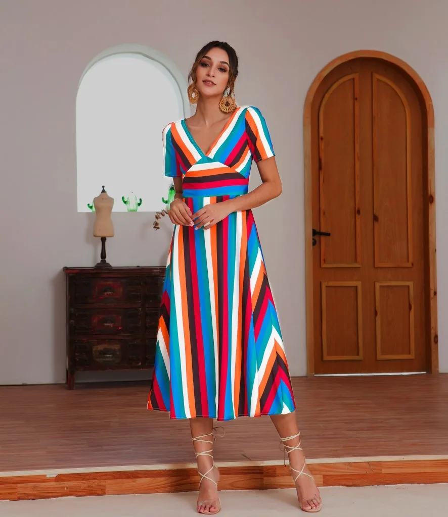 2021 Summer New Women's Fashion Casual Stripe Deep V Neck Short Sleeve Patchwork Zipper Empire A Line Ankle Lenght Dress Ladies