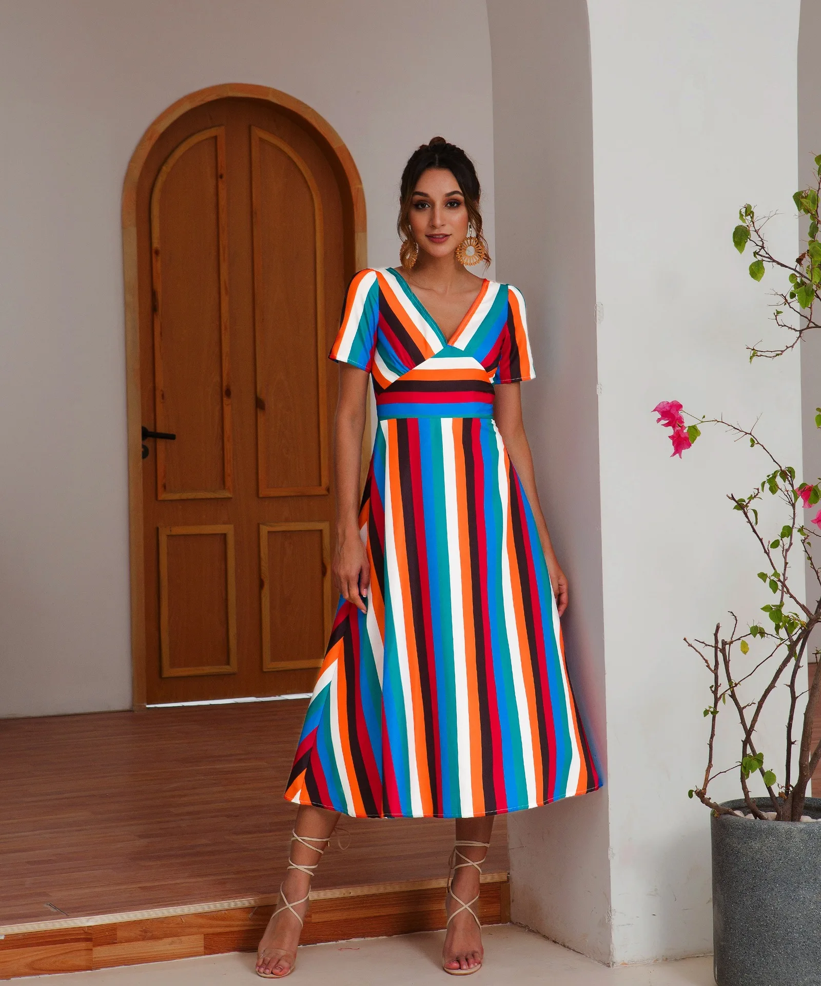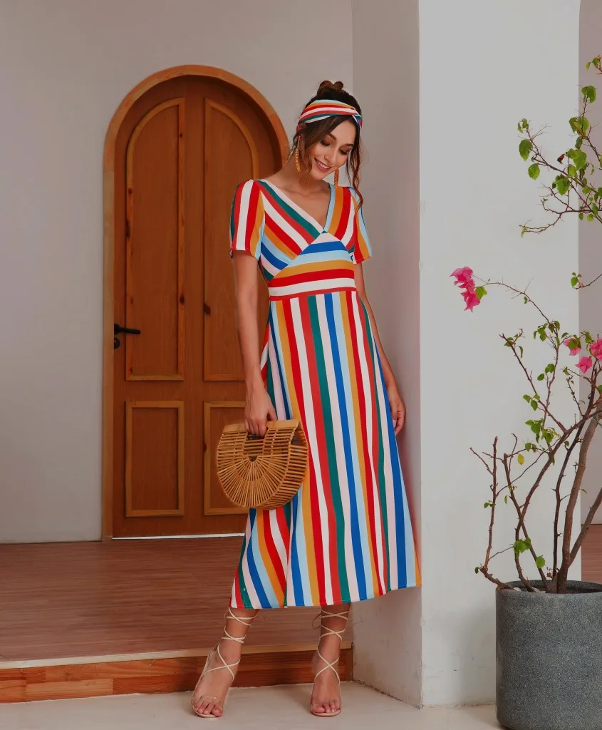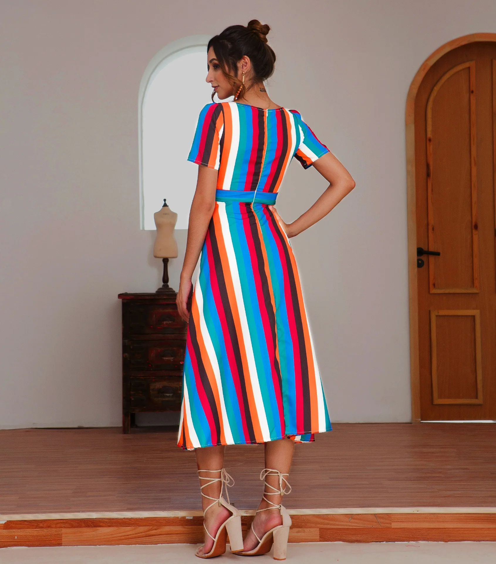 2021 Summer New Women's Fashion Casual Stripe Deep V Neck Short Sleeve Patchwork Zipper Empire A Line Ankle Lenght Dress Ladies