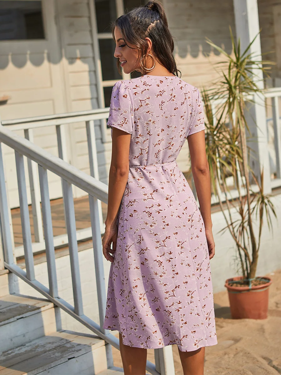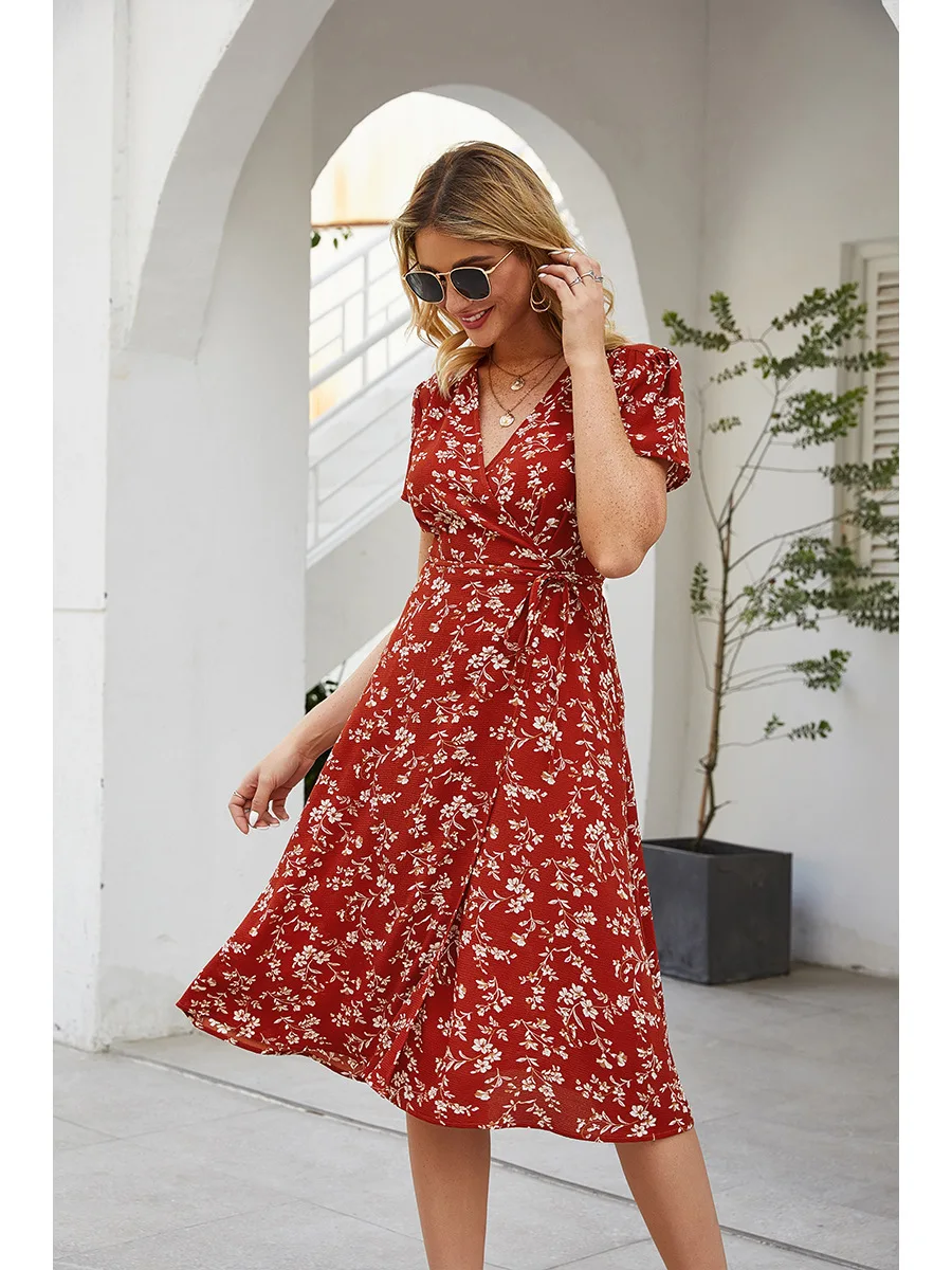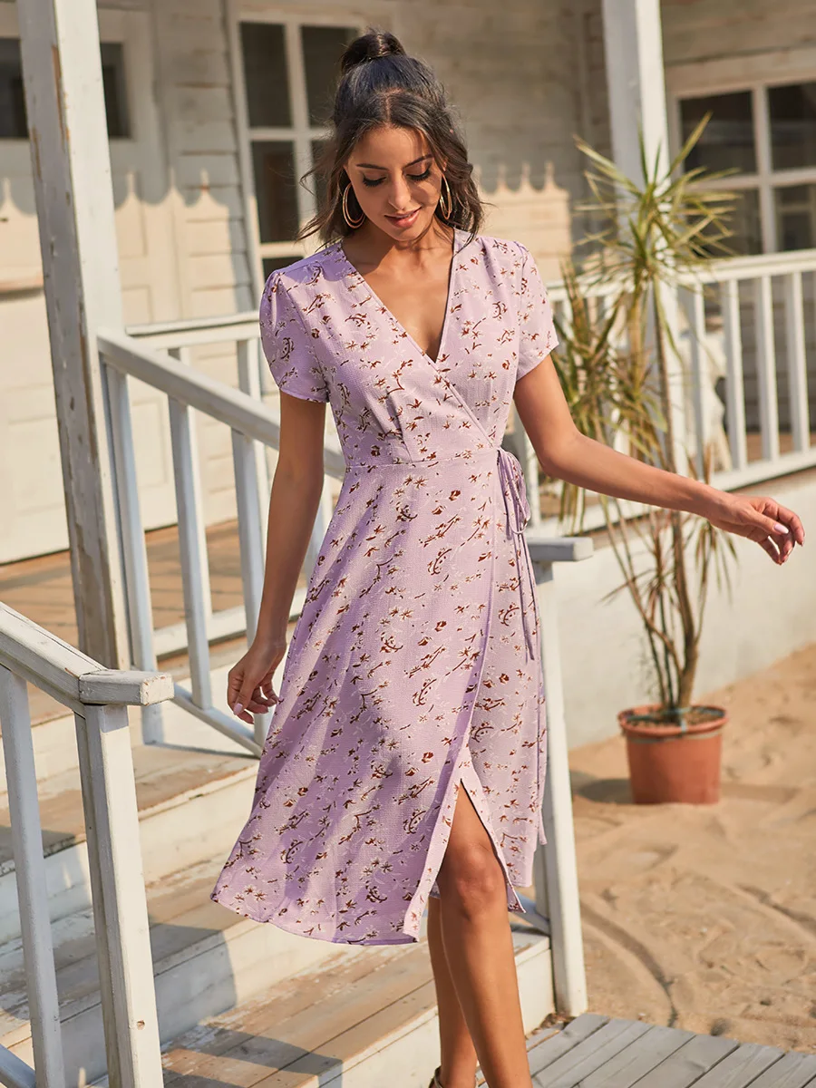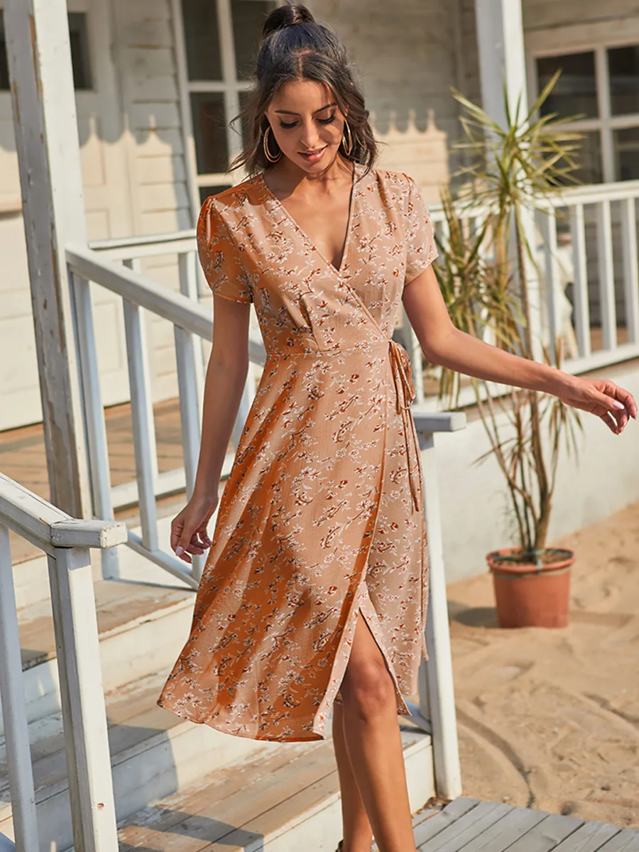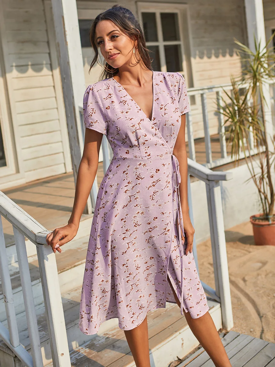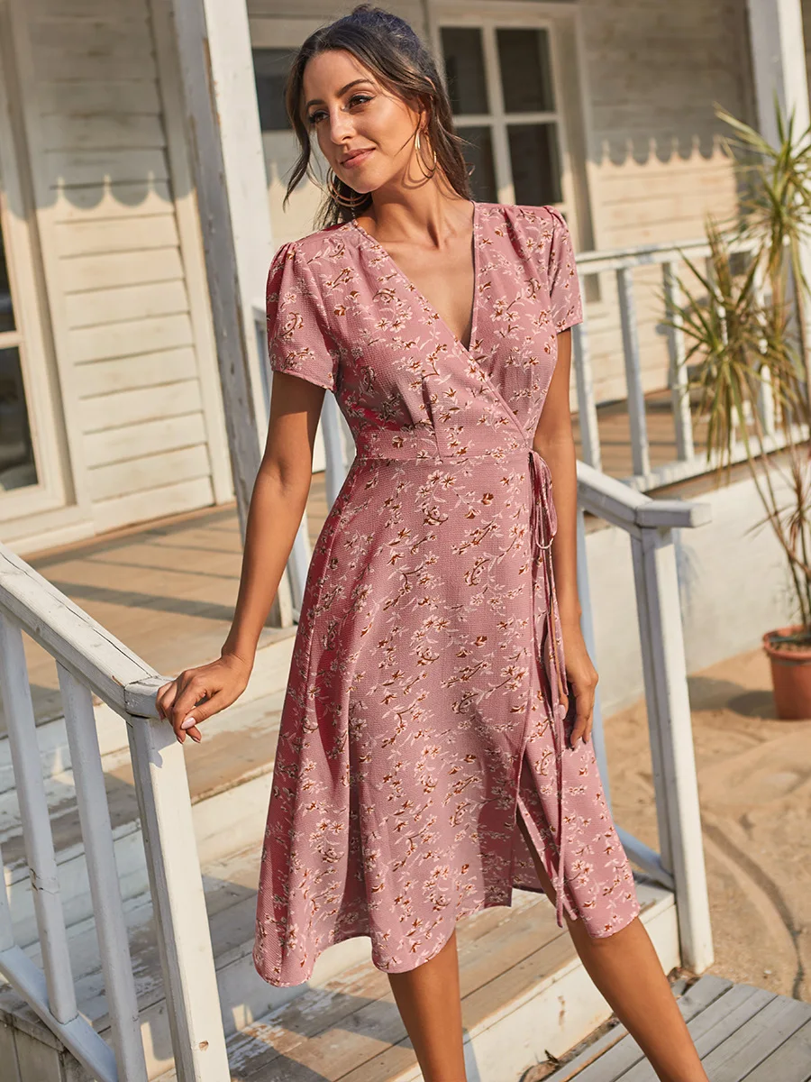 2021 Summer New Women's Fashion Sexy Floral Print Deep V Neck Short Sleeve Lace Up Tunic Split Knee Lenght Dress Lady Slim Basic