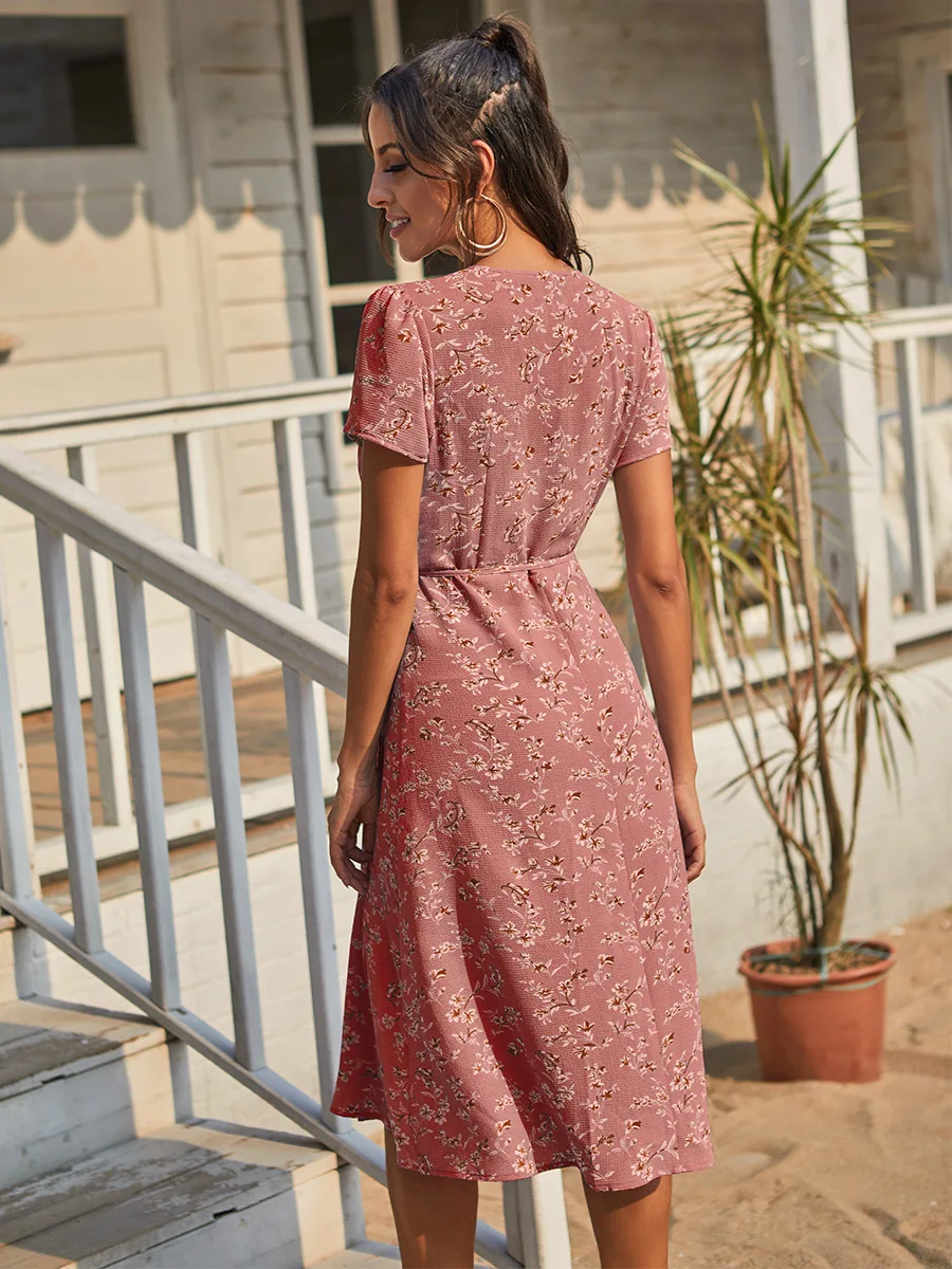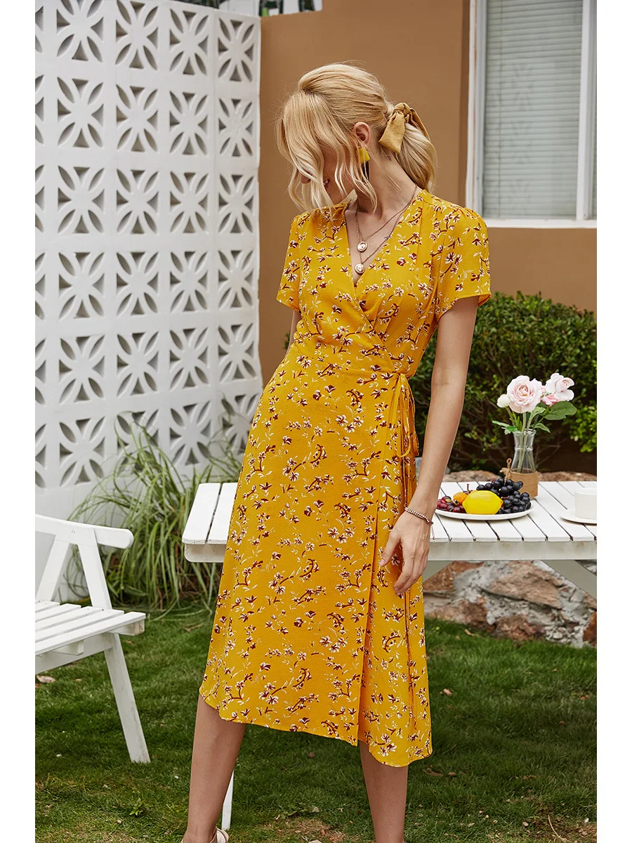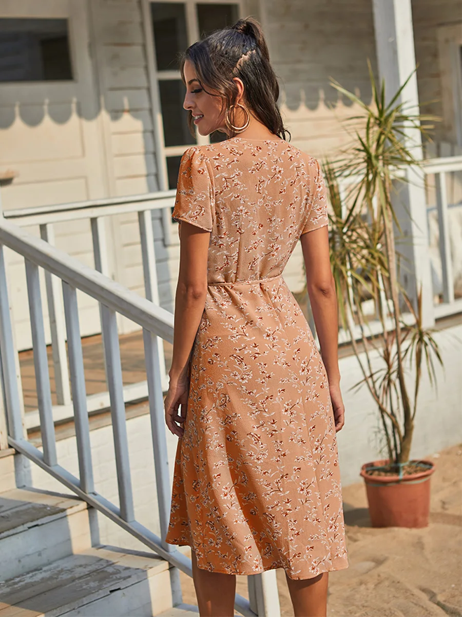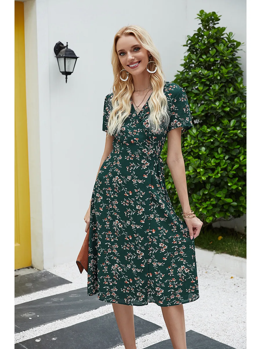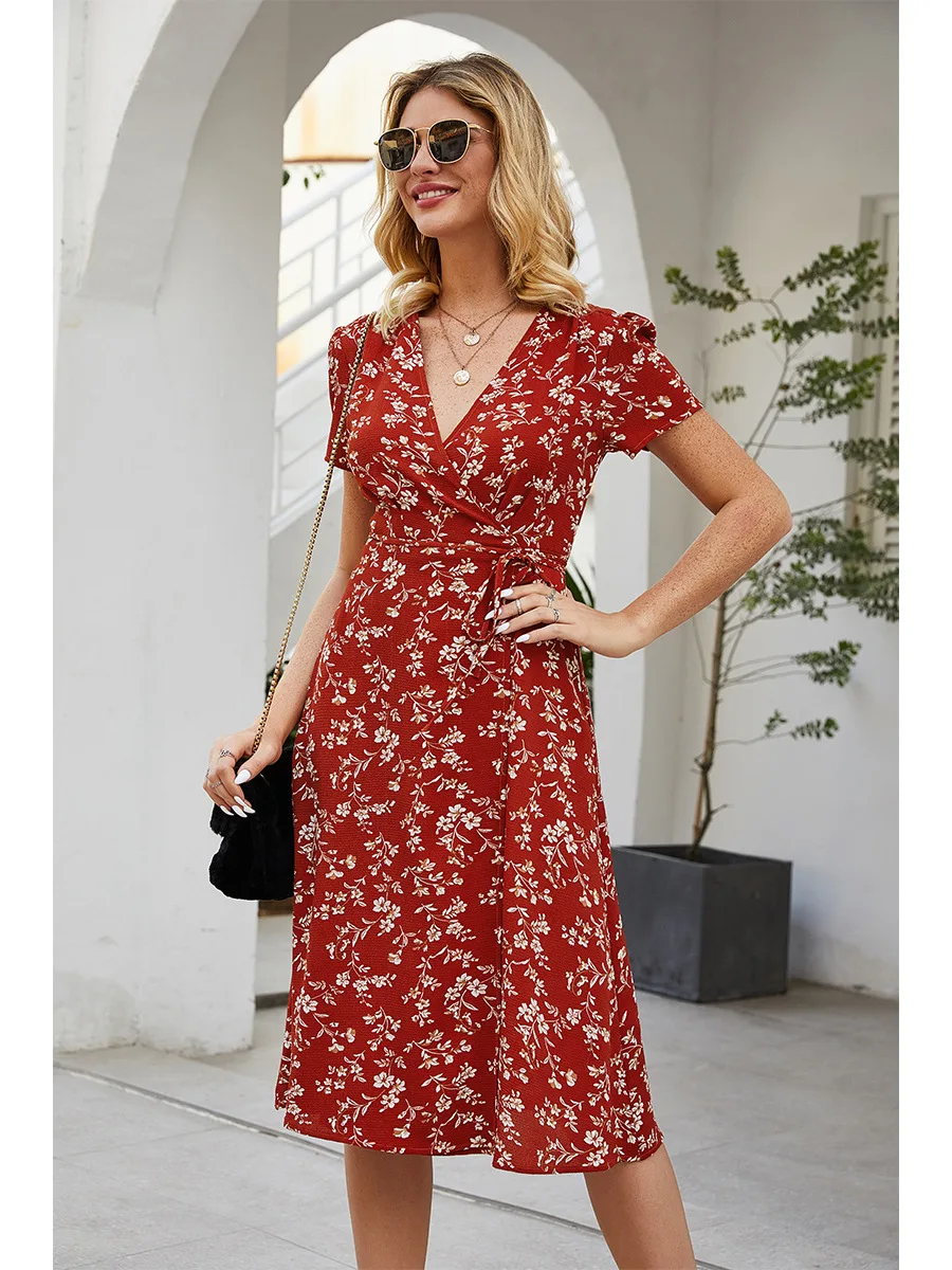 2021 Summer New Women's Fashion Sexy Floral Print Deep V Neck Short Sleeve Lace Up Tunic Split Knee Lenght Dress Lady Slim Basic