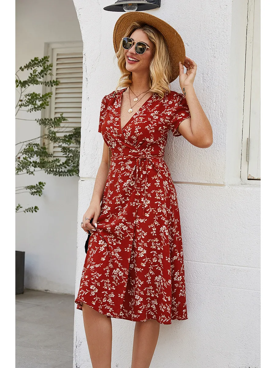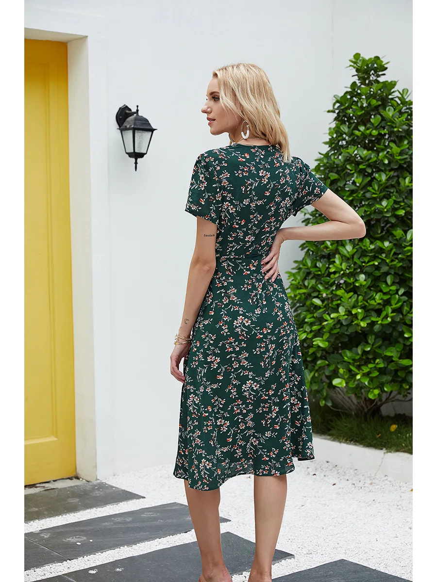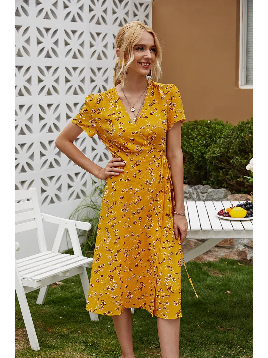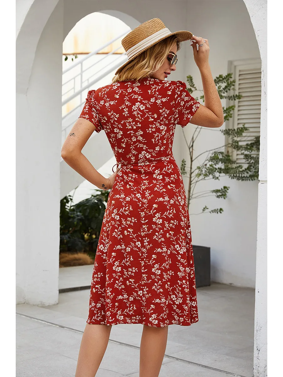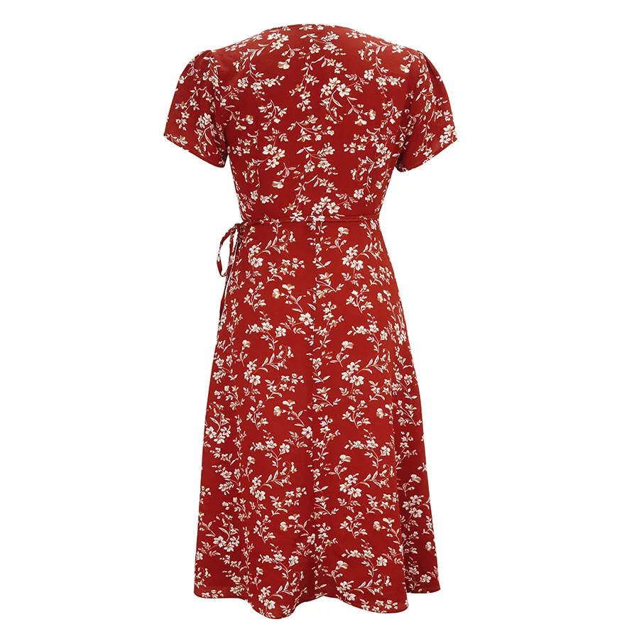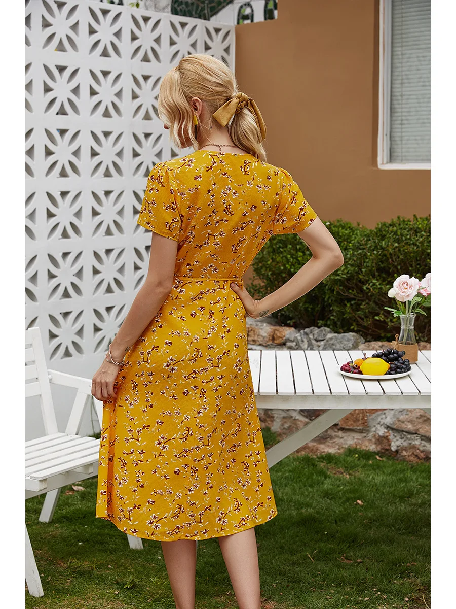2021 Summer New Women's Fashion Sexy Floral Print Deep V Neck Short Sleeve Lace Up Tunic Split Knee Lenght Dress Lady Slim Basic