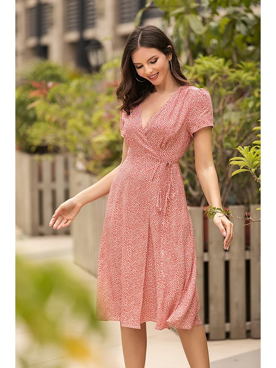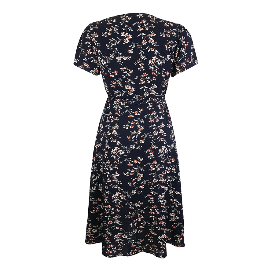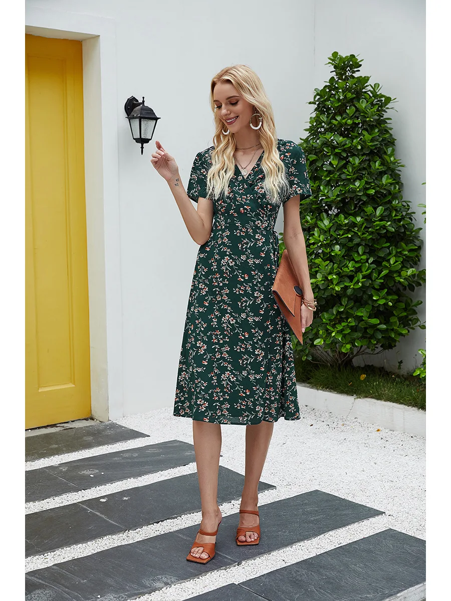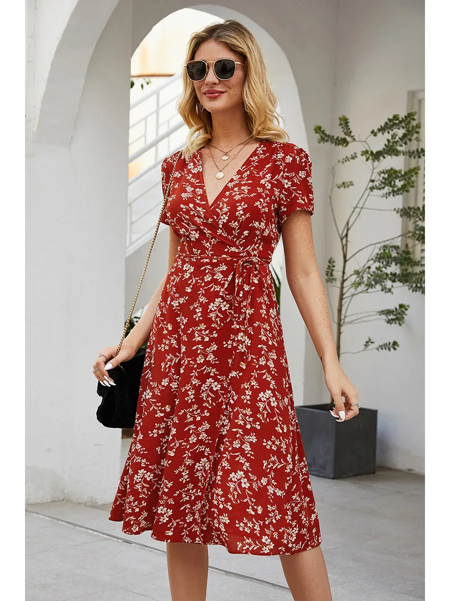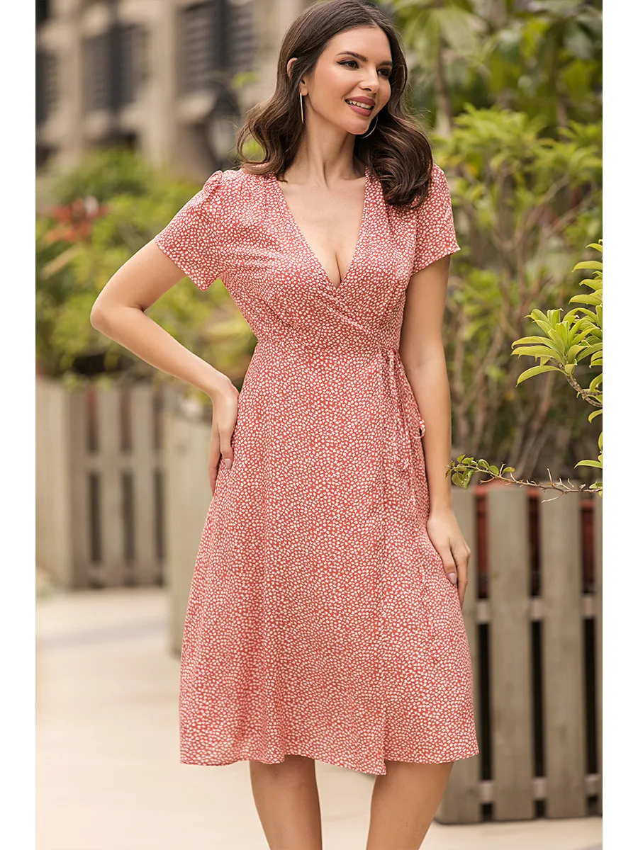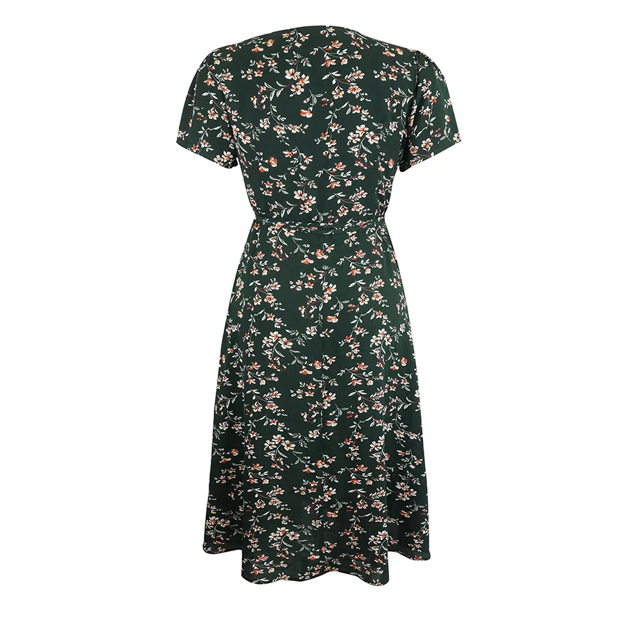 2021 Summer New Women's Fashion Sexy Floral Print Deep V Neck Short Sleeve Lace Up Tunic Split Knee Lenght Dress Lady Slim Basic
