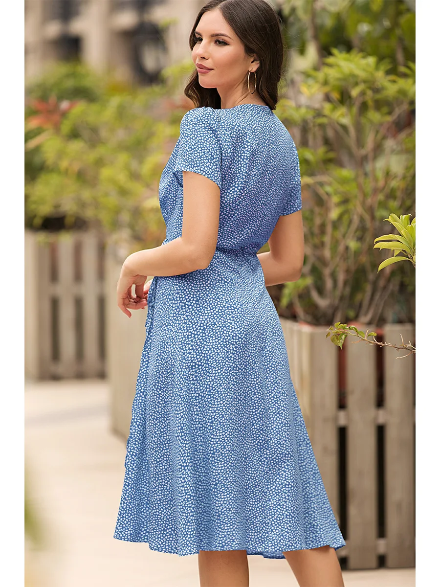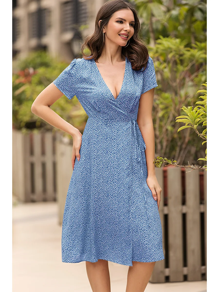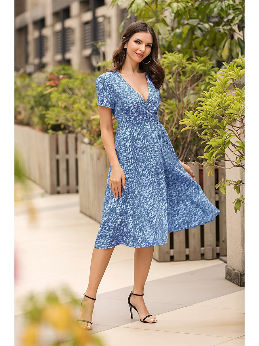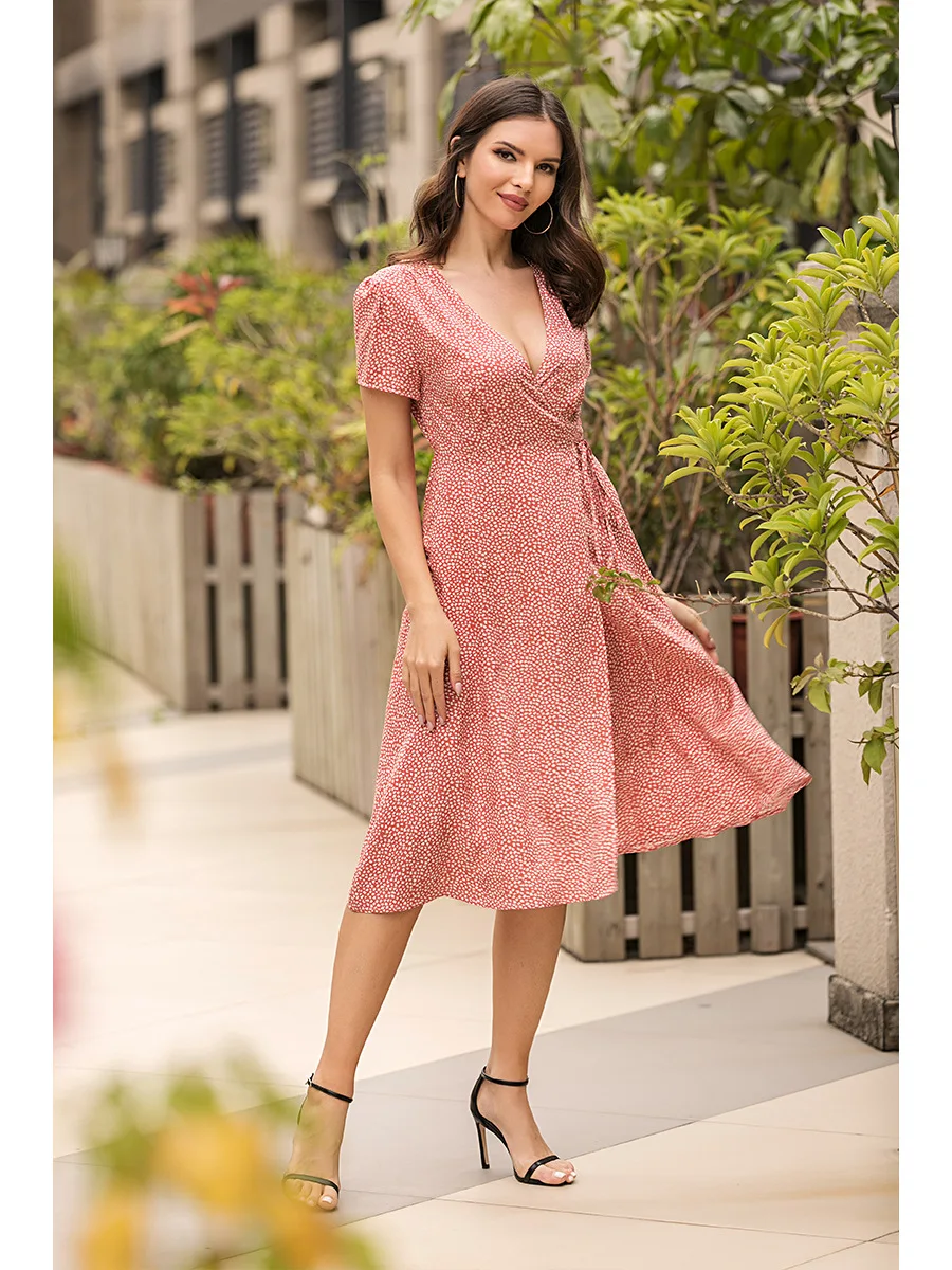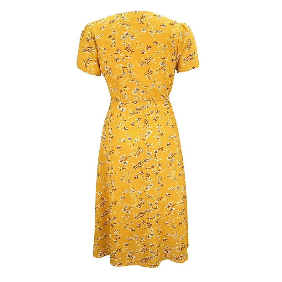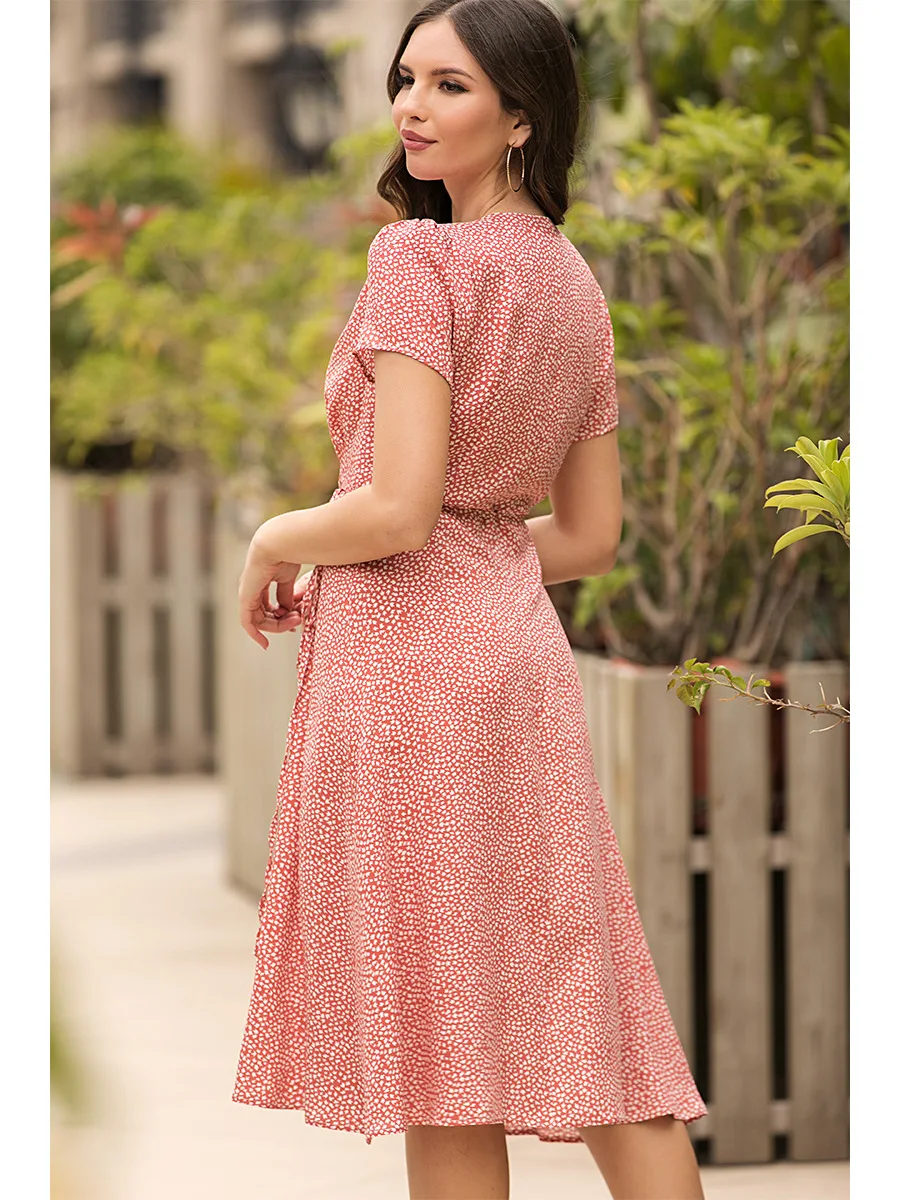 2021 Summer New Women's Fashion Sexy Floral Print Deep V Neck Short Sleeve Lace Up Tunic Split Knee Lenght Dress Lady Slim Basic