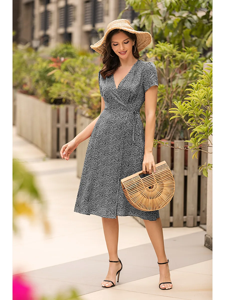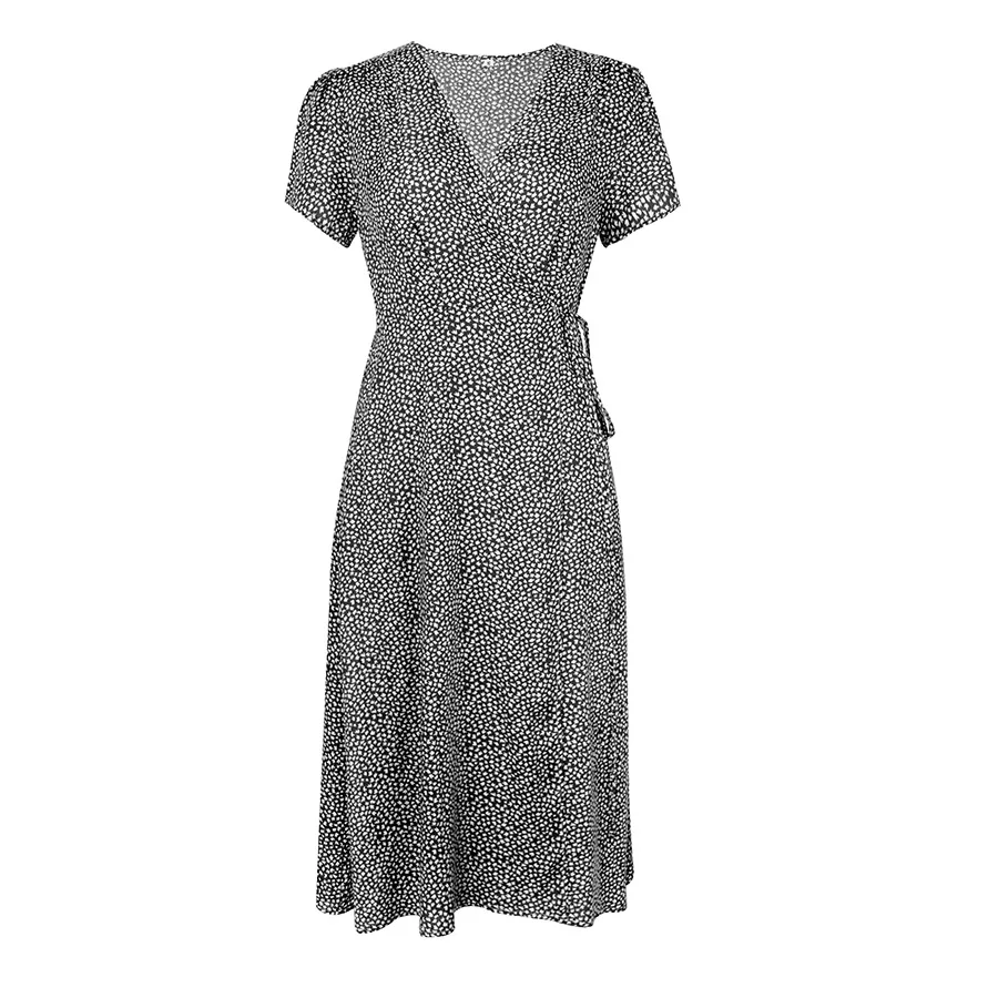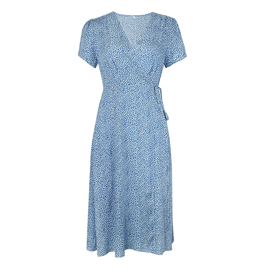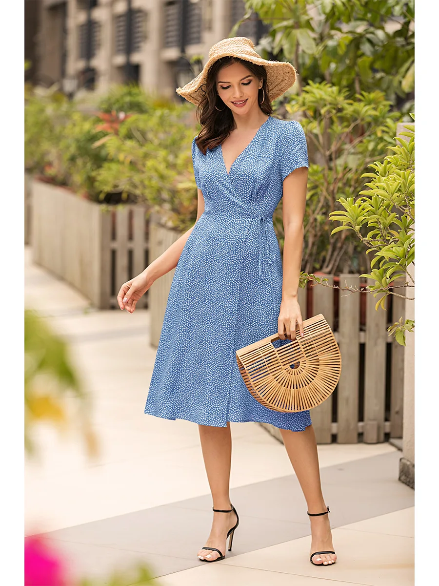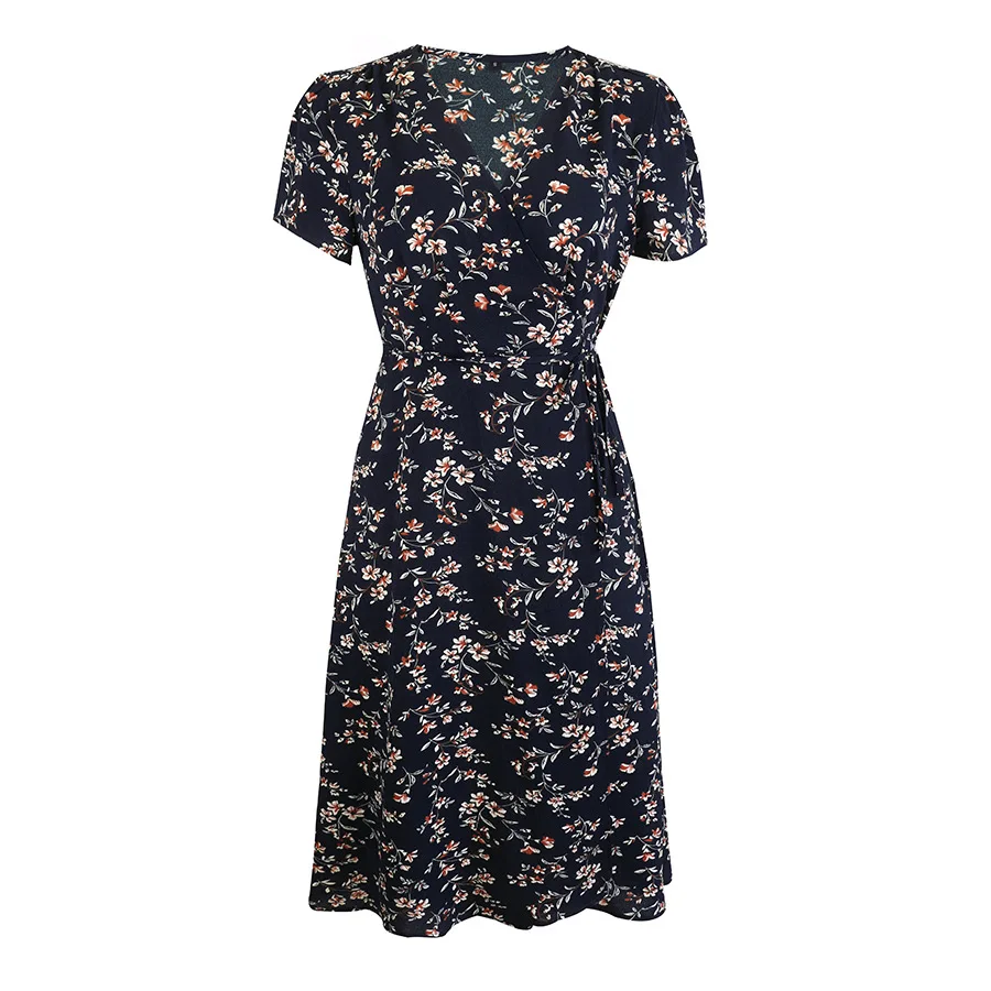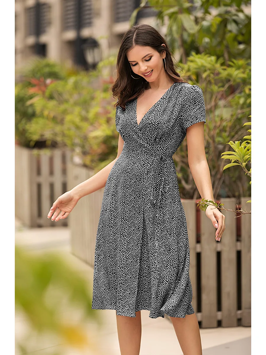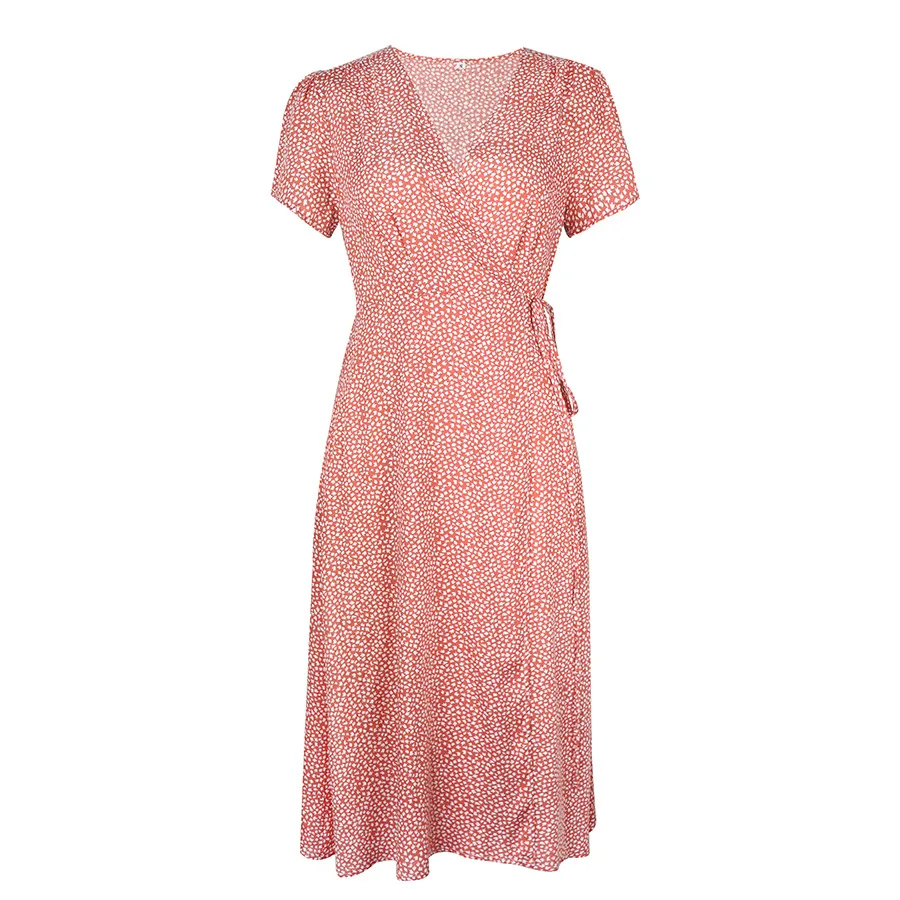 2021 Summer New Women's Fashion Sexy Floral Print Deep V Neck Short Sleeve Lace Up Tunic Split Knee Lenght Dress Lady Slim Basic