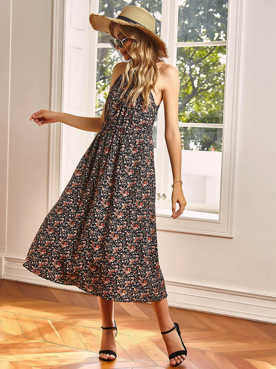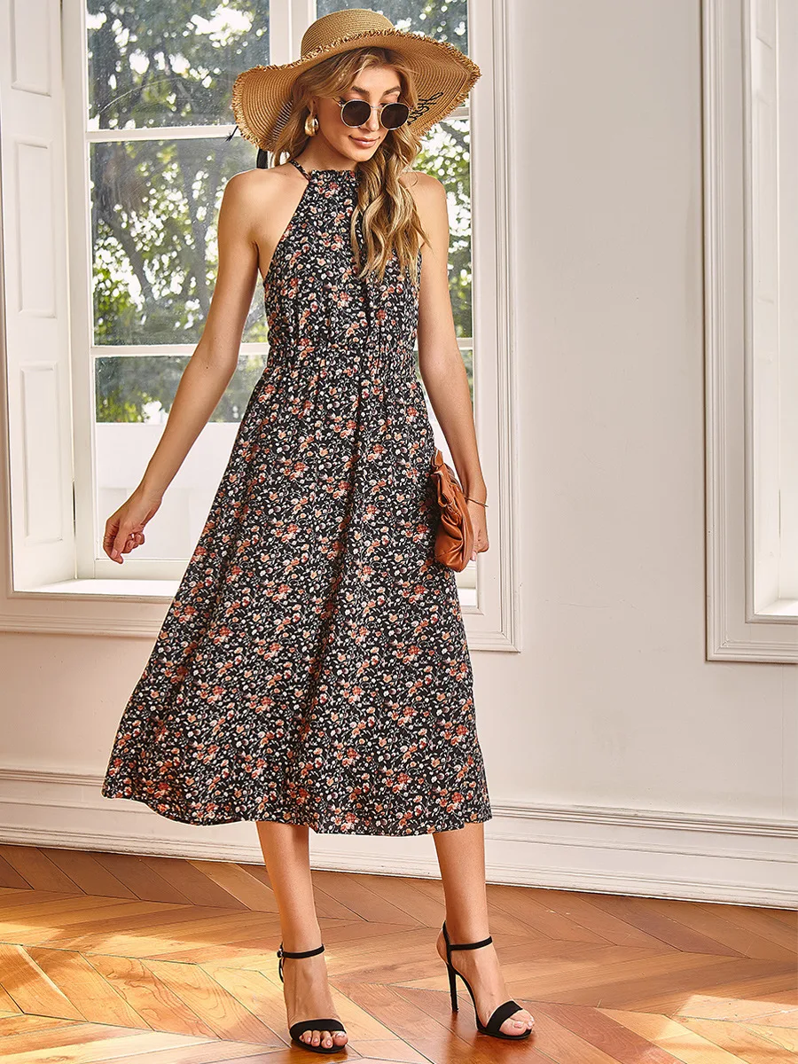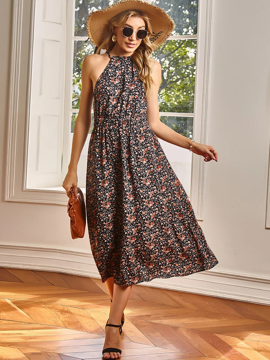 2021 Summer New Women's Fashion Sexy Foral Print O Neck Lace Up Sleeveless Empire Tunic Skinny A Line Mid Calf Dress Lady Basic