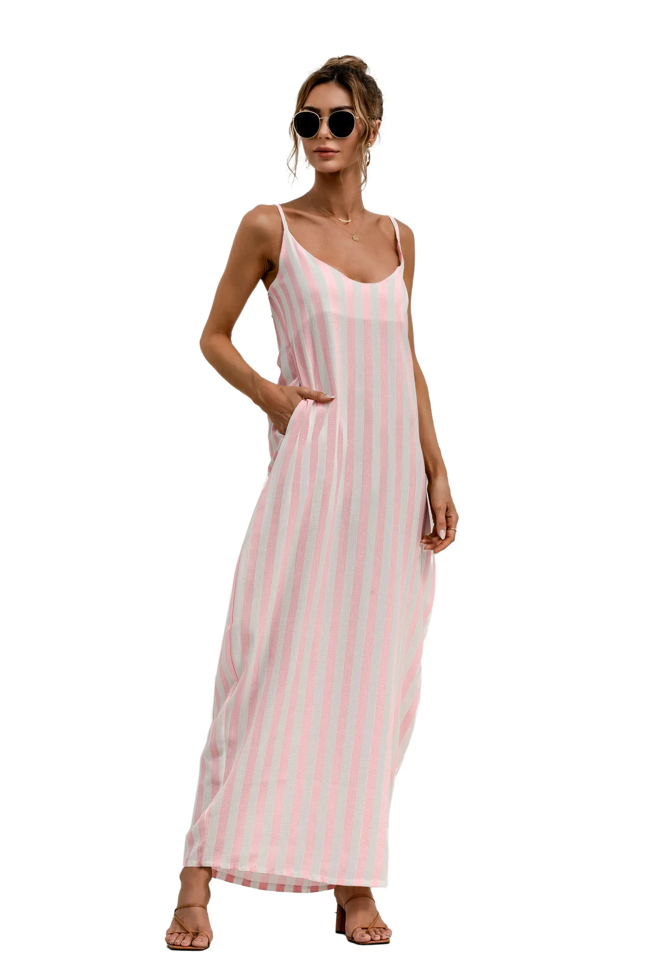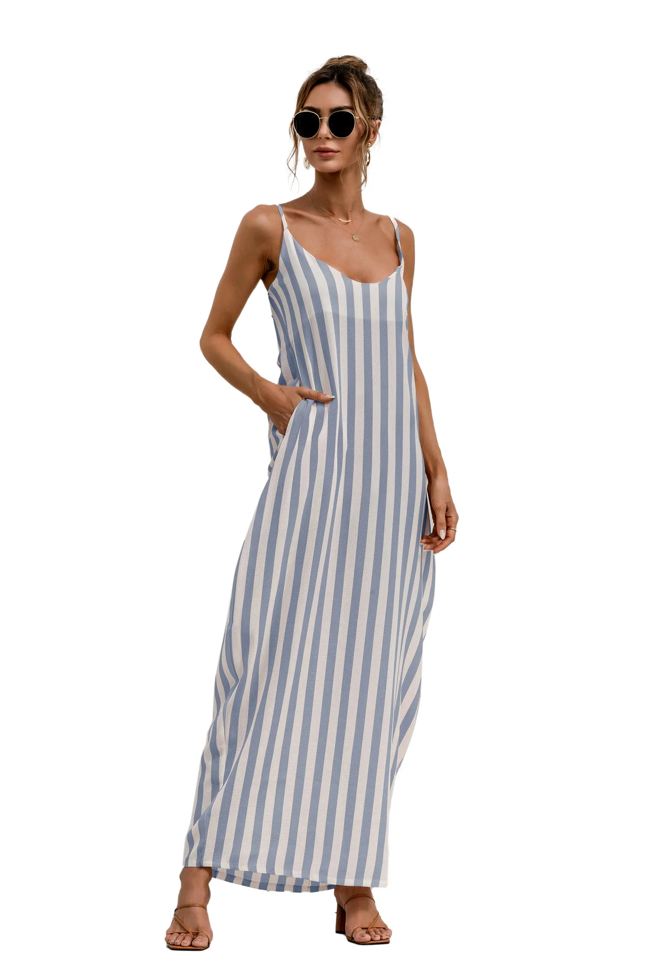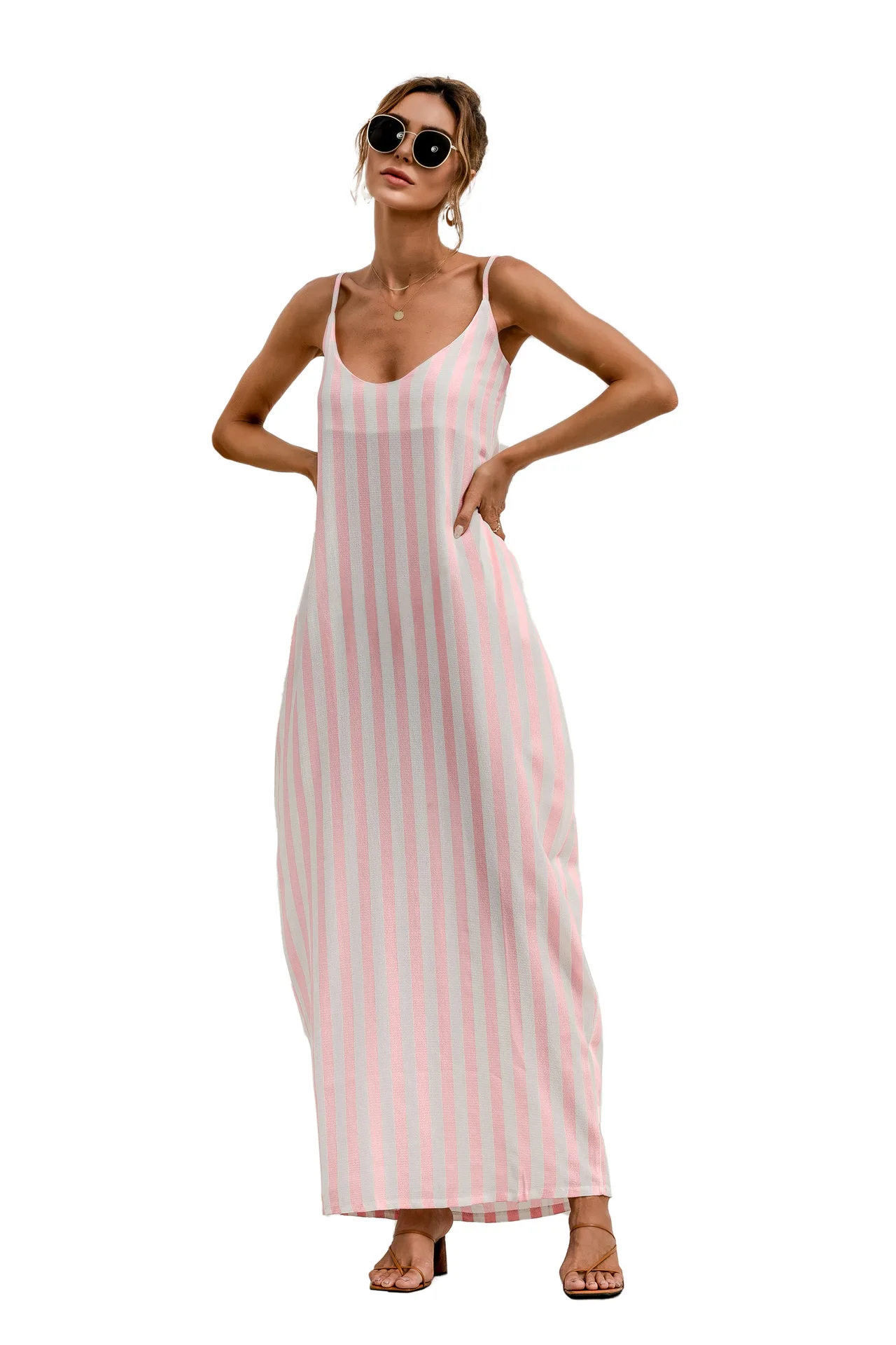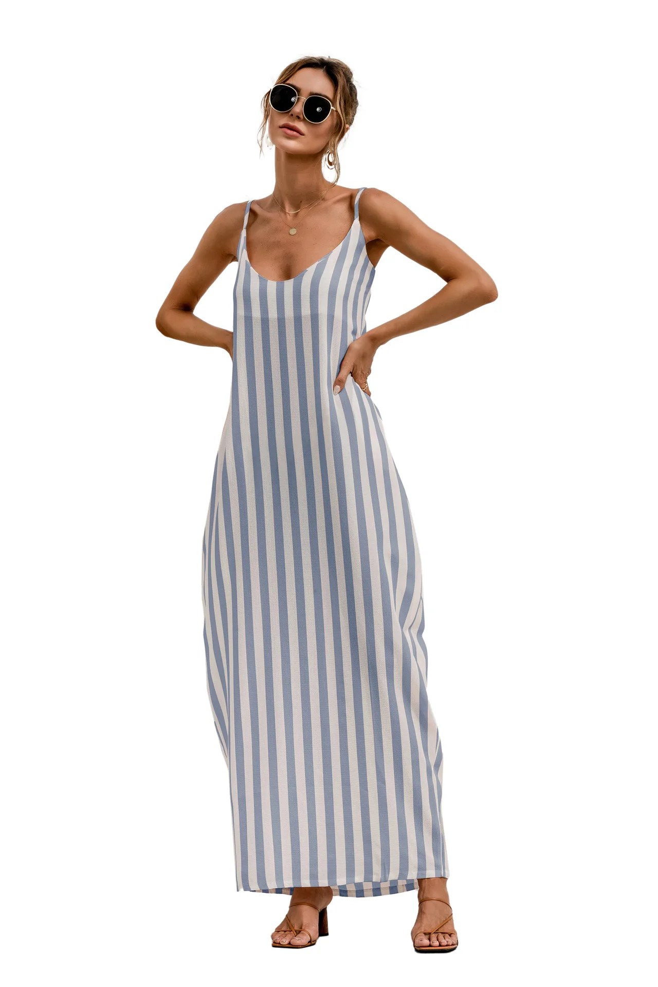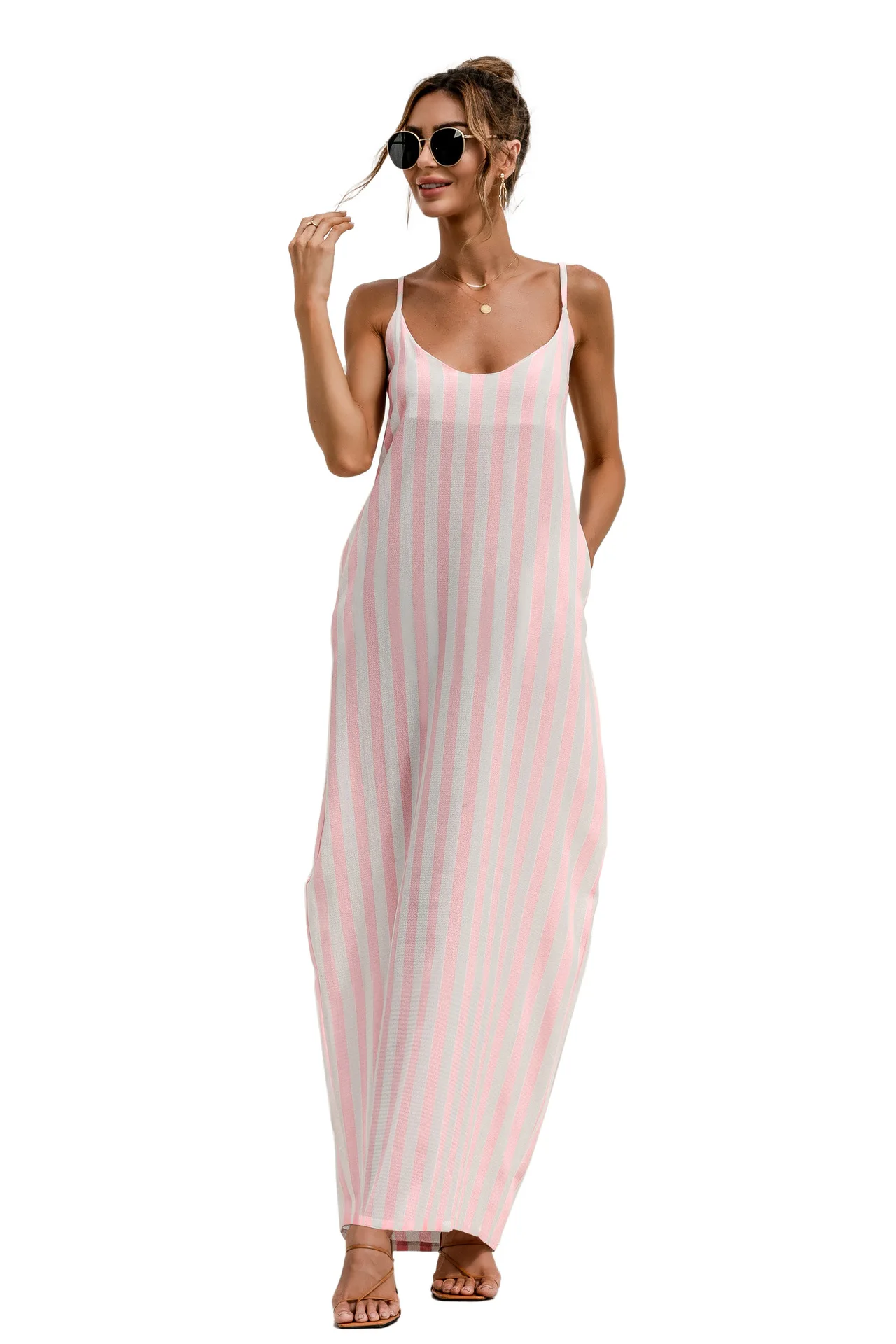 2021 Summer New Women's Fashion Sexy Stripe V Neck Spaghetti Straps Sleeveless Backless Loose Waist Pockets Ankle Lenght Dress
