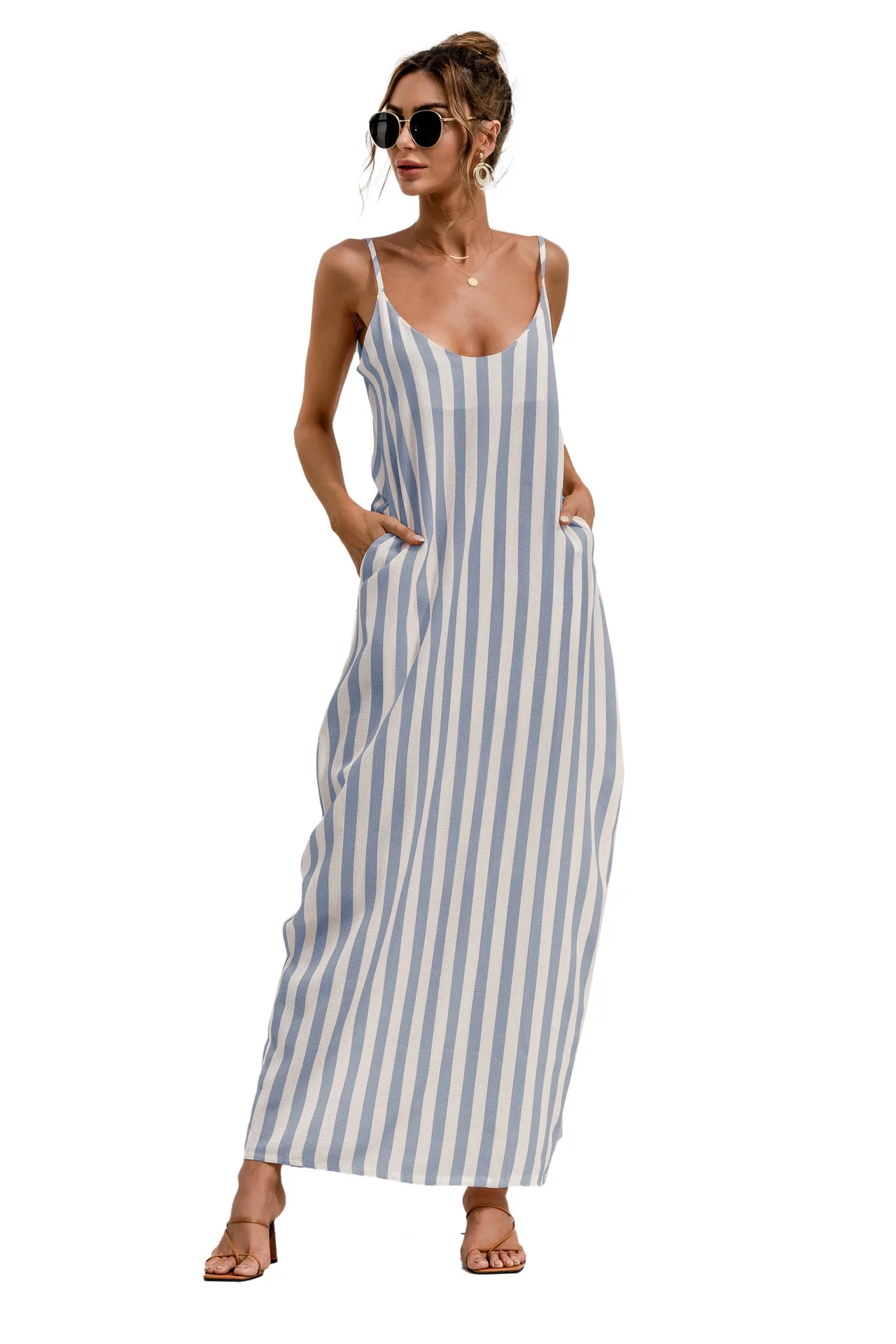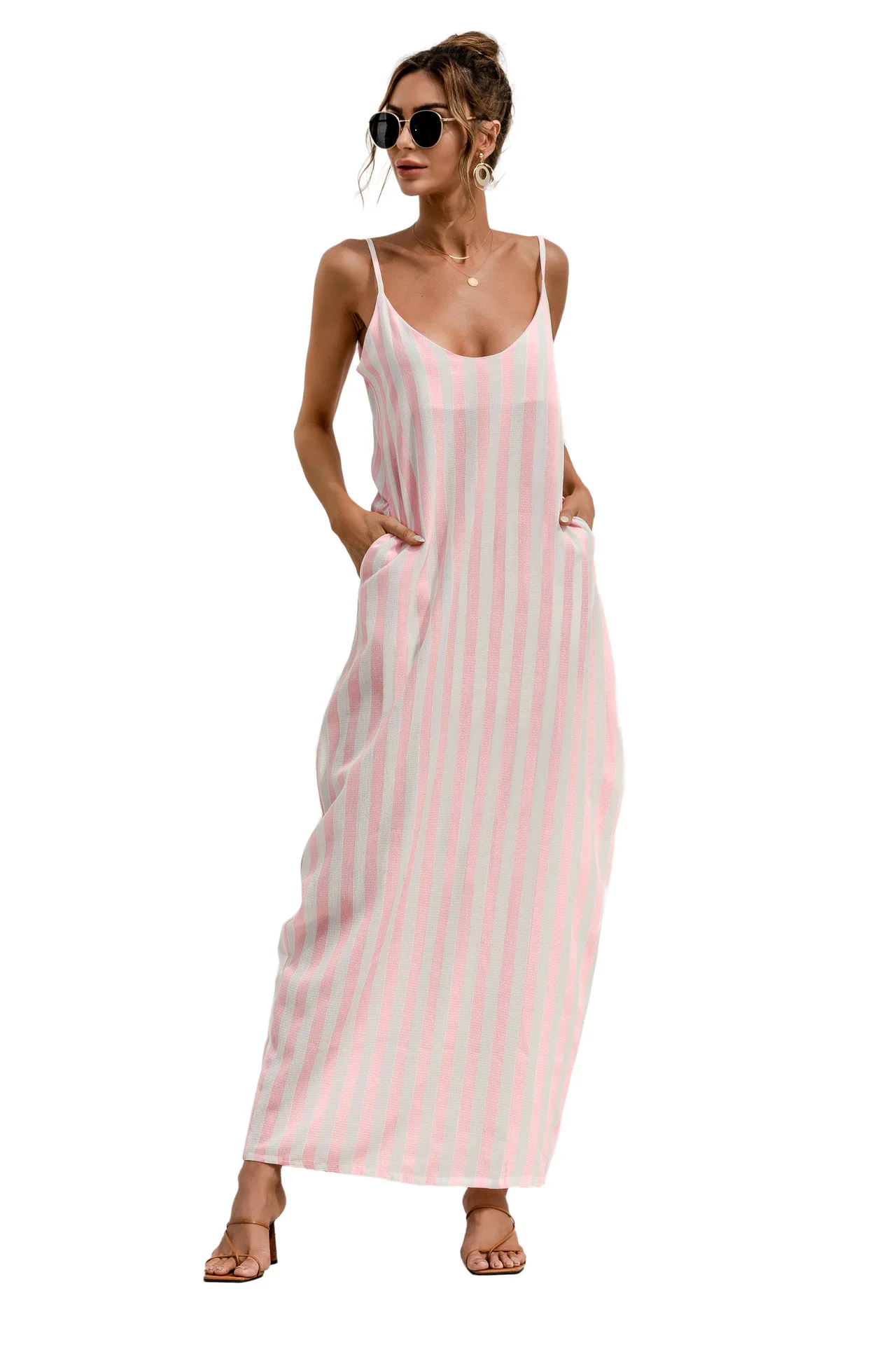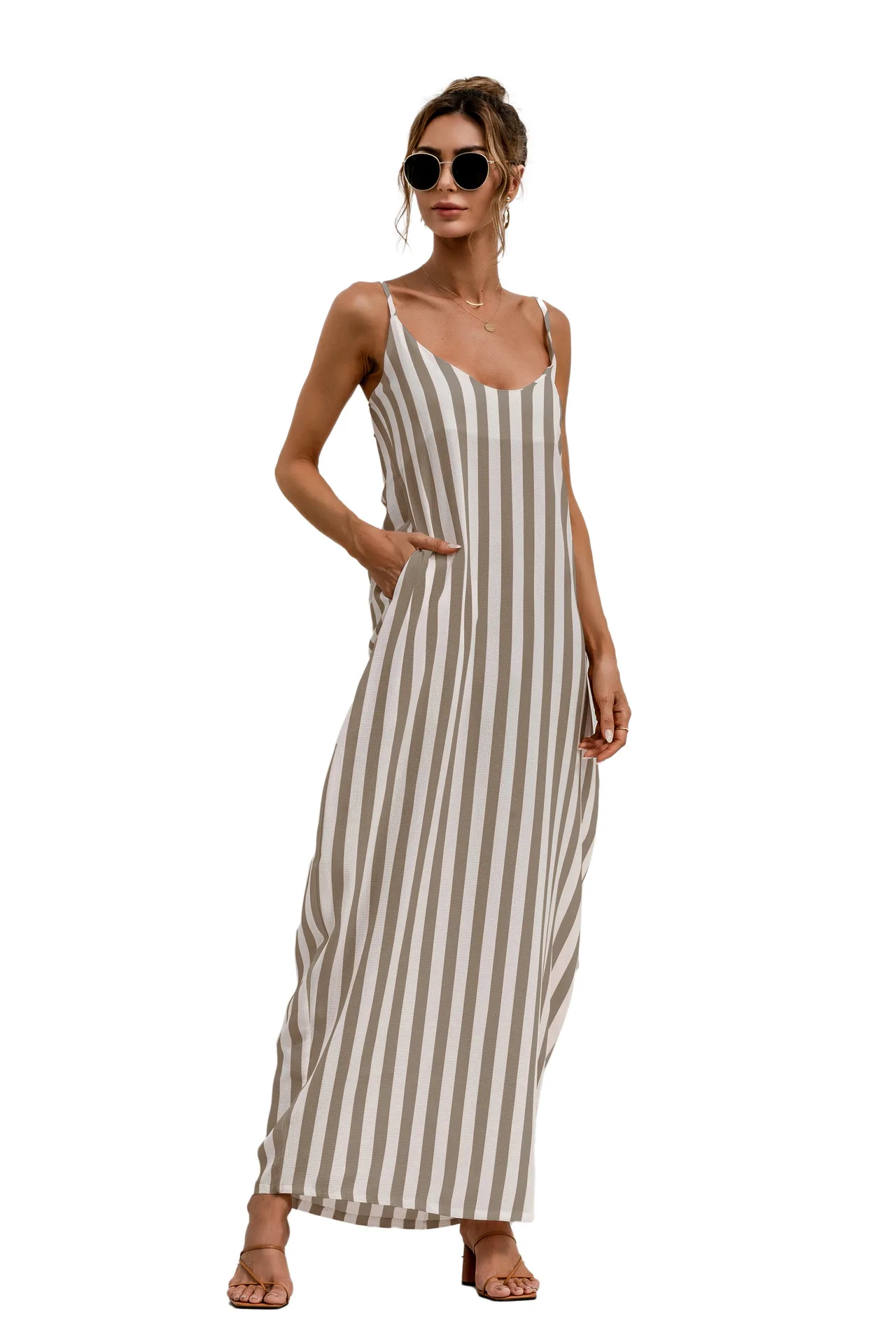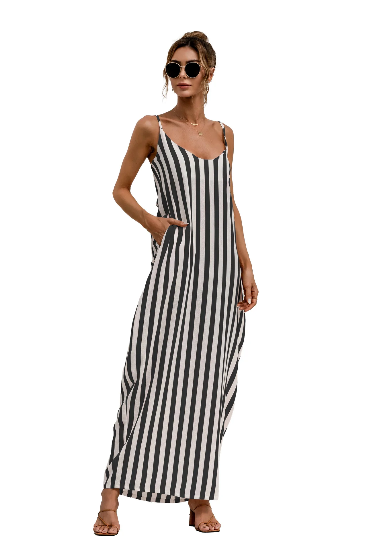 2021 Summer New Women's Fashion Sexy Stripe V Neck Spaghetti Straps Sleeveless Backless Loose Waist Pockets Ankle Lenght Dress