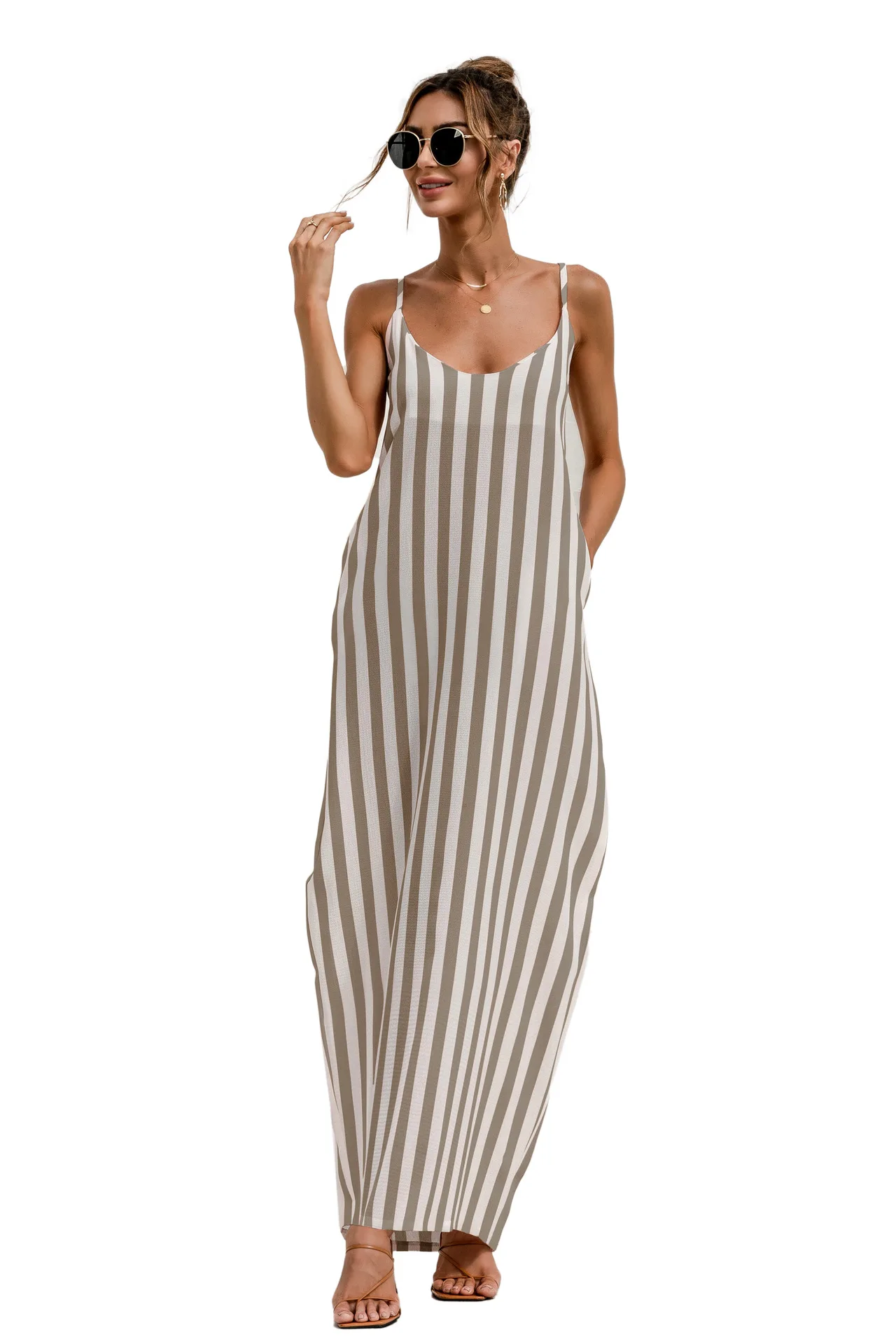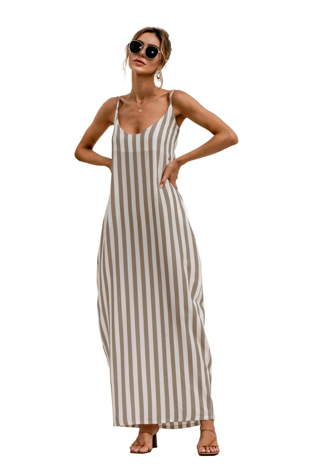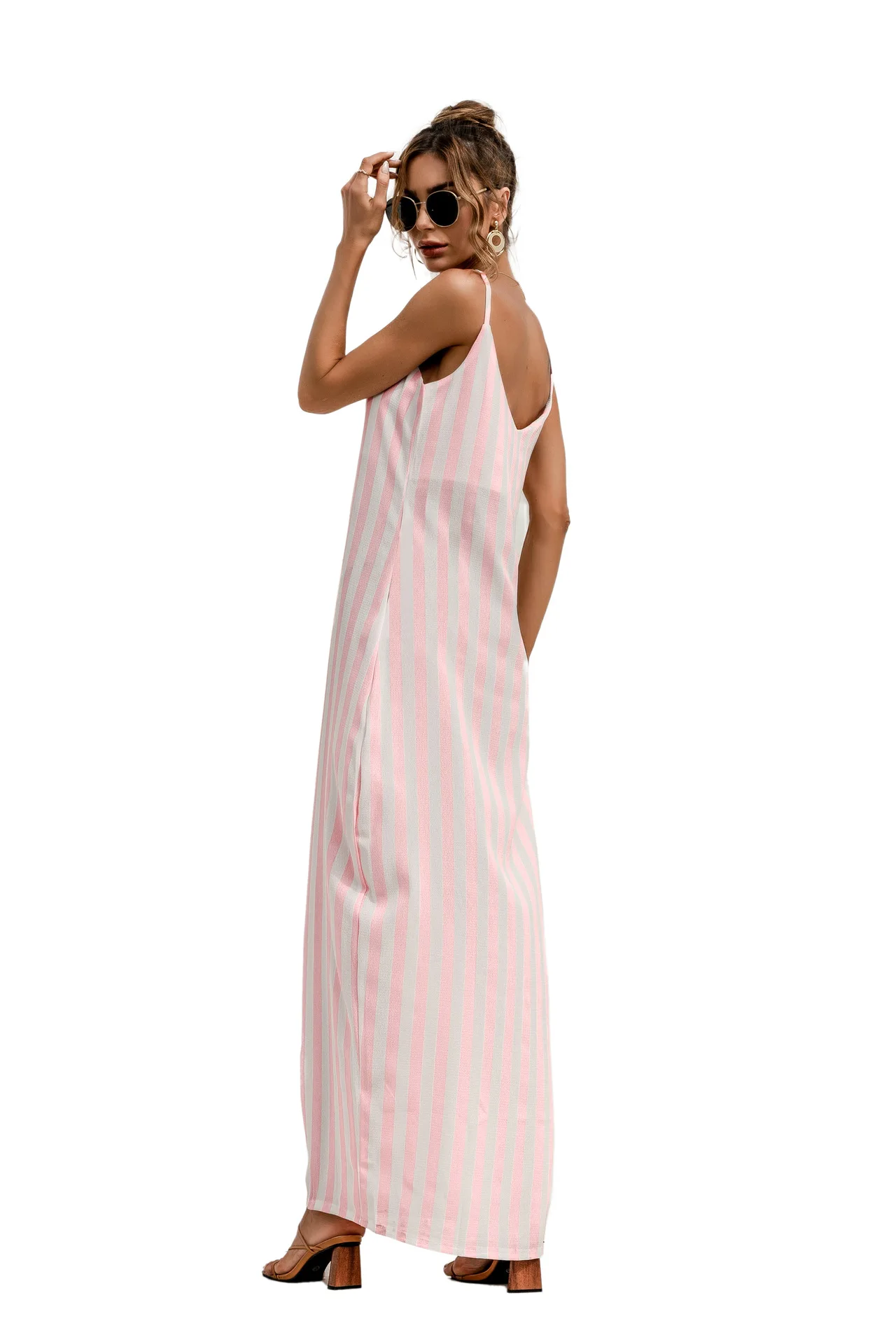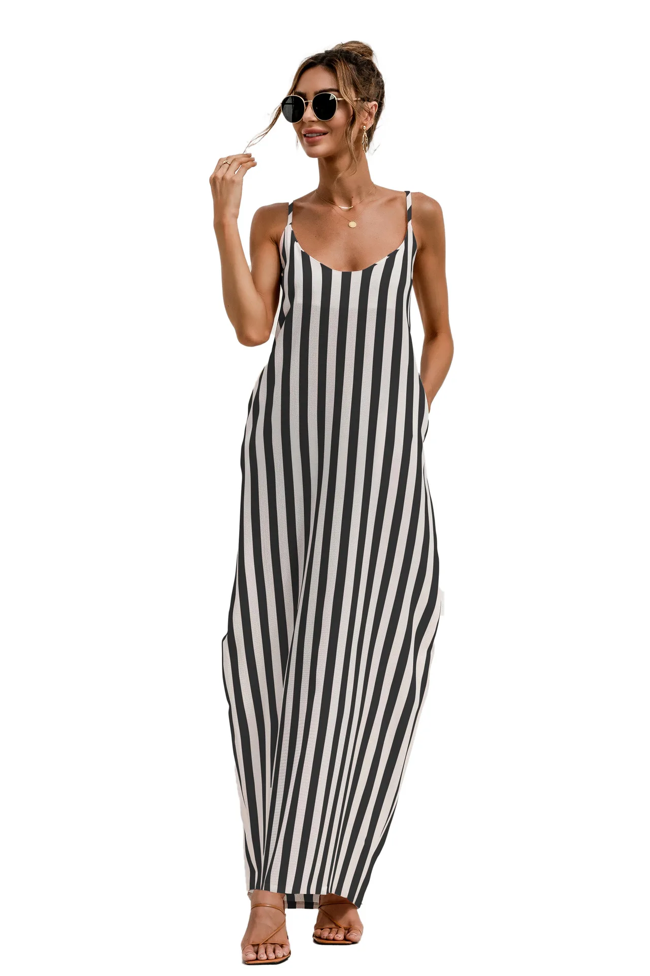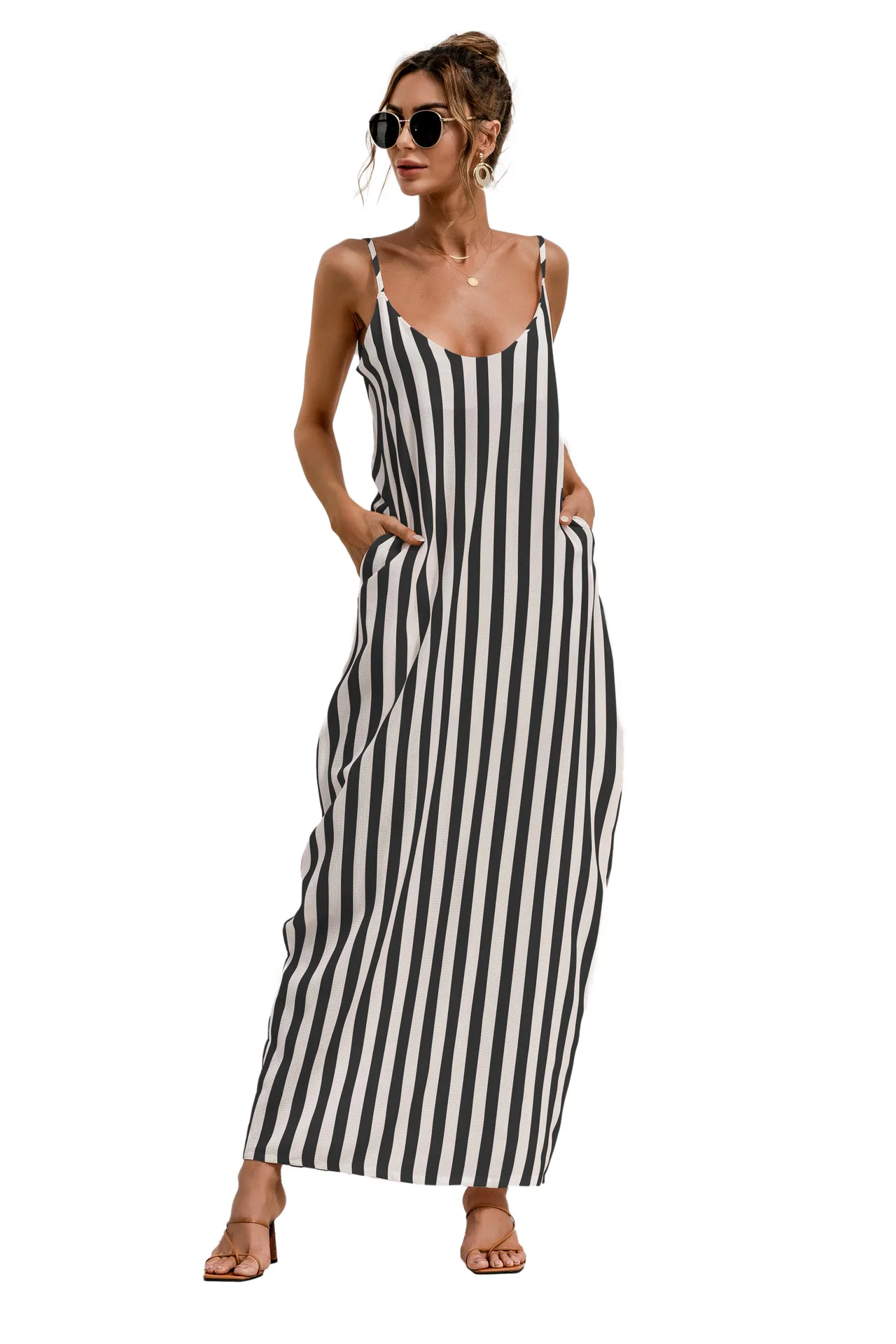 2021 Summer New Women's Fashion Sexy Stripe V Neck Spaghetti Straps Sleeveless Backless Loose Waist Pockets Ankle Lenght Dress