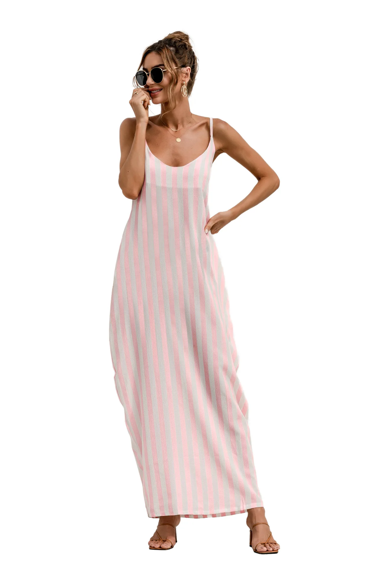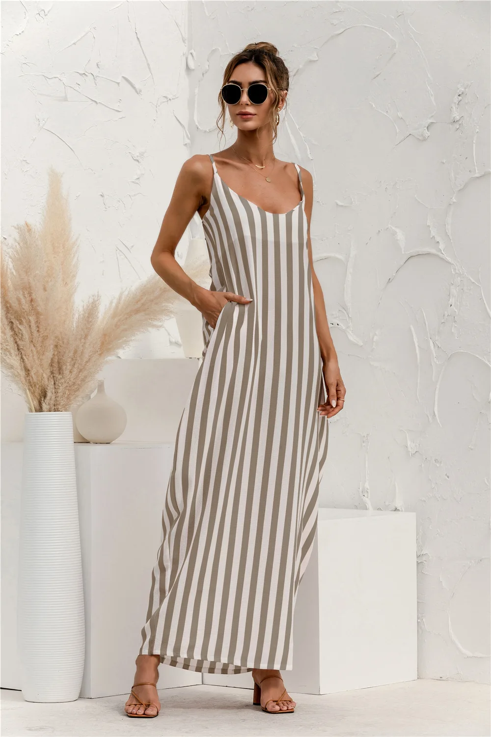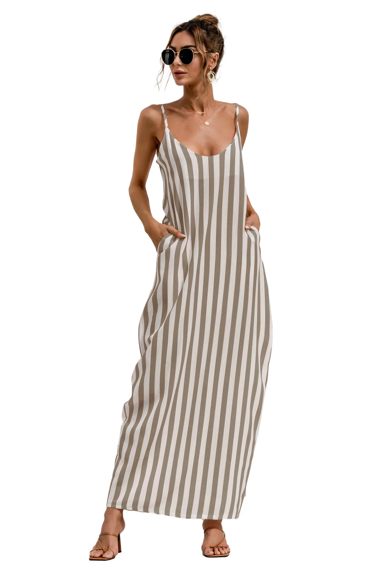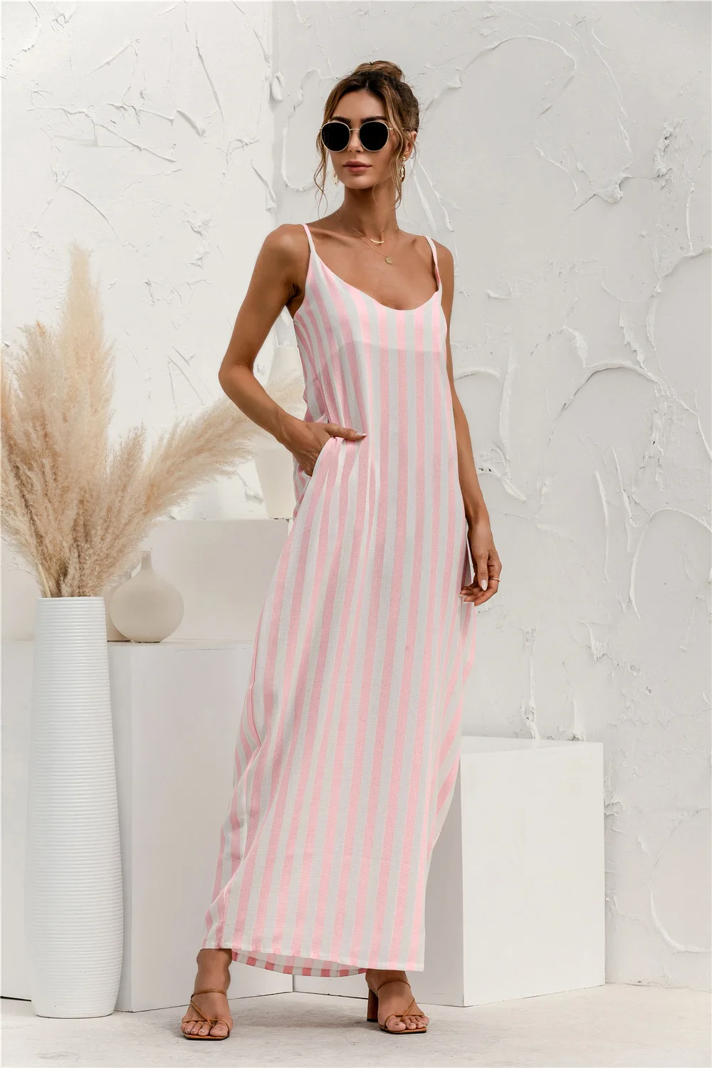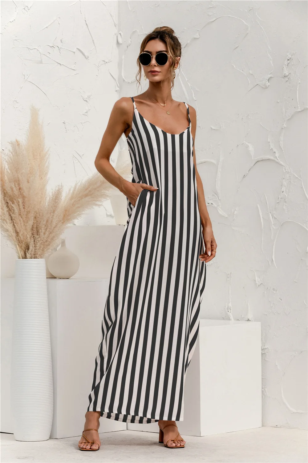 2021 Summer New Women's Fashion Sexy Stripe V Neck Spaghetti Straps Sleeveless Backless Loose Waist Pockets Ankle Lenght Dress