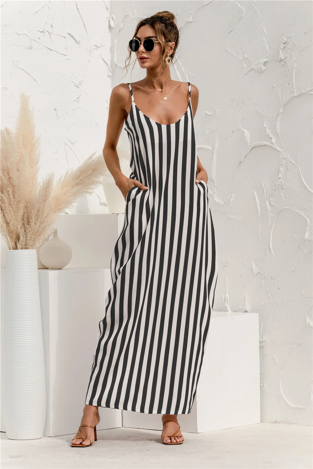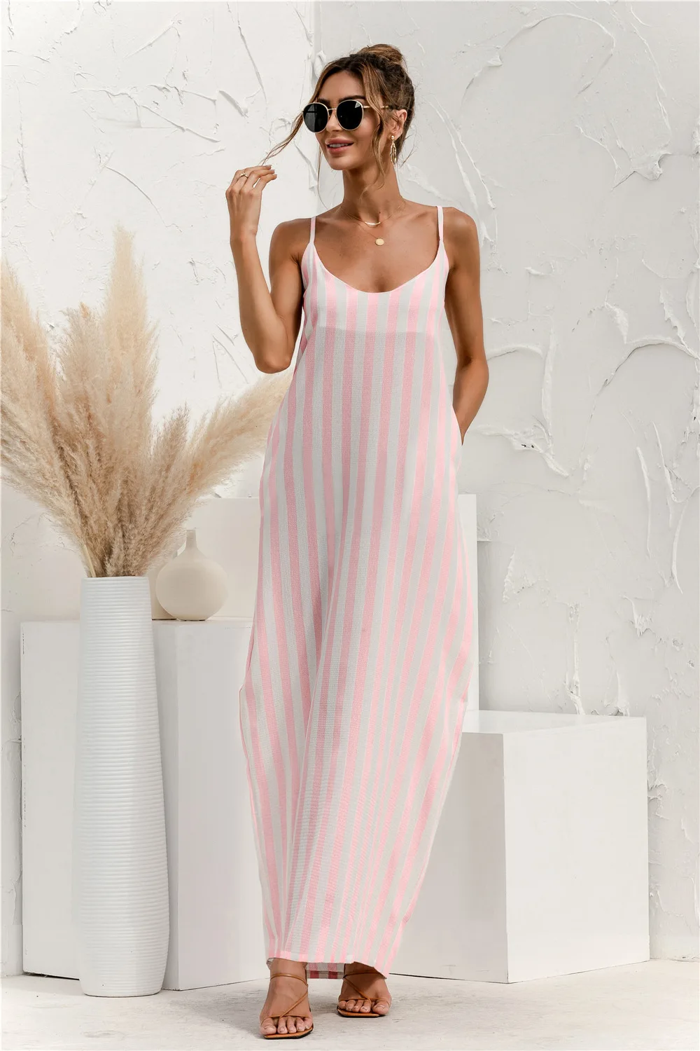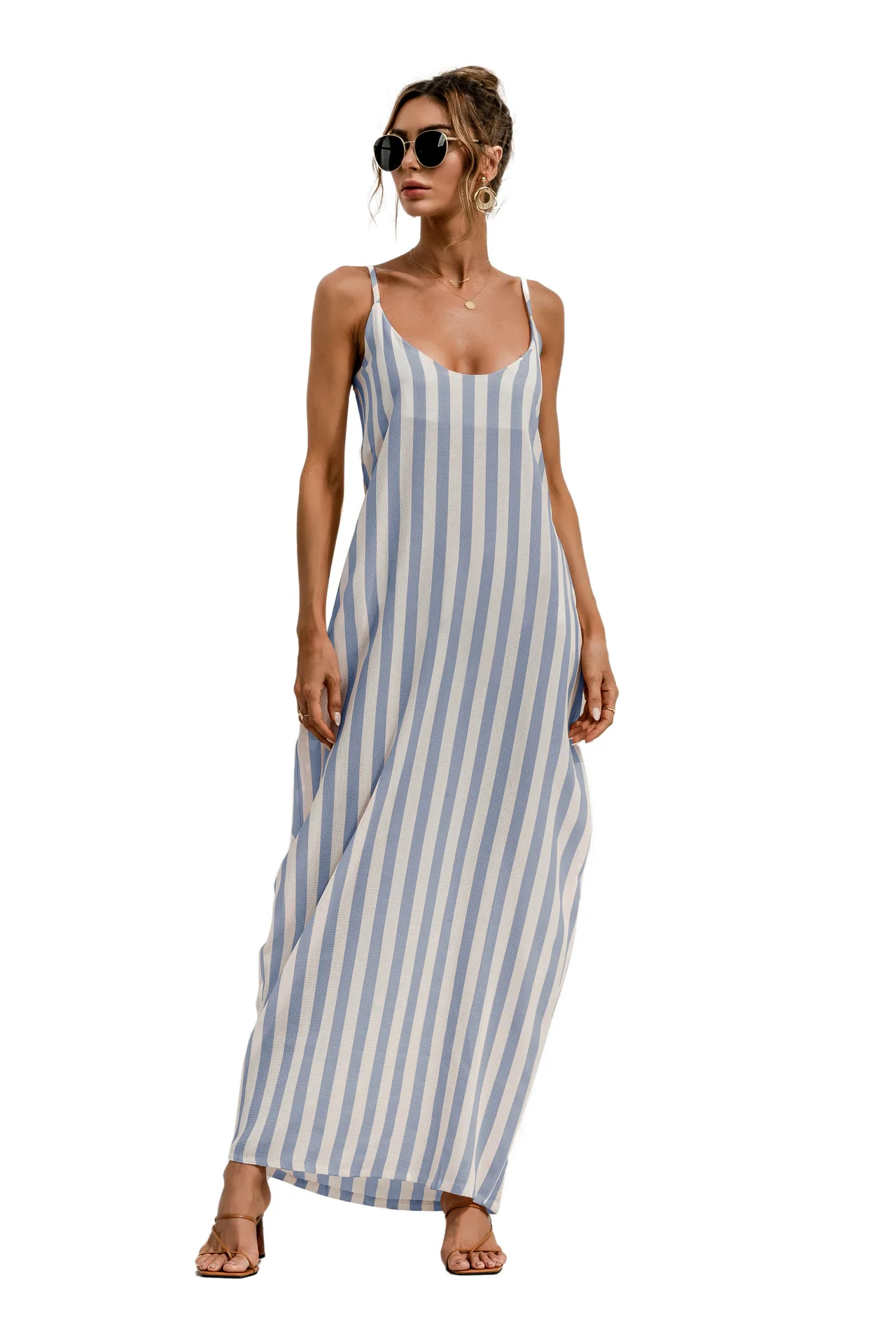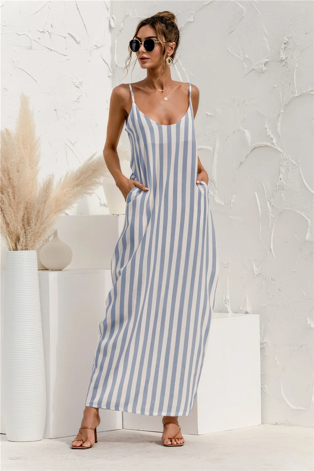 2021 Summer New Women's Fashion Sexy Stripe V Neck Spaghetti Straps Sleeveless Backless Loose Waist Pockets Ankle Lenght Dress