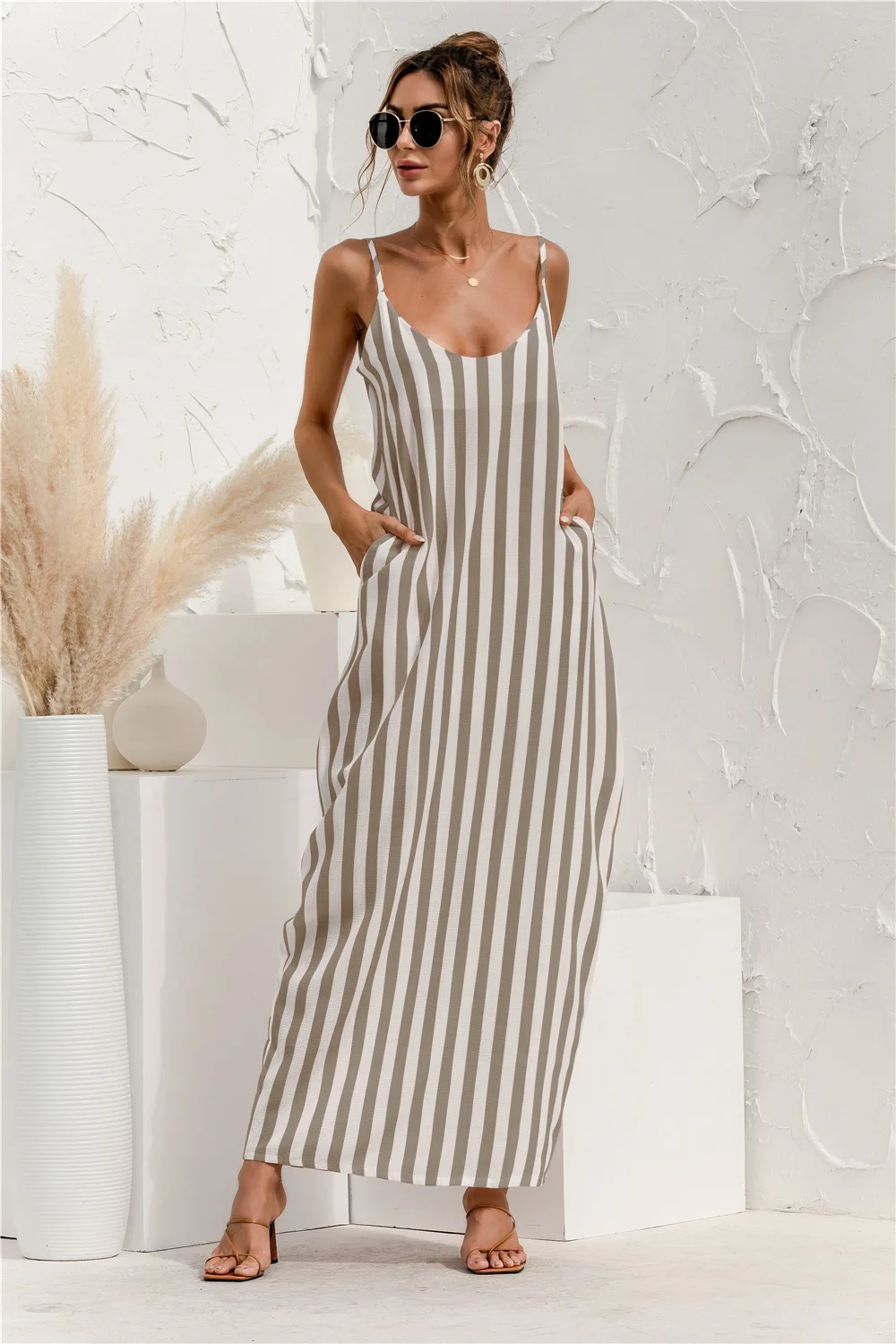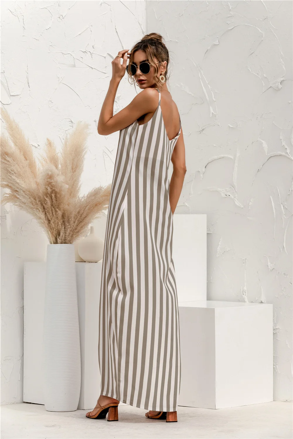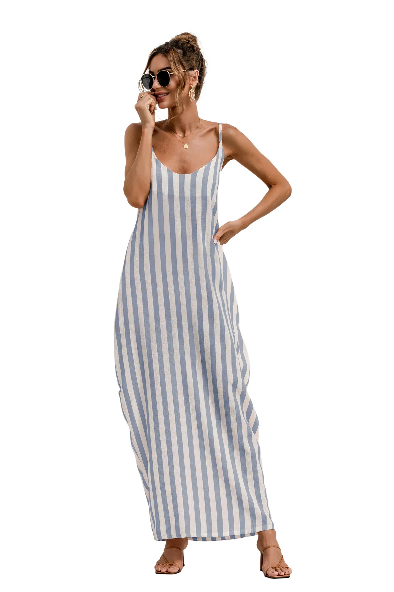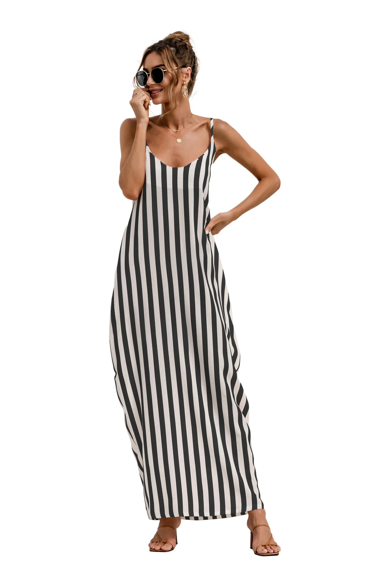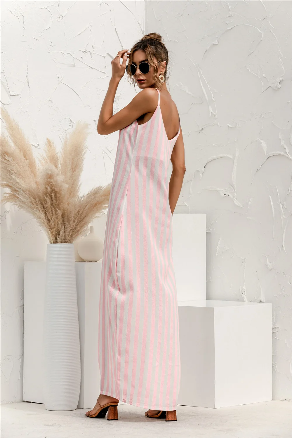 2021 Summer New Women's Fashion Sexy Stripe V Neck Spaghetti Straps Sleeveless Backless Loose Waist Pockets Ankle Lenght Dress