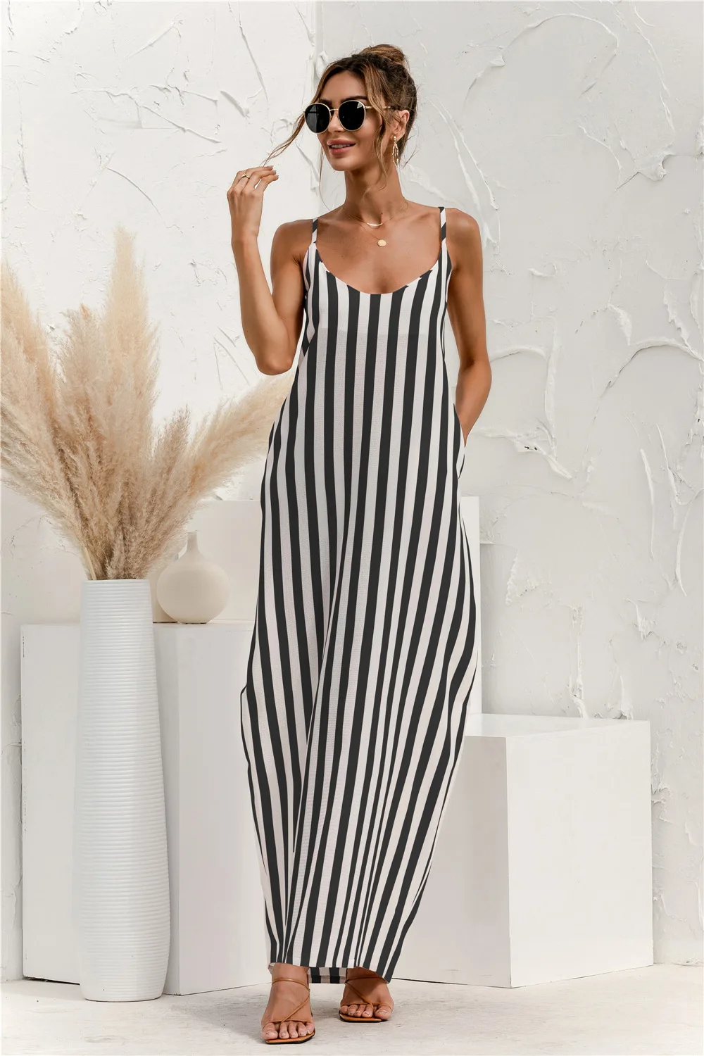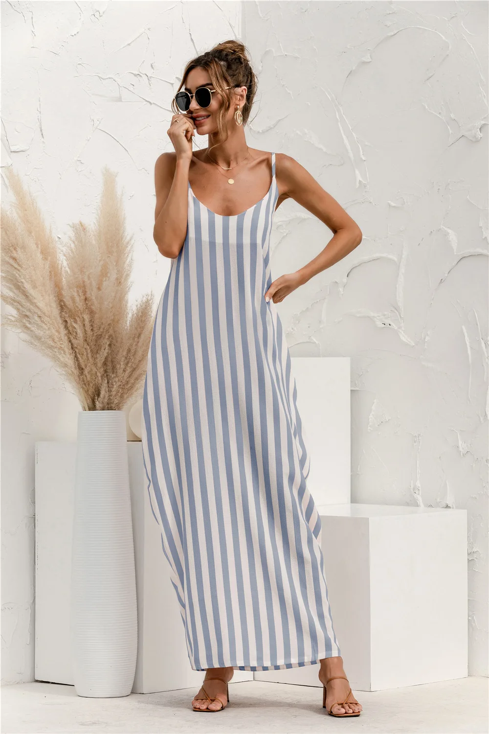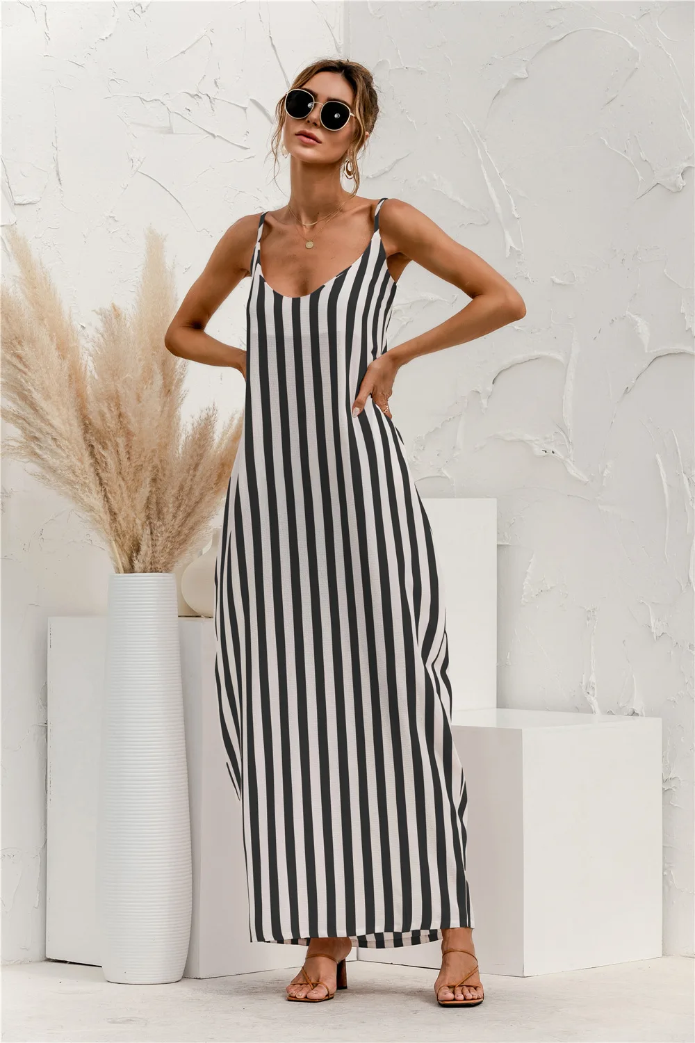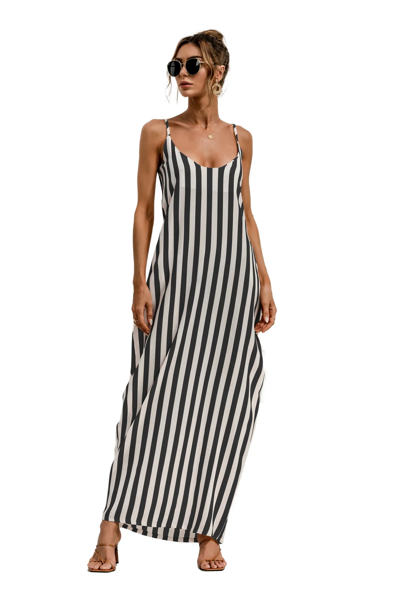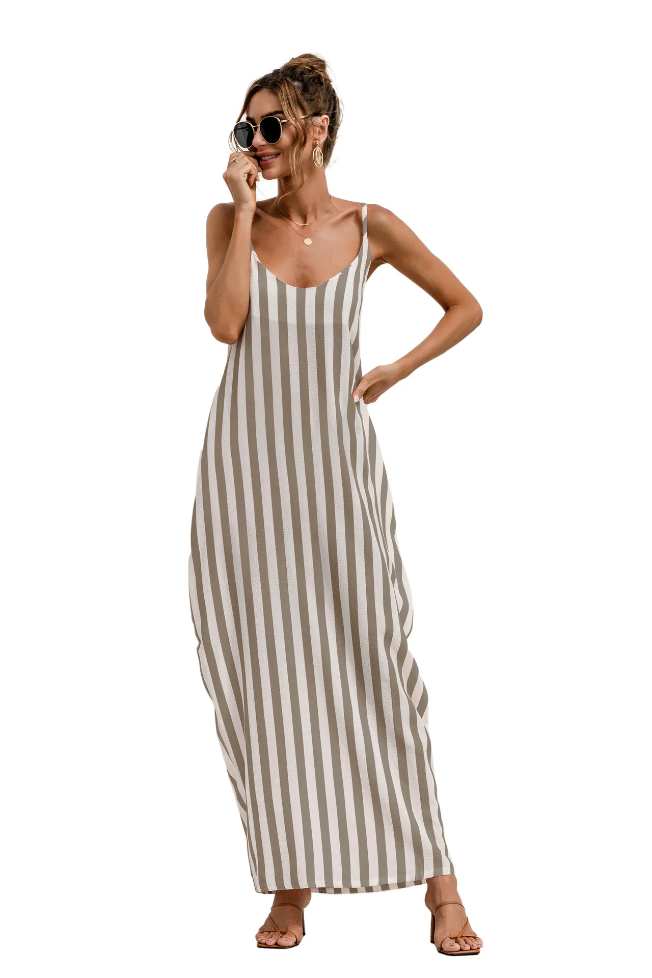 2021 Summer New Women's Fashion Sexy Stripe V Neck Spaghetti Straps Sleeveless Backless Loose Waist Pockets Ankle Lenght Dress