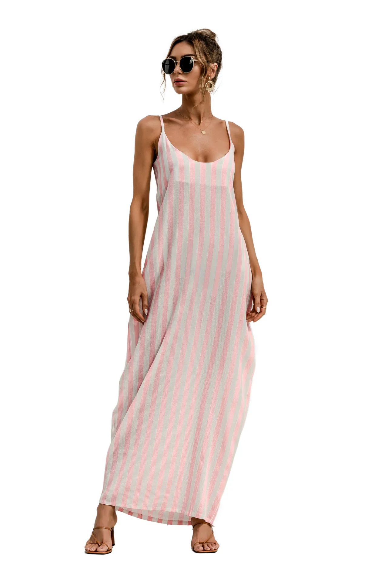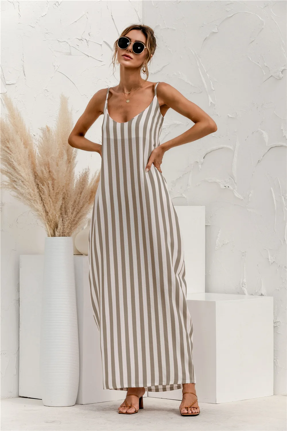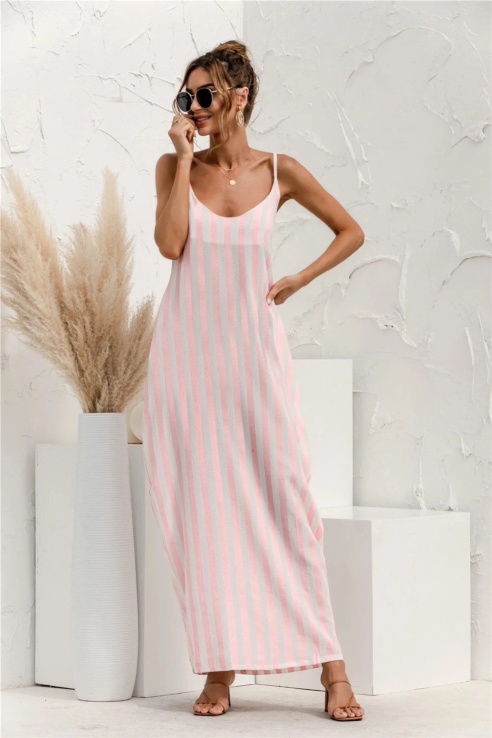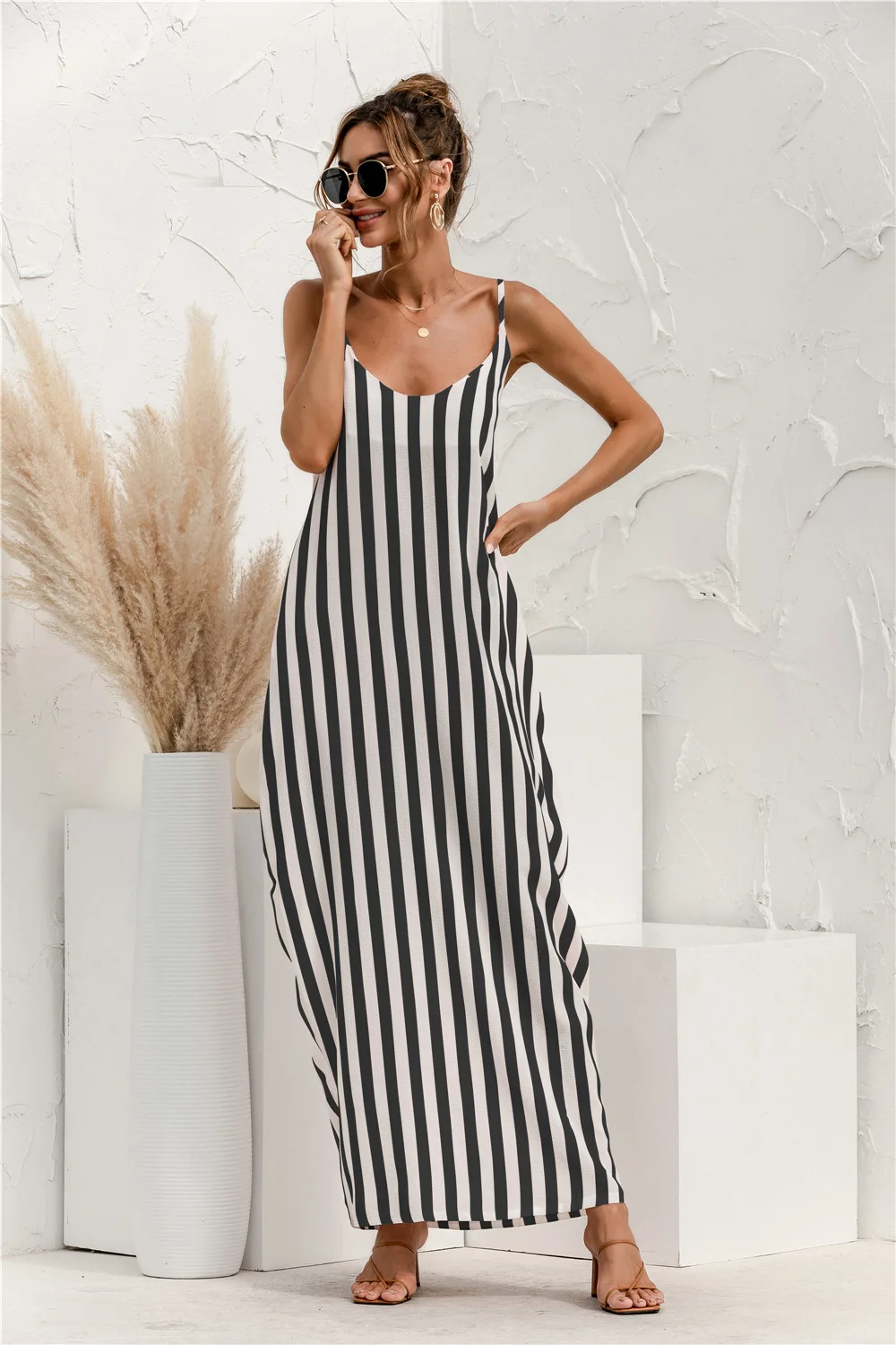 2021 Summer New Women's Fashion Sexy Stripe V Neck Spaghetti Straps Sleeveless Backless Loose Waist Pockets Ankle Lenght Dress