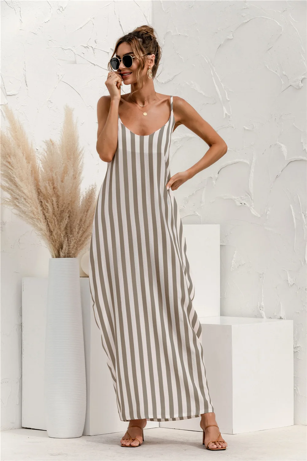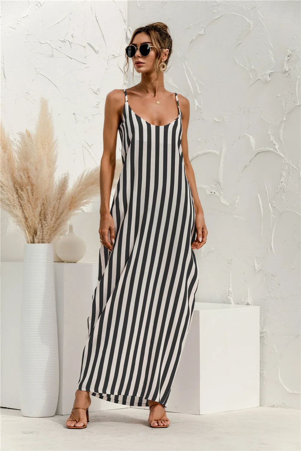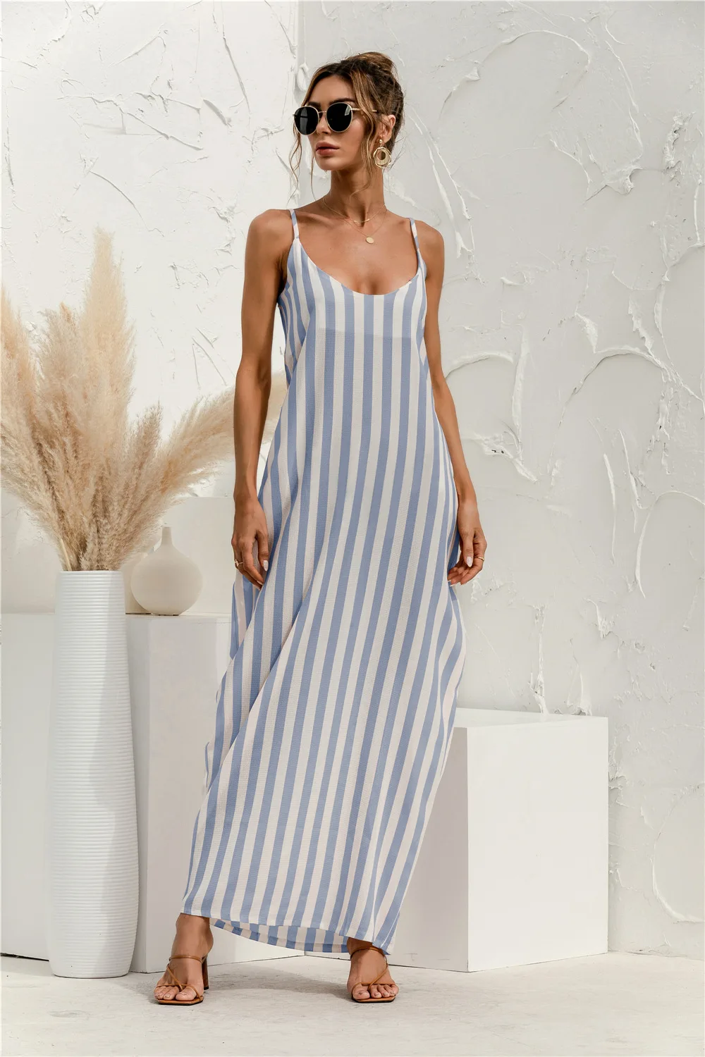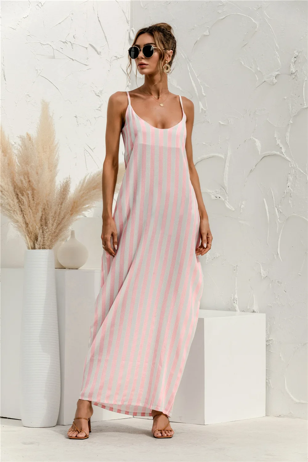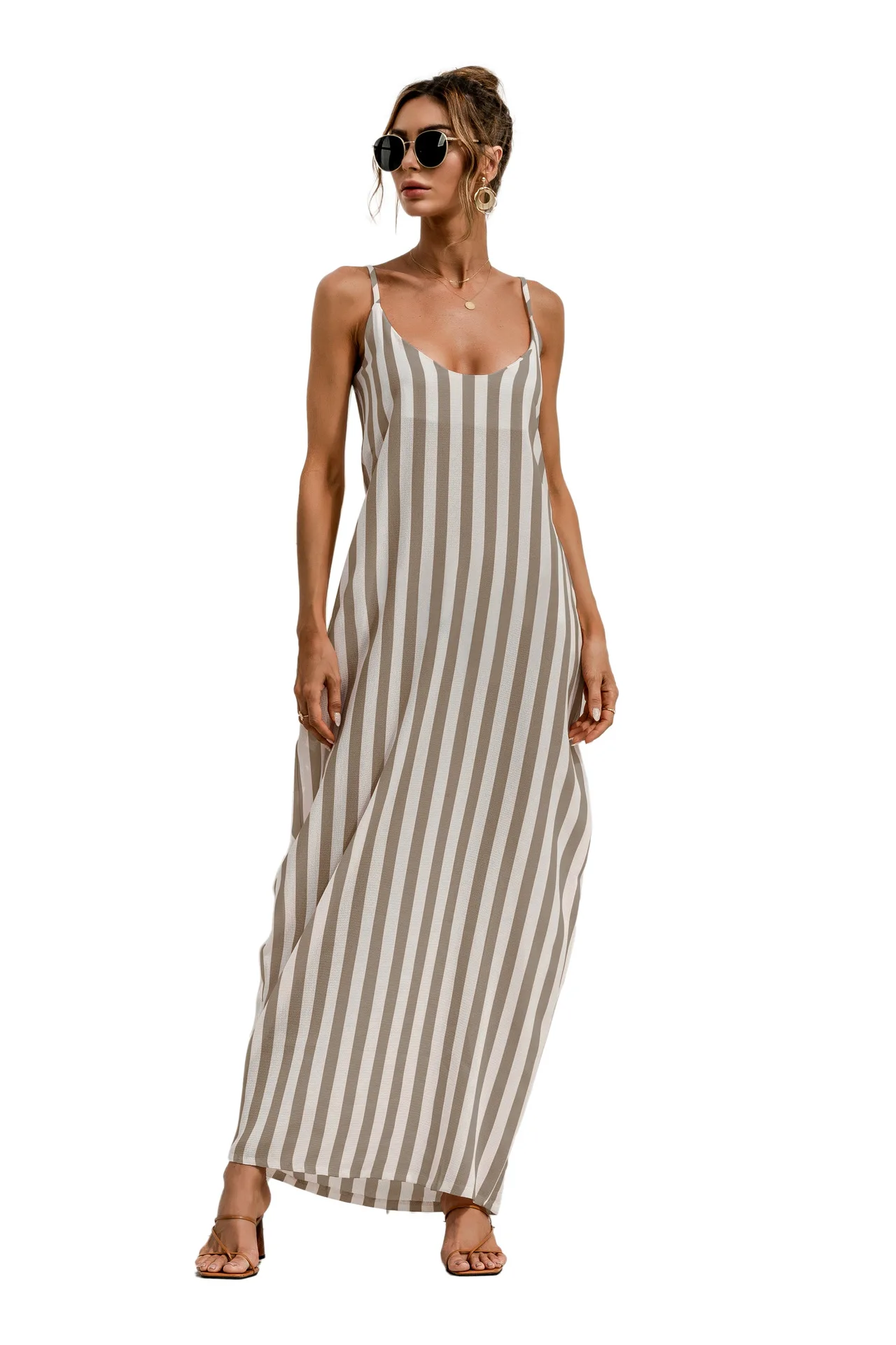 2021 Summer New Women's Fashion Sexy Stripe V Neck Spaghetti Straps Sleeveless Backless Loose Waist Pockets Ankle Lenght Dress