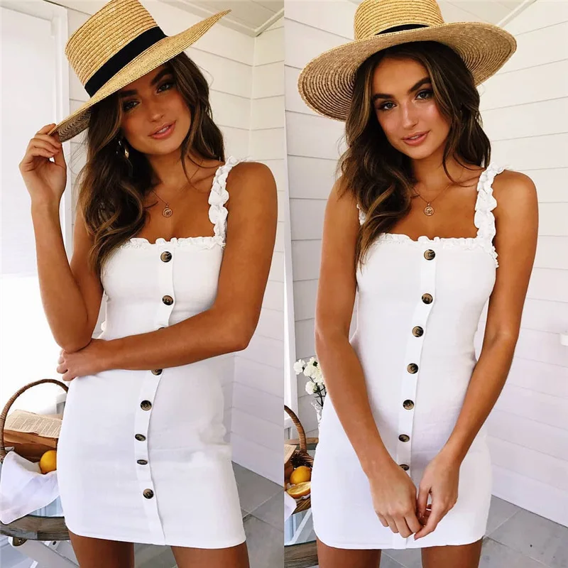 2021 Summer New Women's Fashion Solid Sexy Slash Neck Spaghetti Straps Sleeveless Backless Buttons Package Hip Mini Dress Ladies