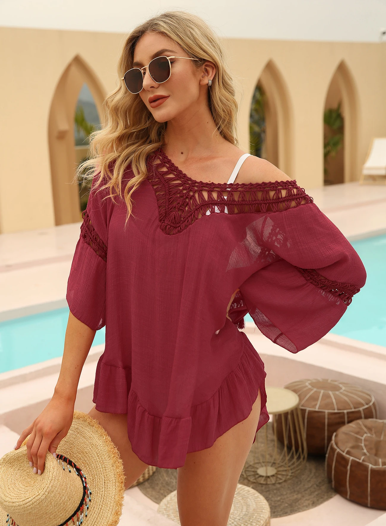 2021 Summer New Women's Hand Hook Hollow Stitching Ruffled Quarter Sleeve Irregular Beach Skirt Blouse