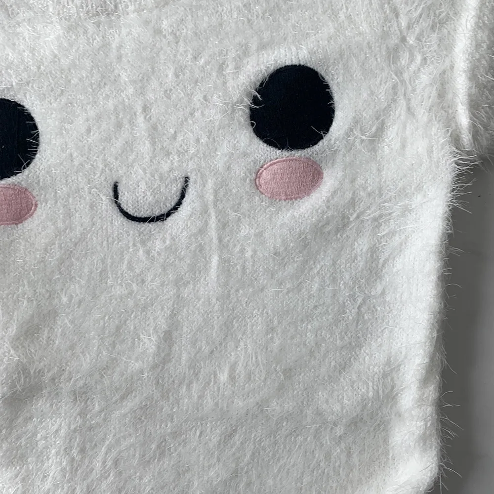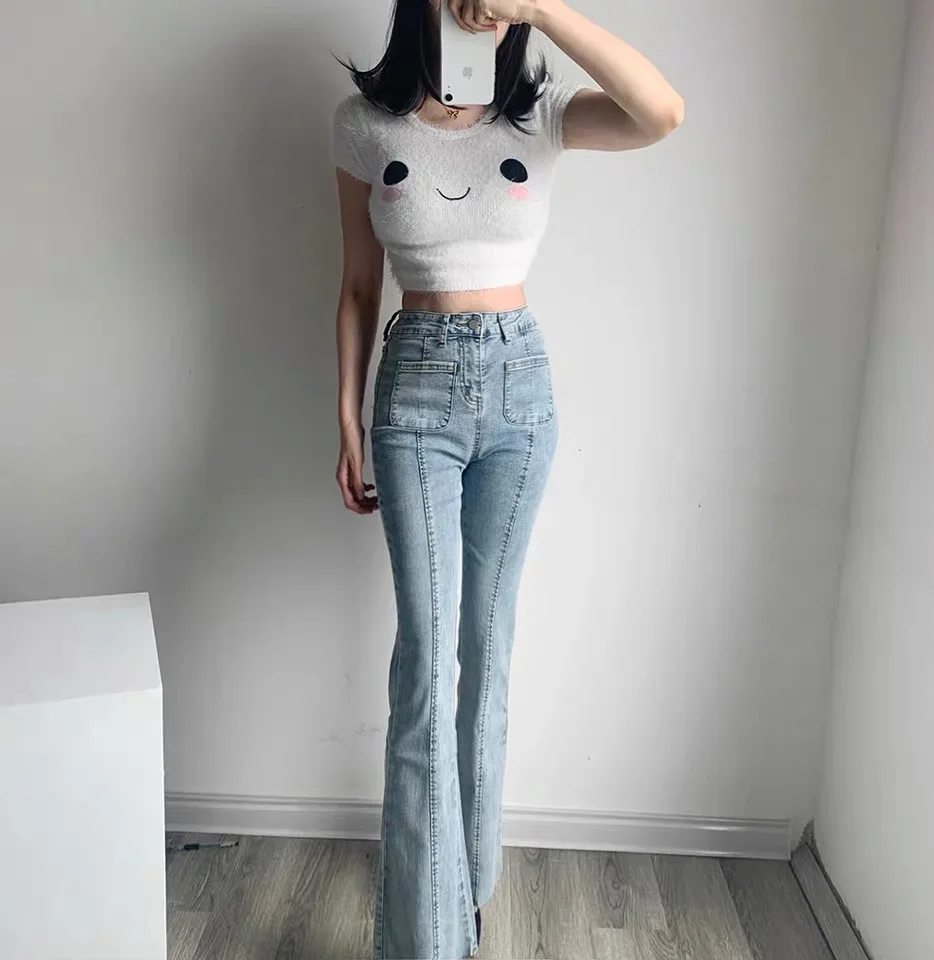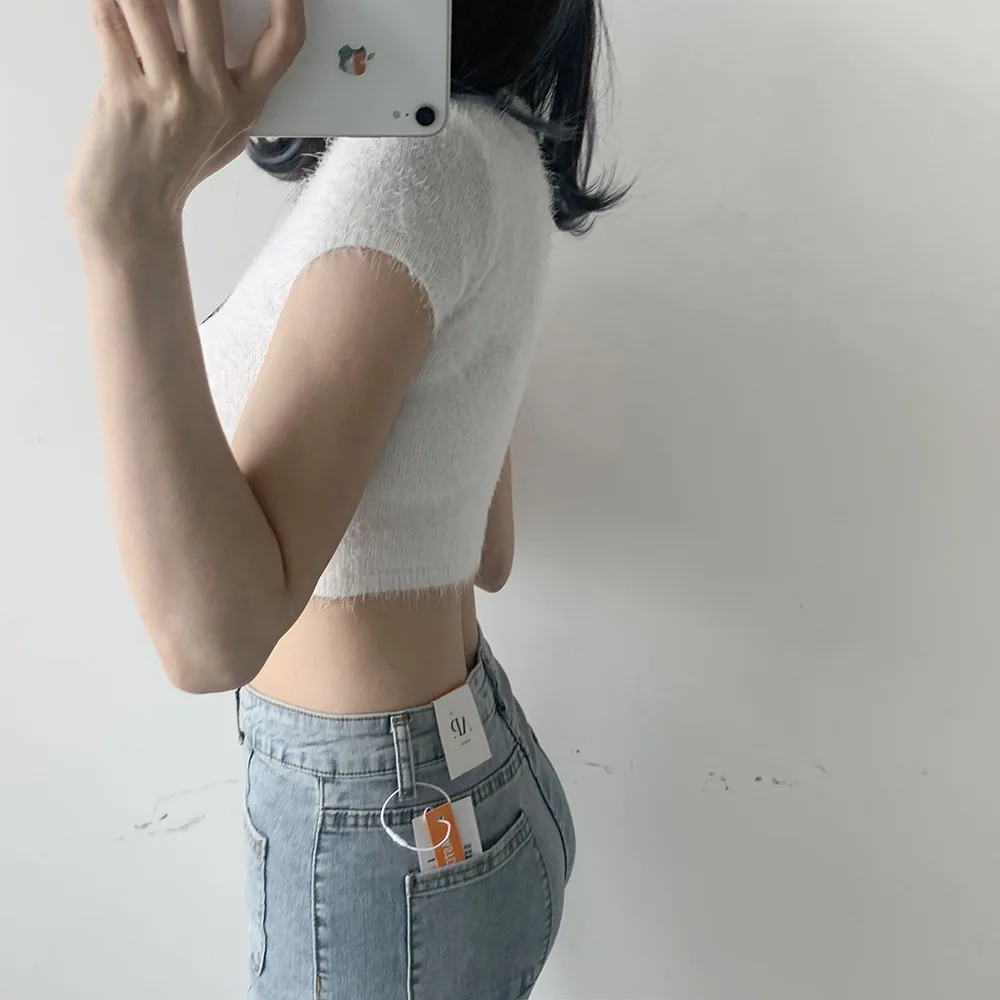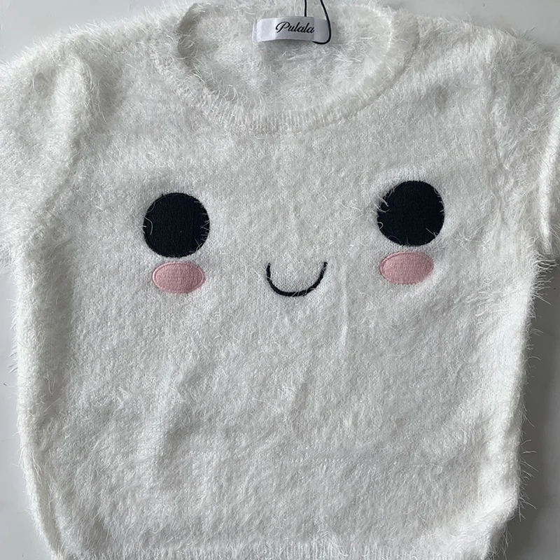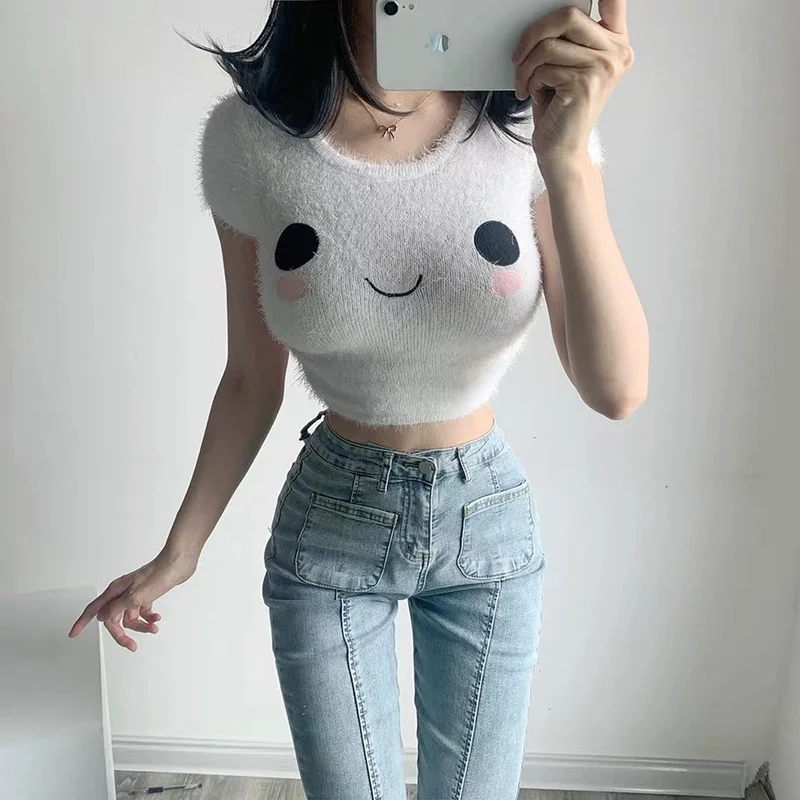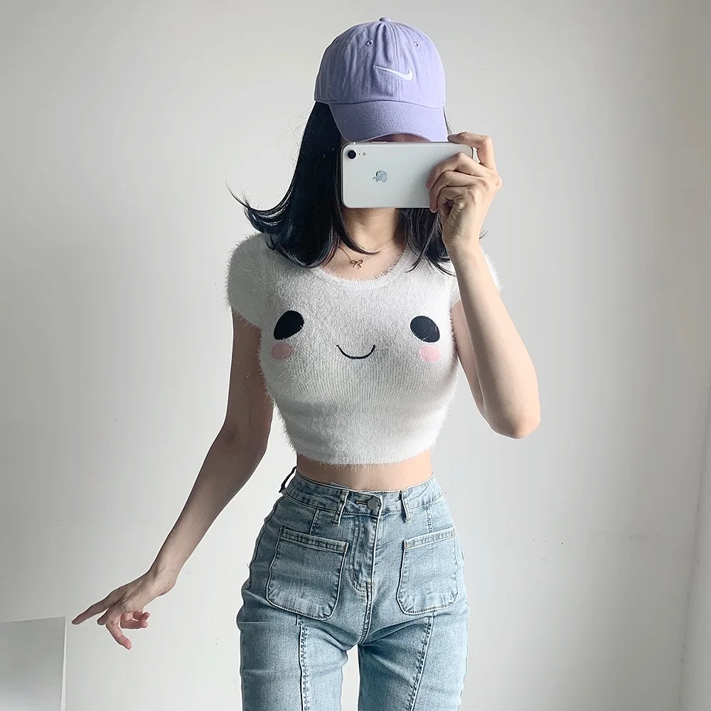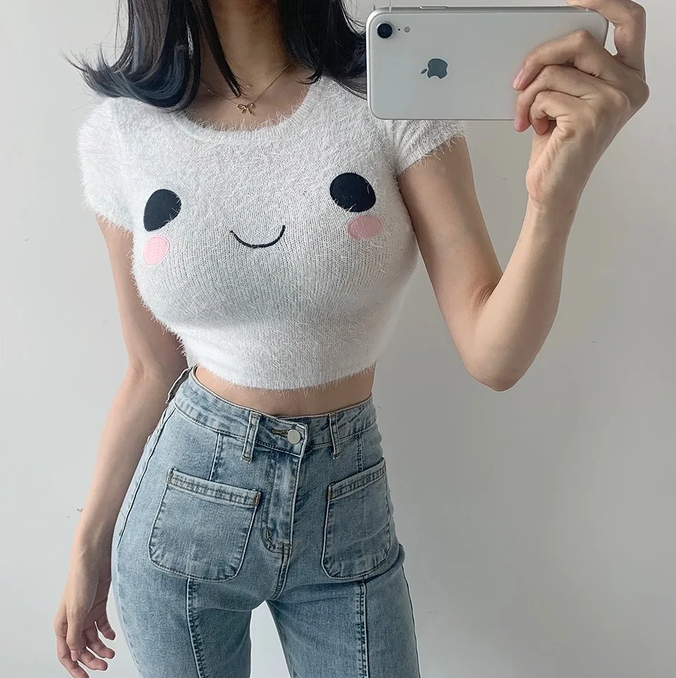 2021 Summer Short Sleeve Short Crop Top Slim Round Neck Furry Kawaii Smiling Face White Top Fashion Casual Expression Clothes