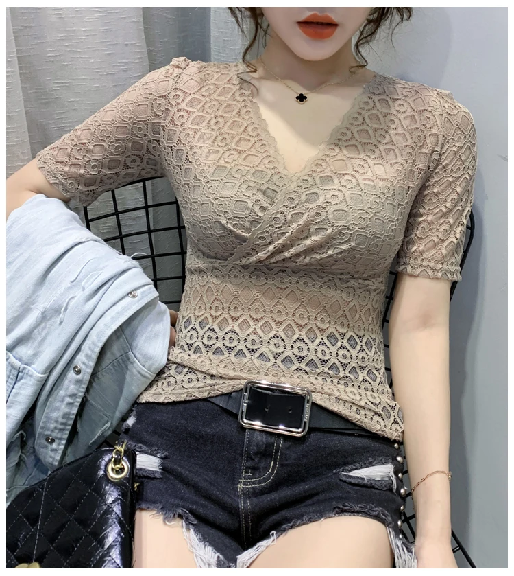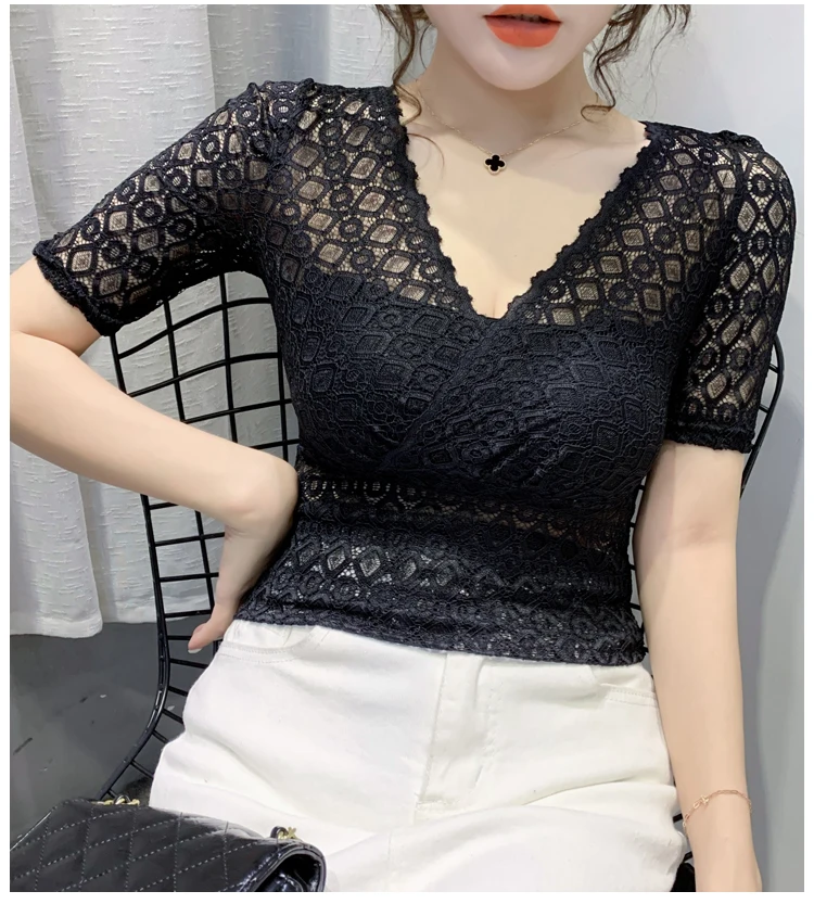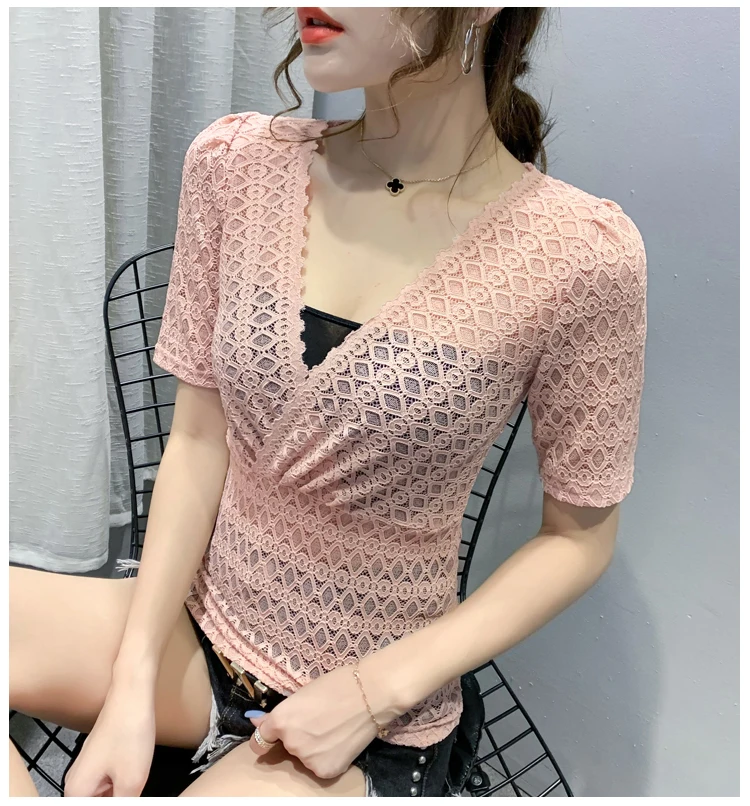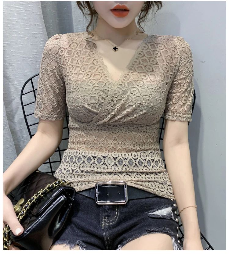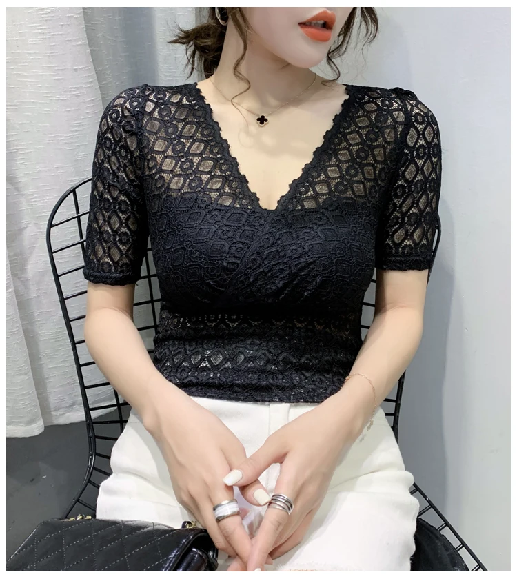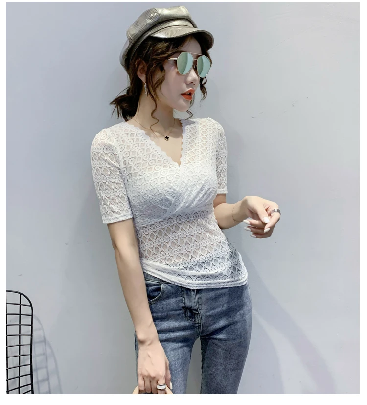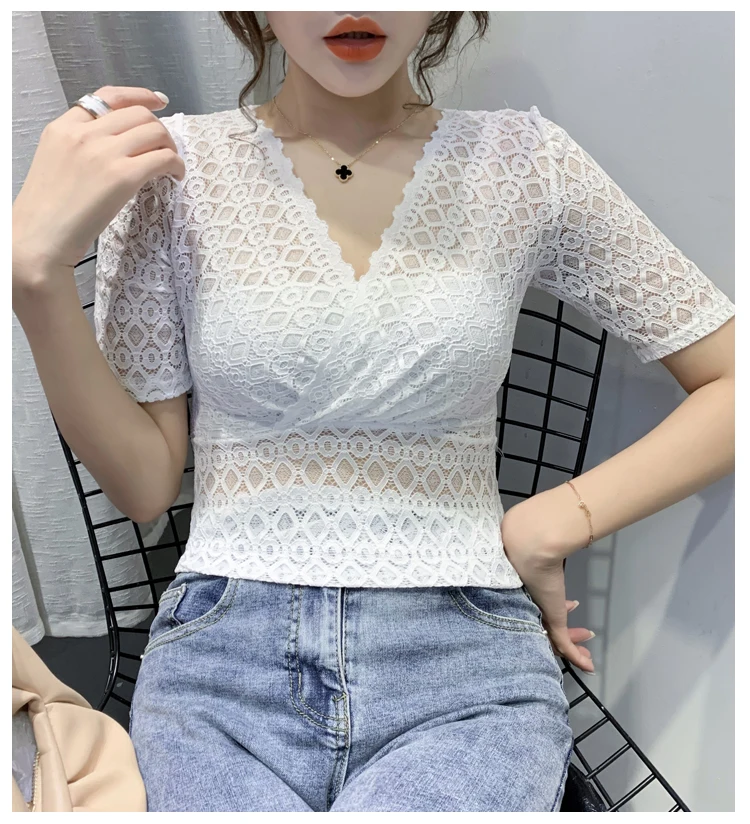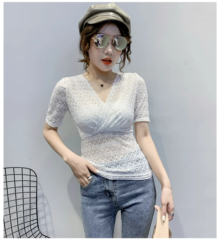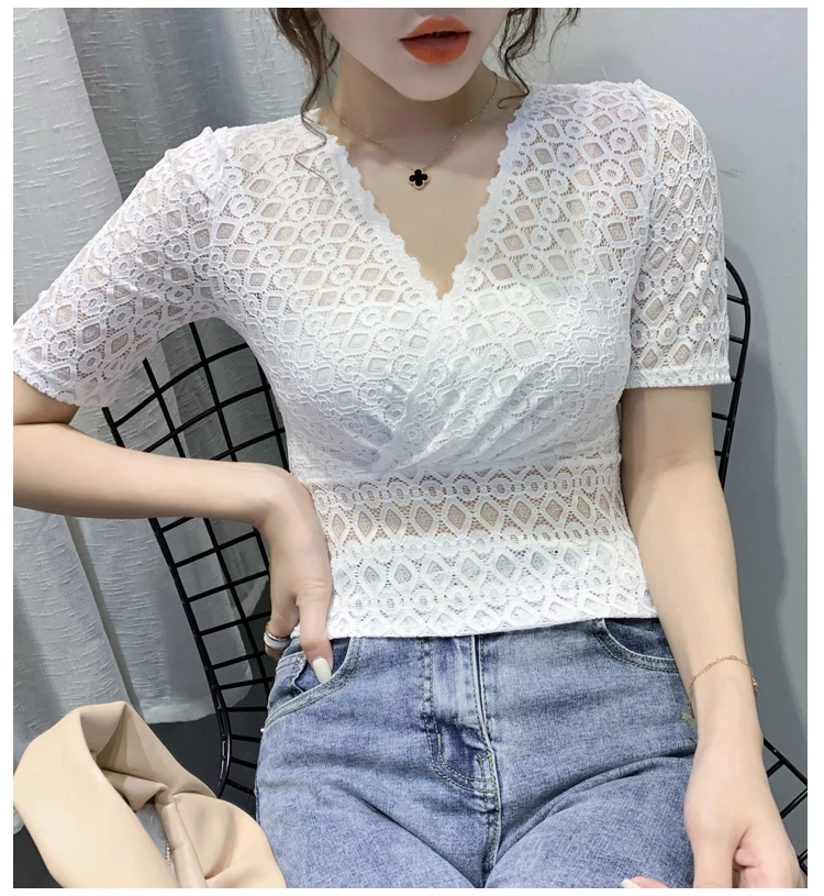 2021 Summer Short Sleeve V-Neck Lace Tops Fashion Casual Hollow Out Women's T-Shirt Elegant Slim Female Blusas