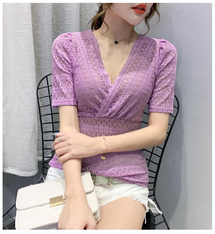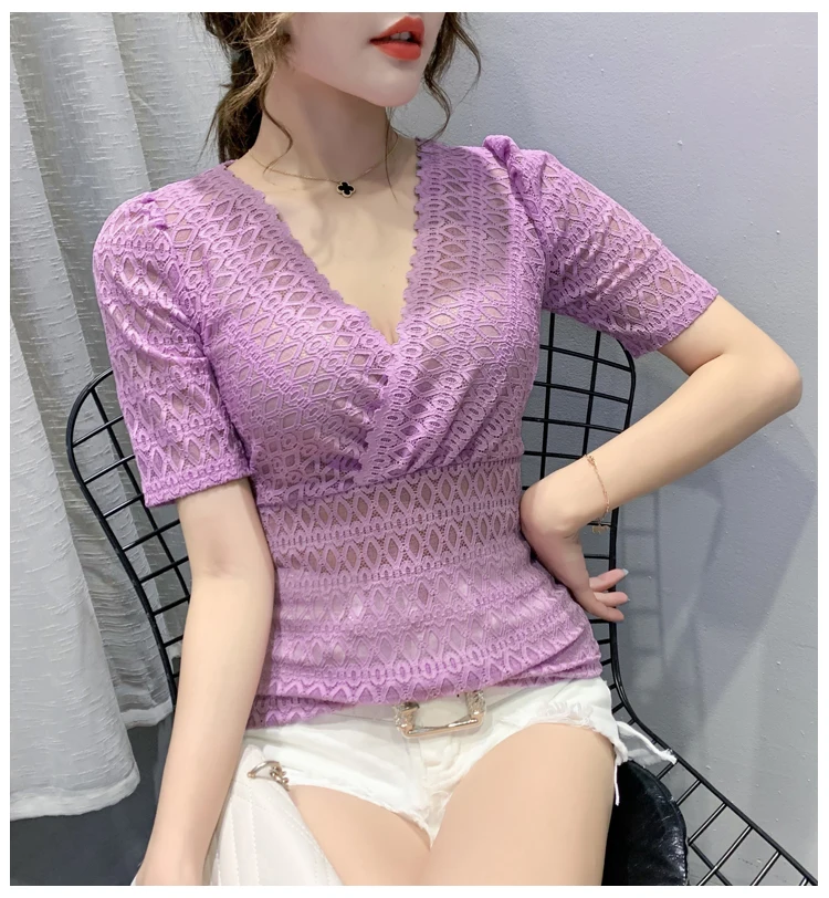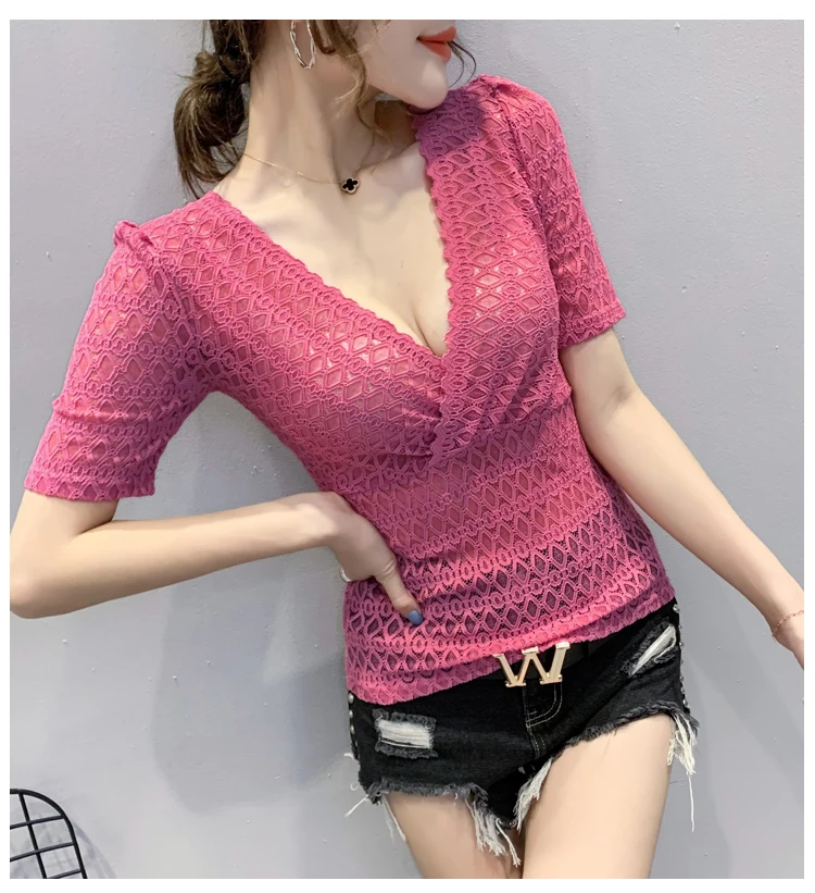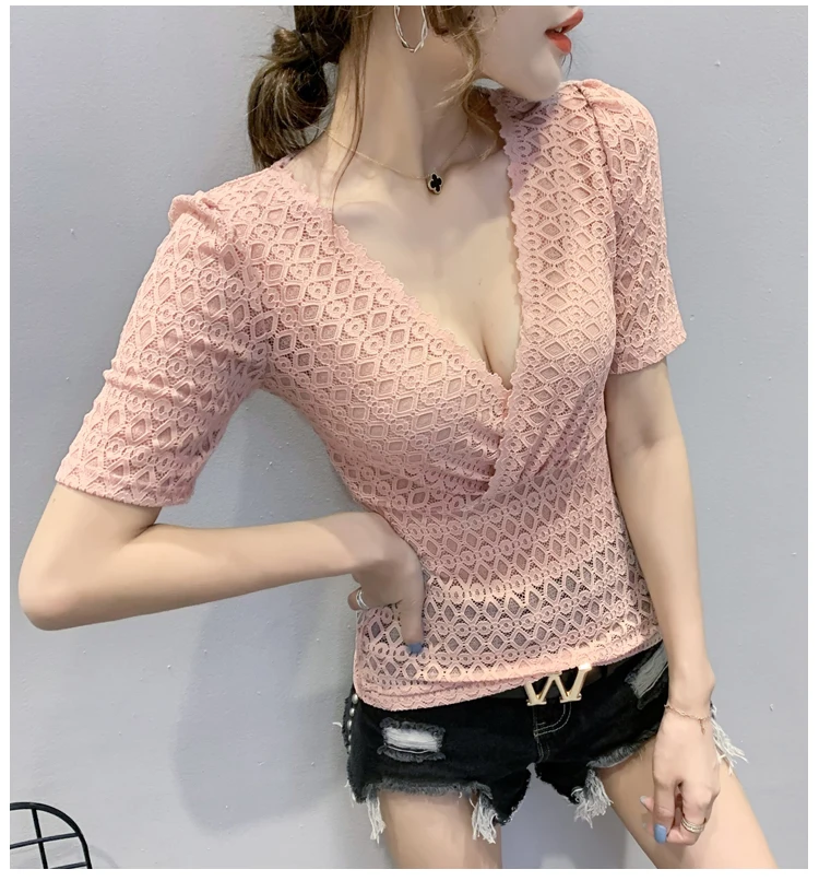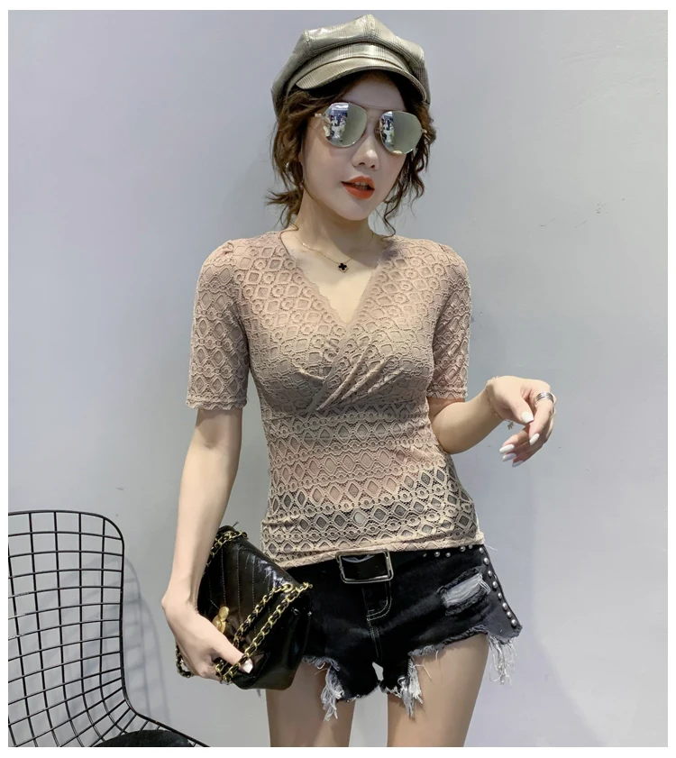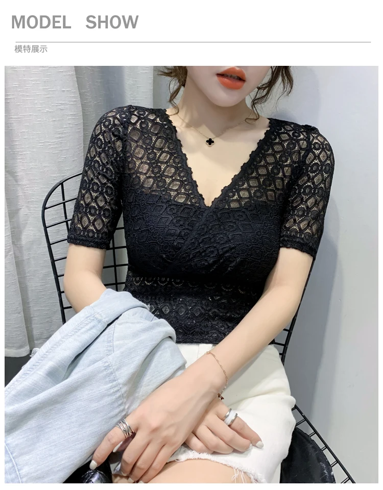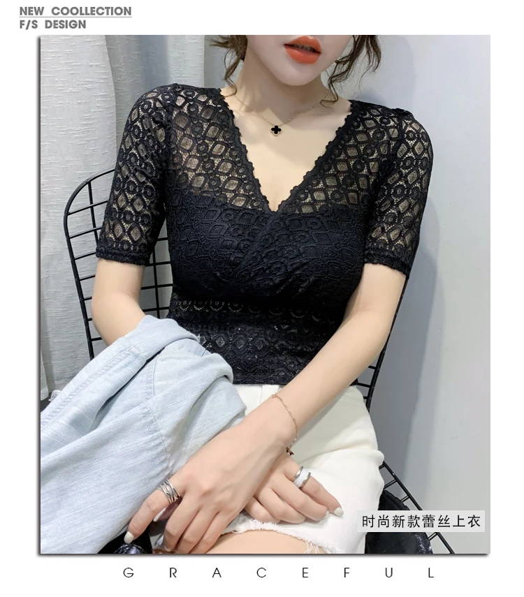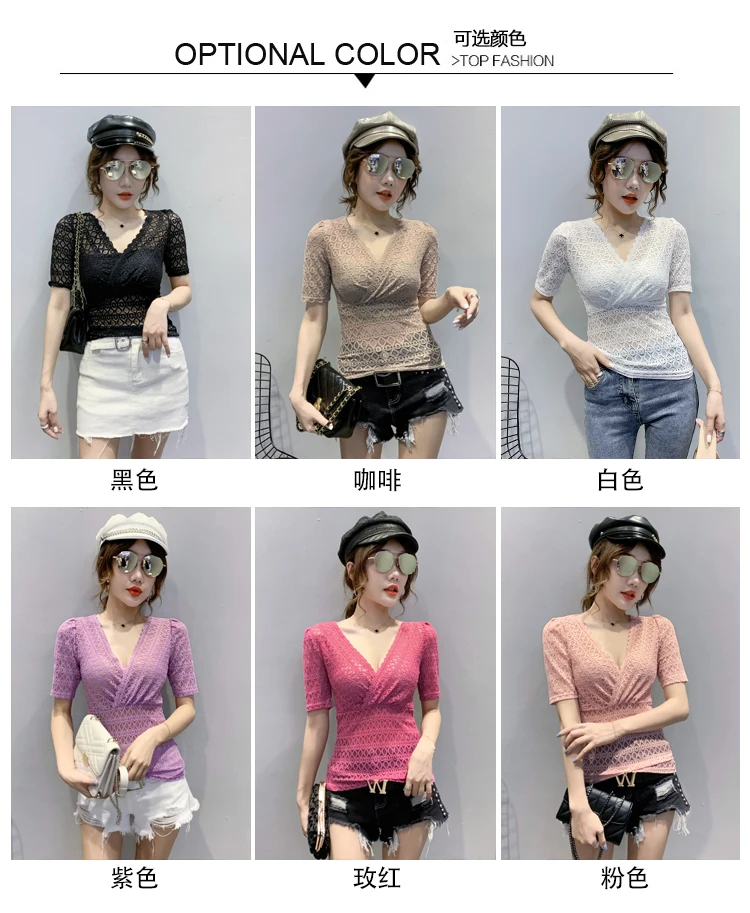 2021 Summer Short Sleeve V-Neck Lace Tops Fashion Casual Hollow Out Women's T-Shirt Elegant Slim Female Blusas