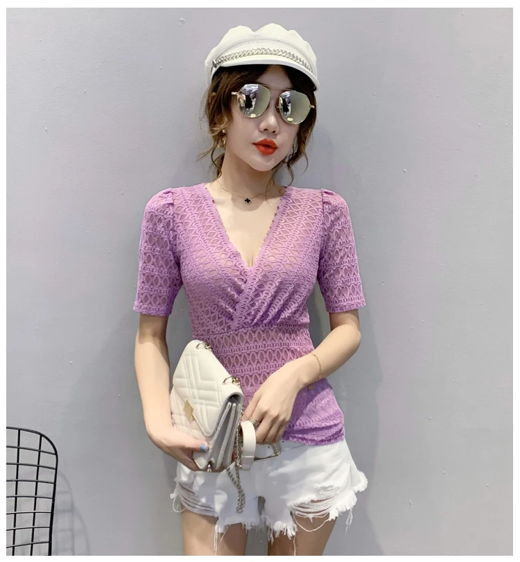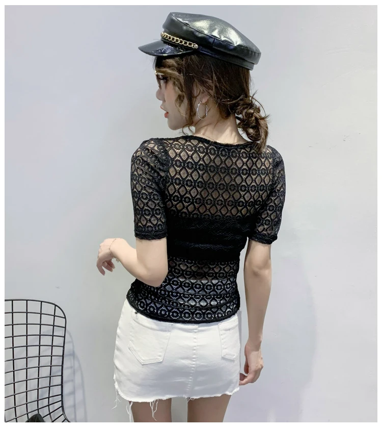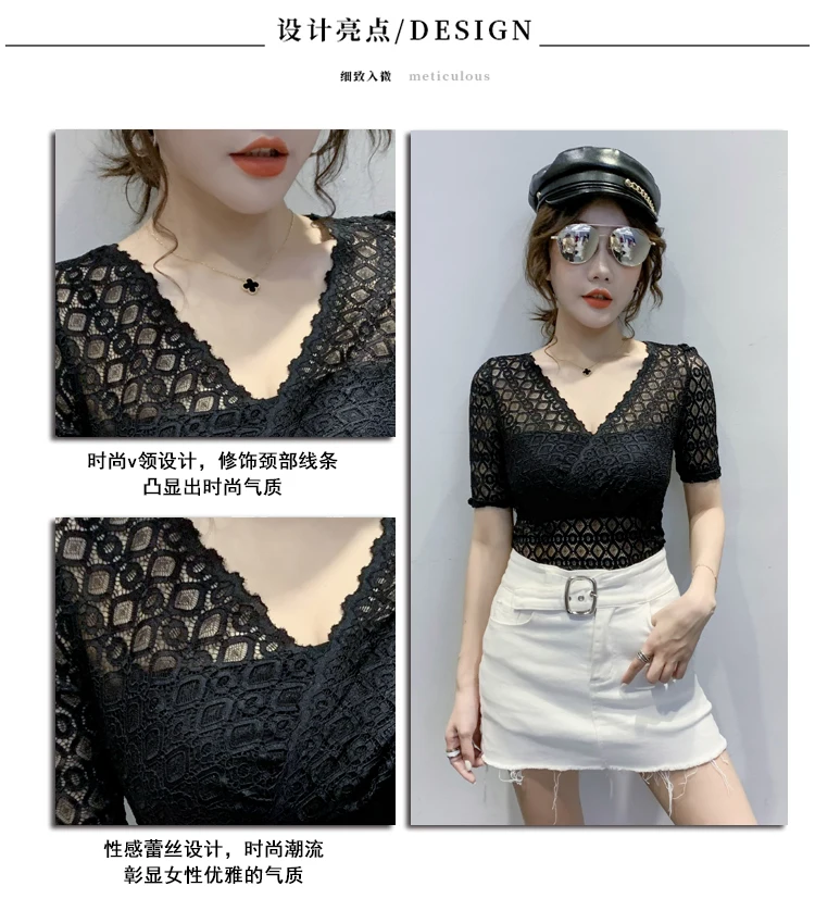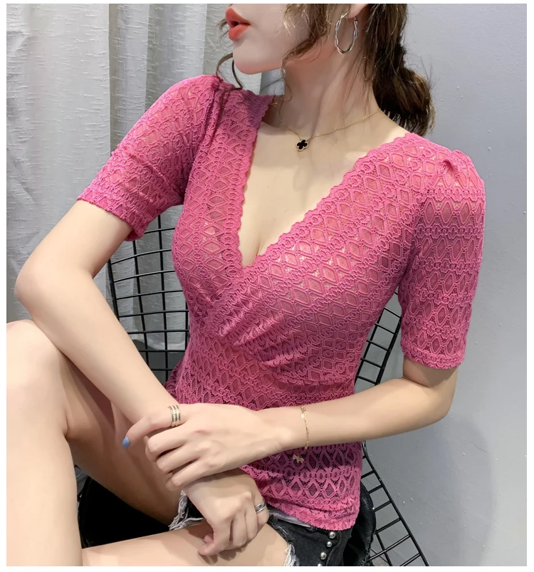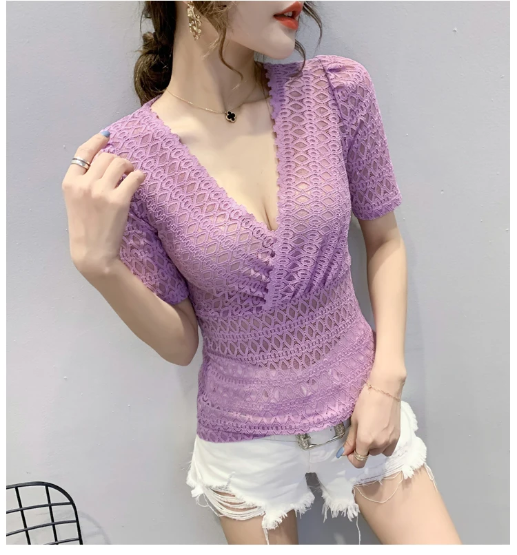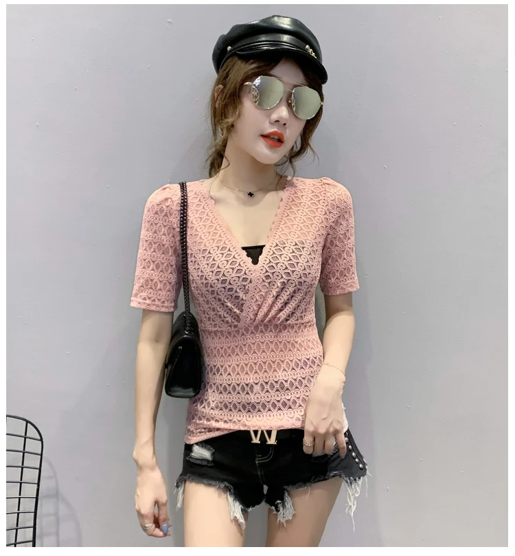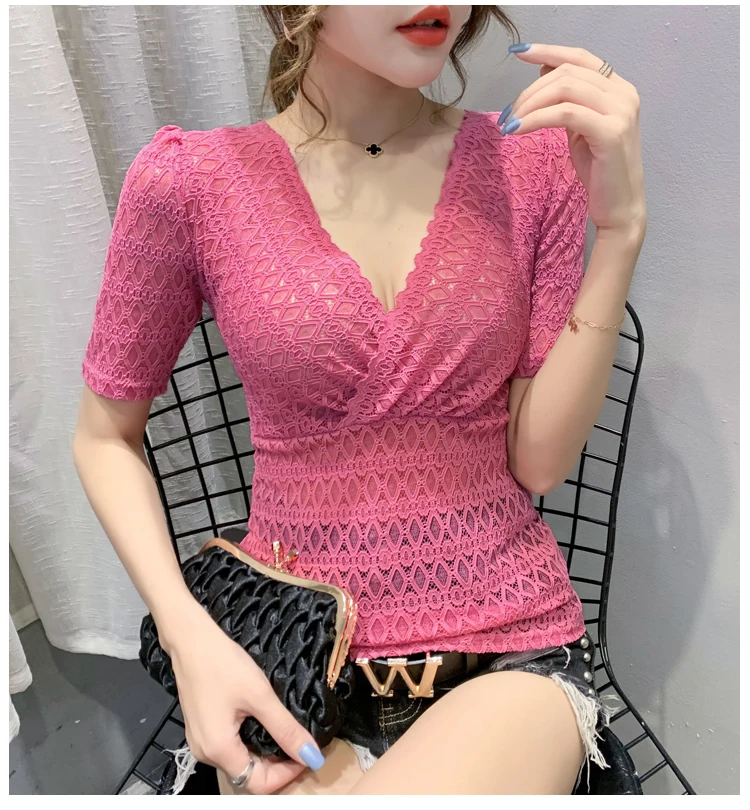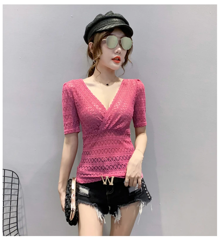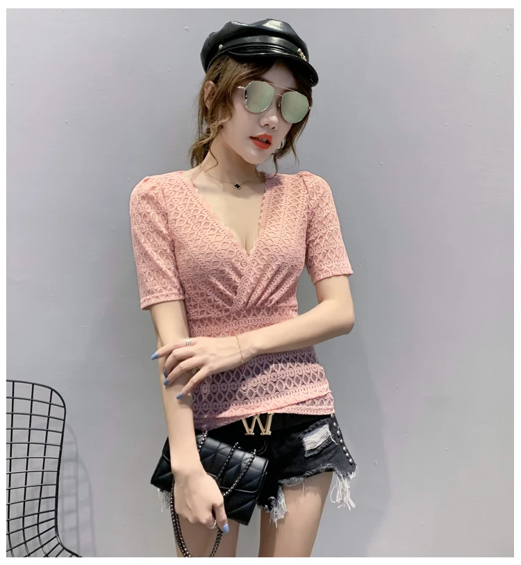 2021 Summer Short Sleeve V-Neck Lace Tops Fashion Casual Hollow Out Women's T-Shirt Elegant Slim Female Blusas
