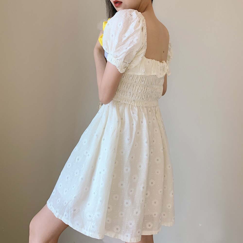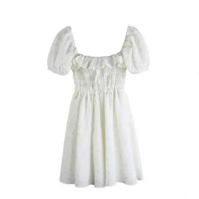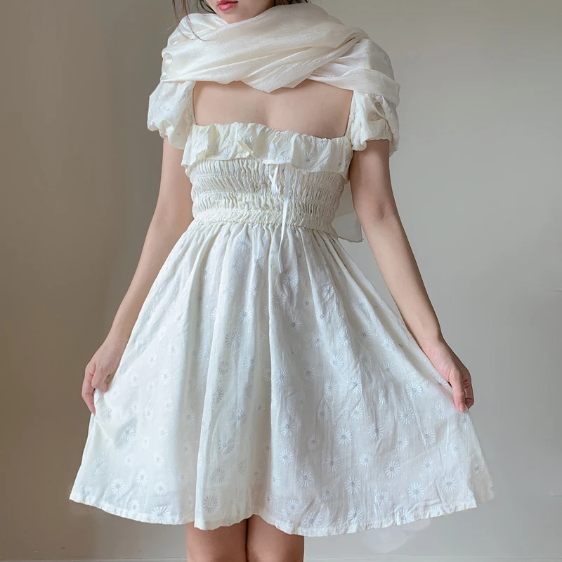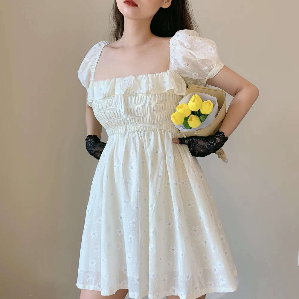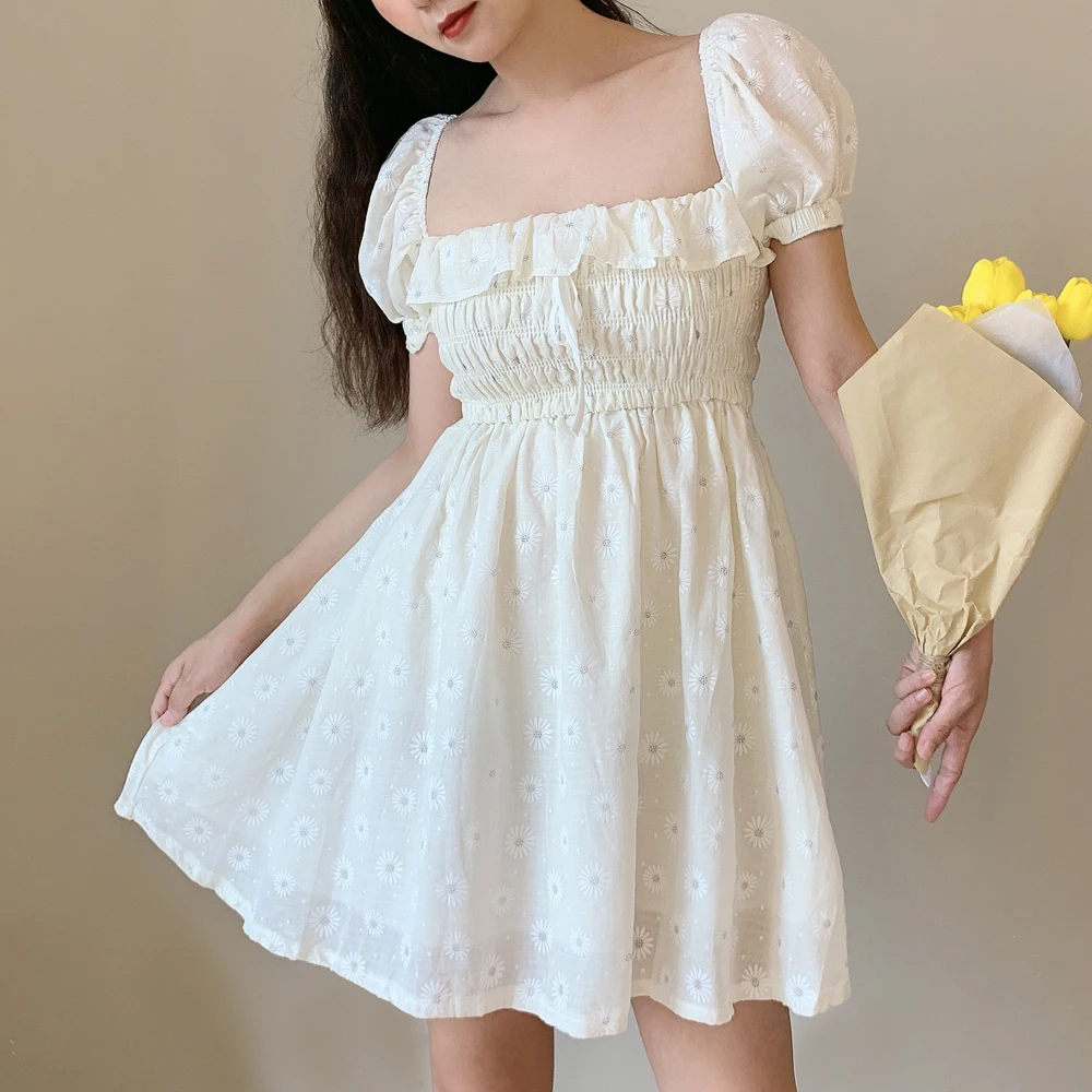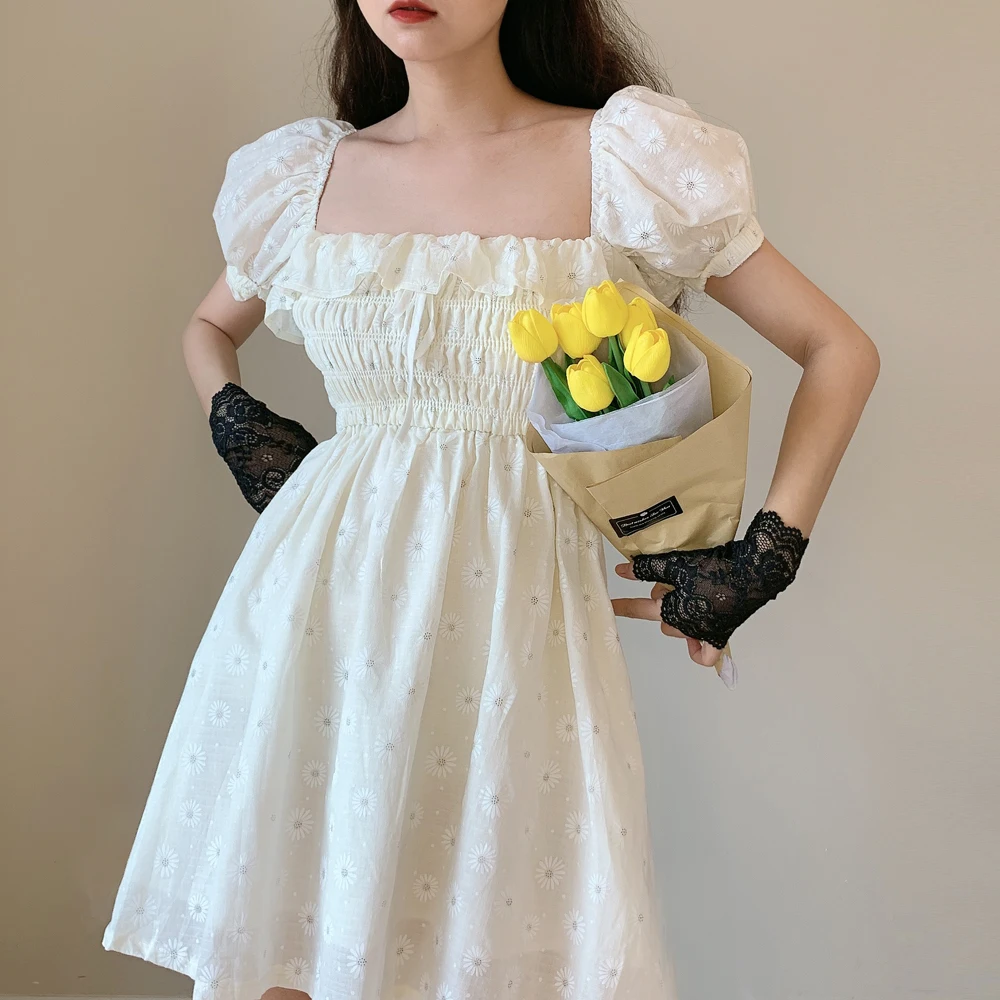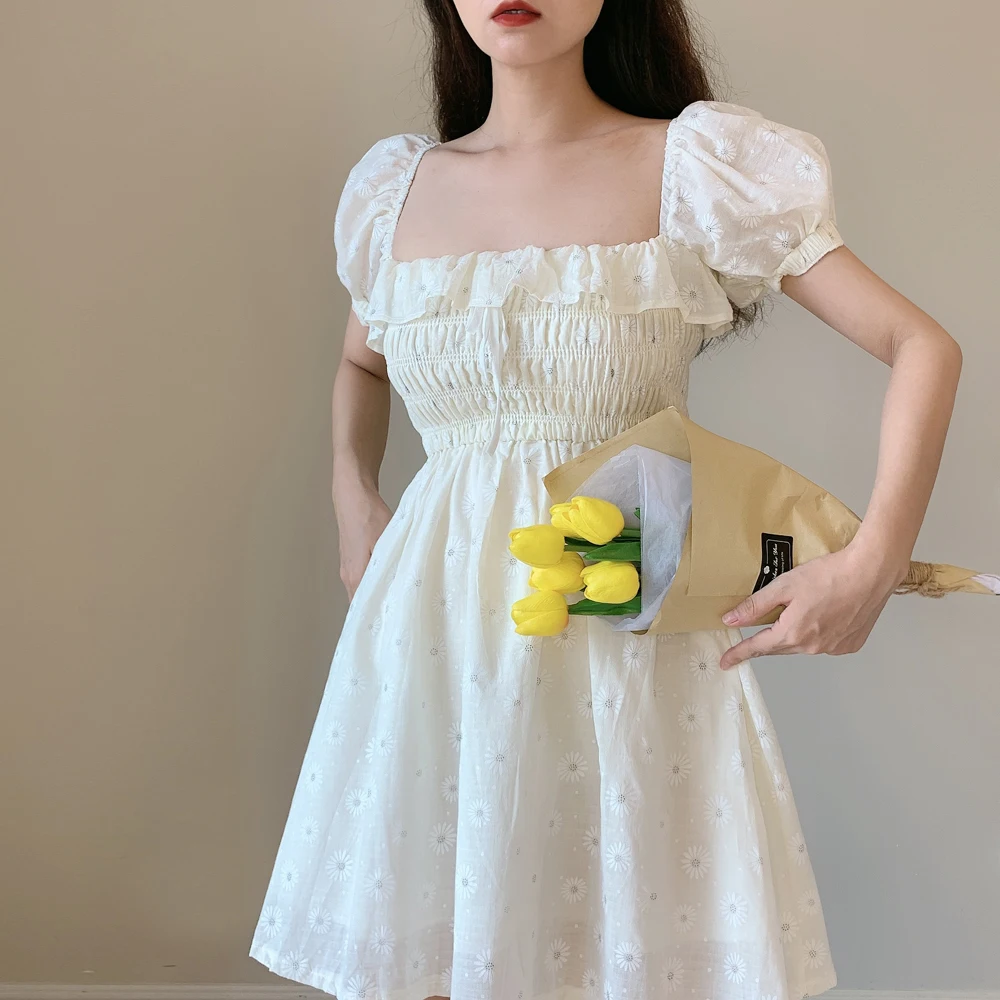 2021 Summer White Flower Beach Dress Woman Puff Sleeve Slash Collar Ruffled Daisy Embroidered Pleated Elegant Vintage Dress Robe