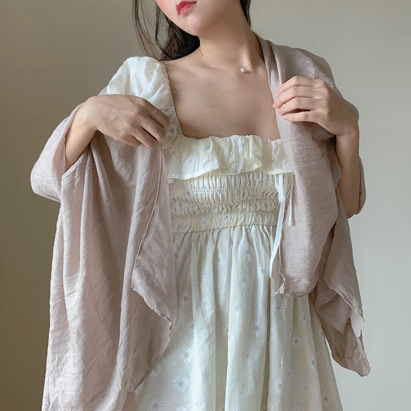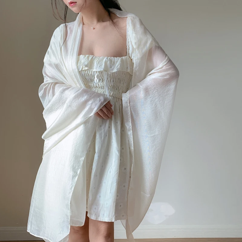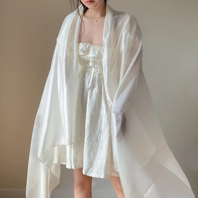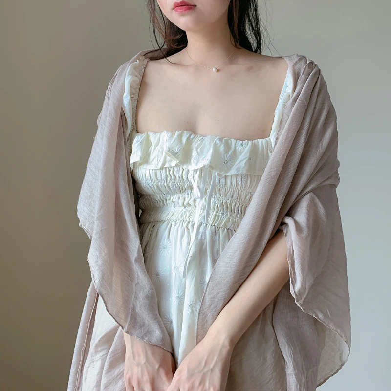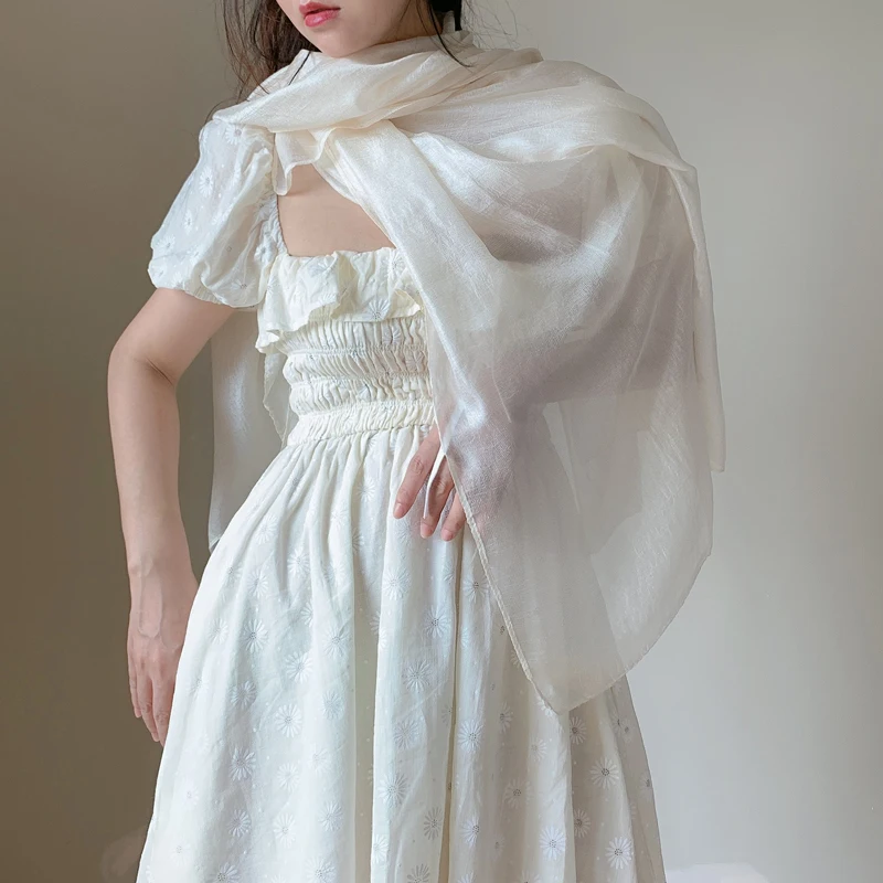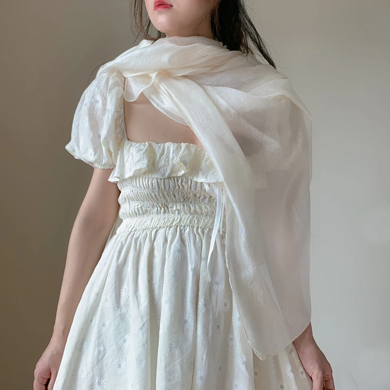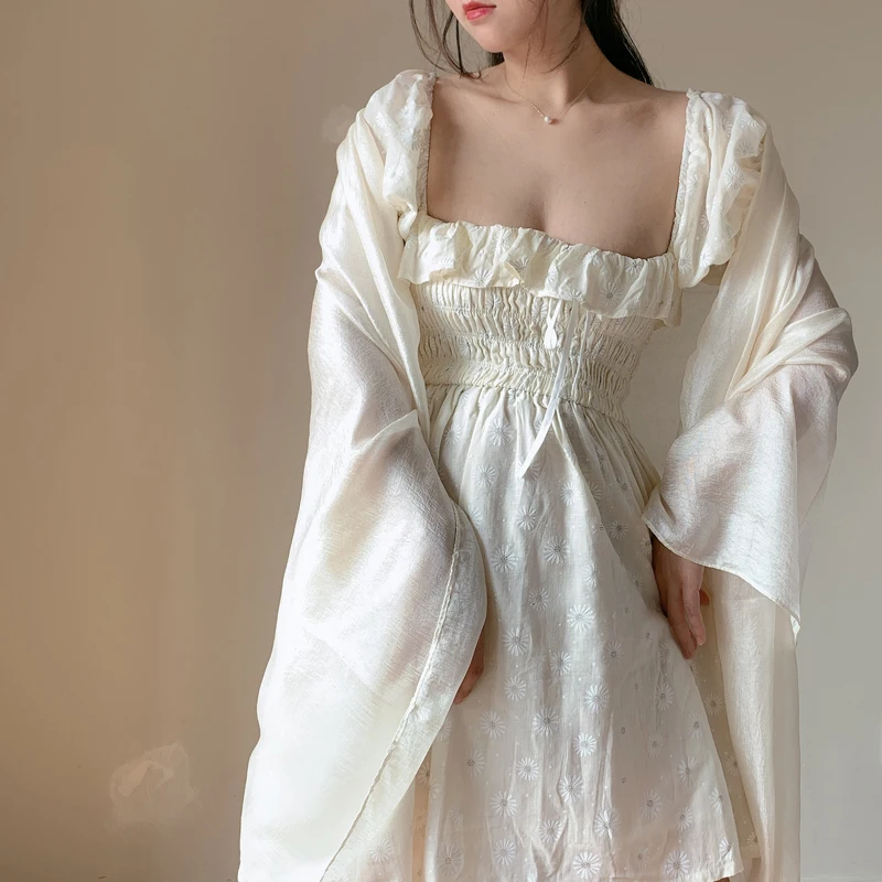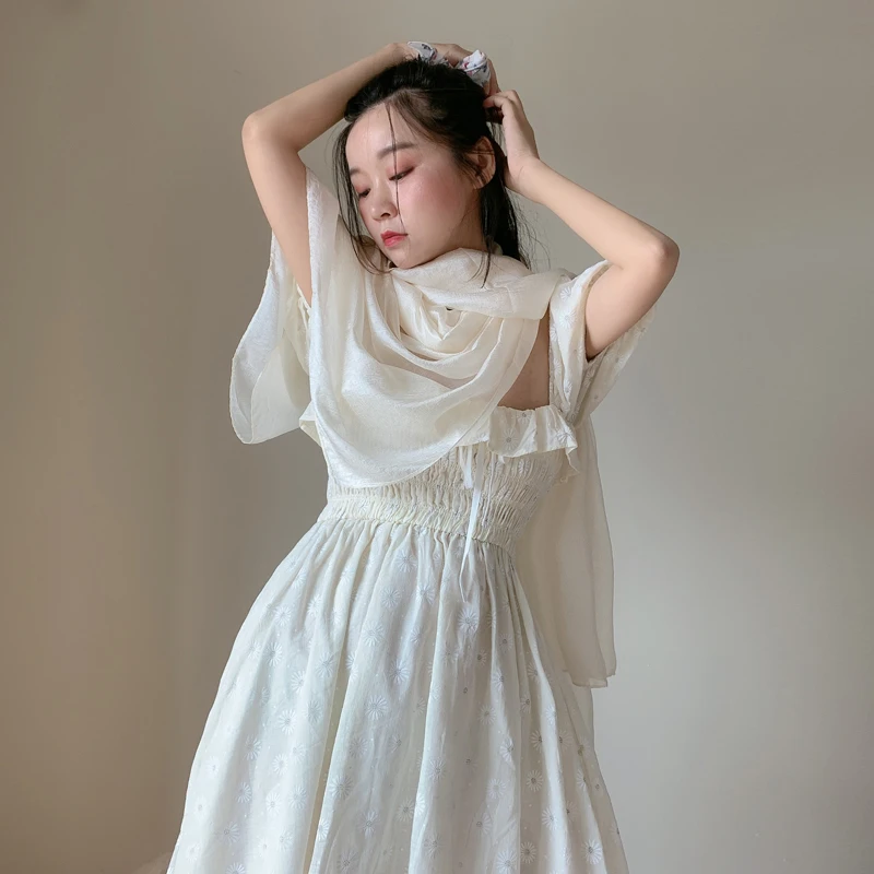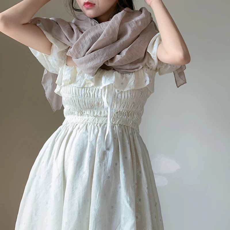 2021 Summer White Flower Beach Dress Woman Puff Sleeve Slash Collar Ruffled Daisy Embroidered Pleated Elegant Vintage Dress Robe
