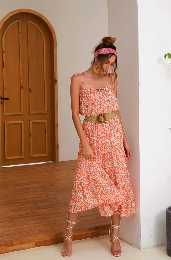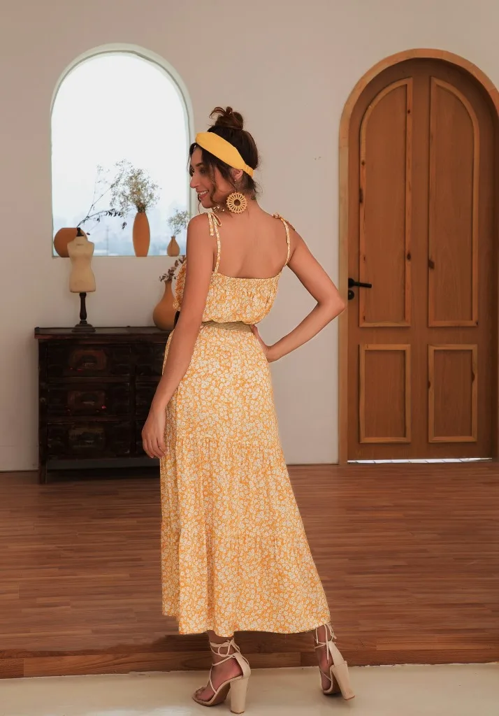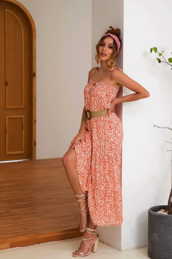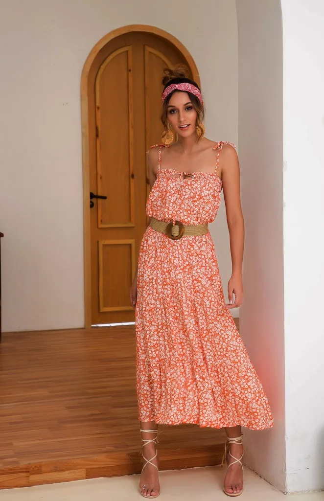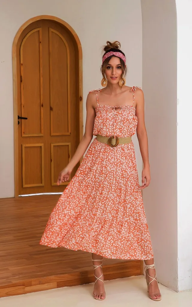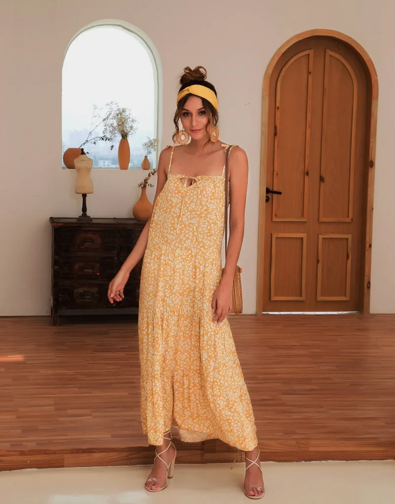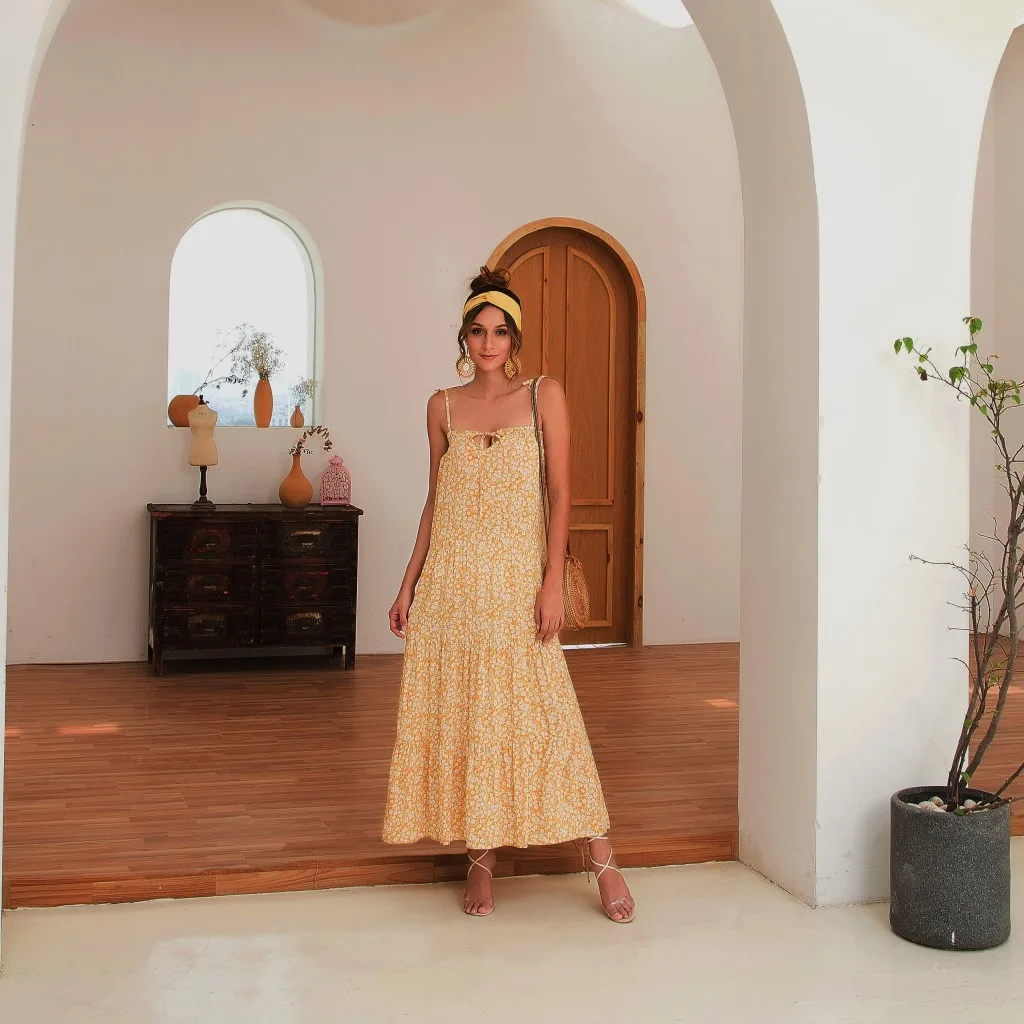 2021 Summer Women's Fashion Casual Print Deep V Neck Spaghetti Straps Sleeveless Backless Loose Waist Floor Lenght Dress Ladies