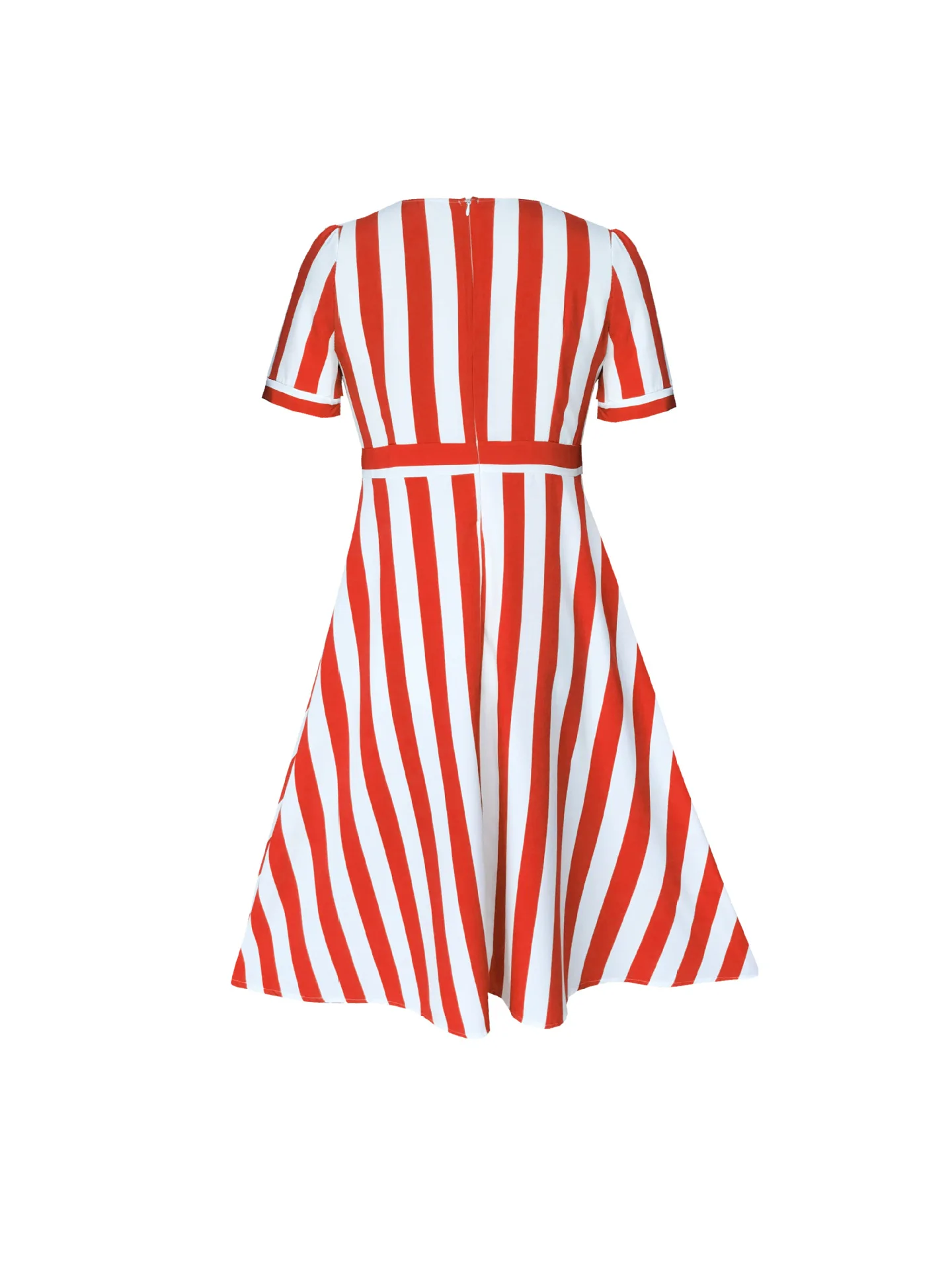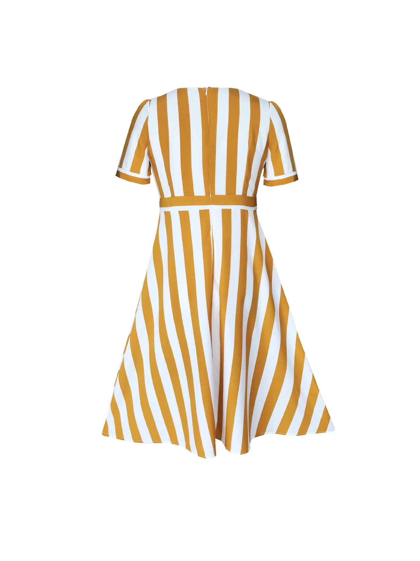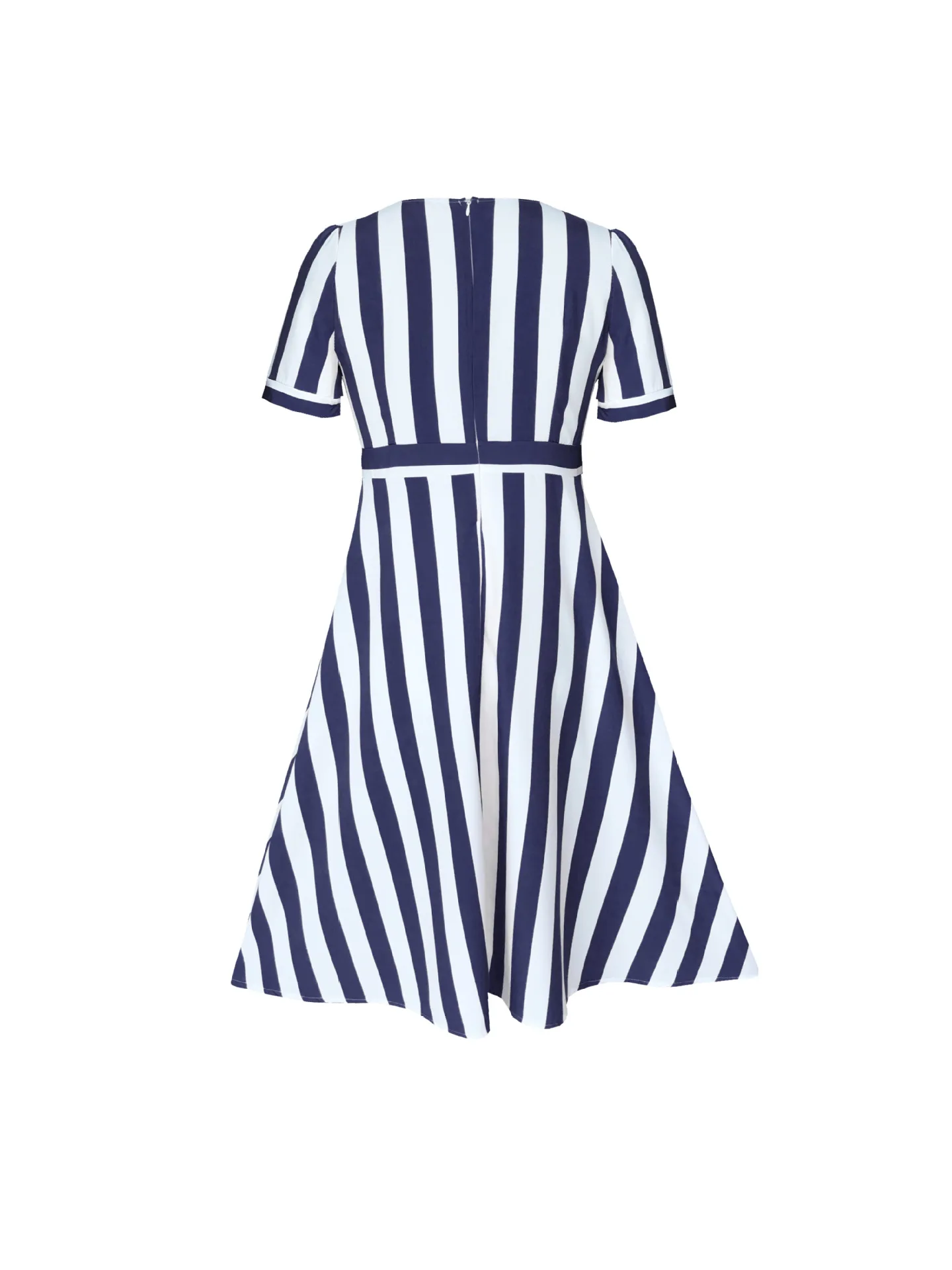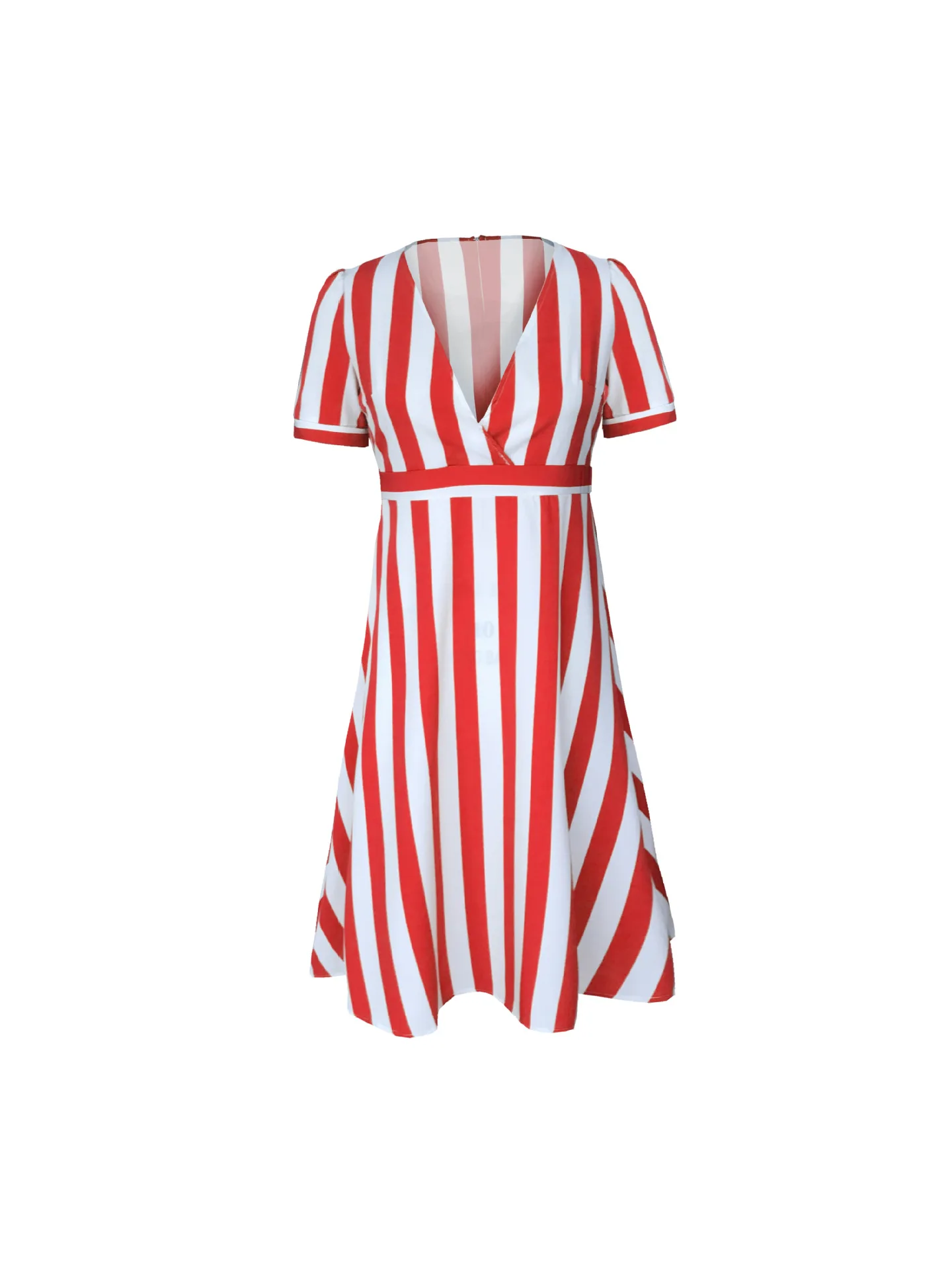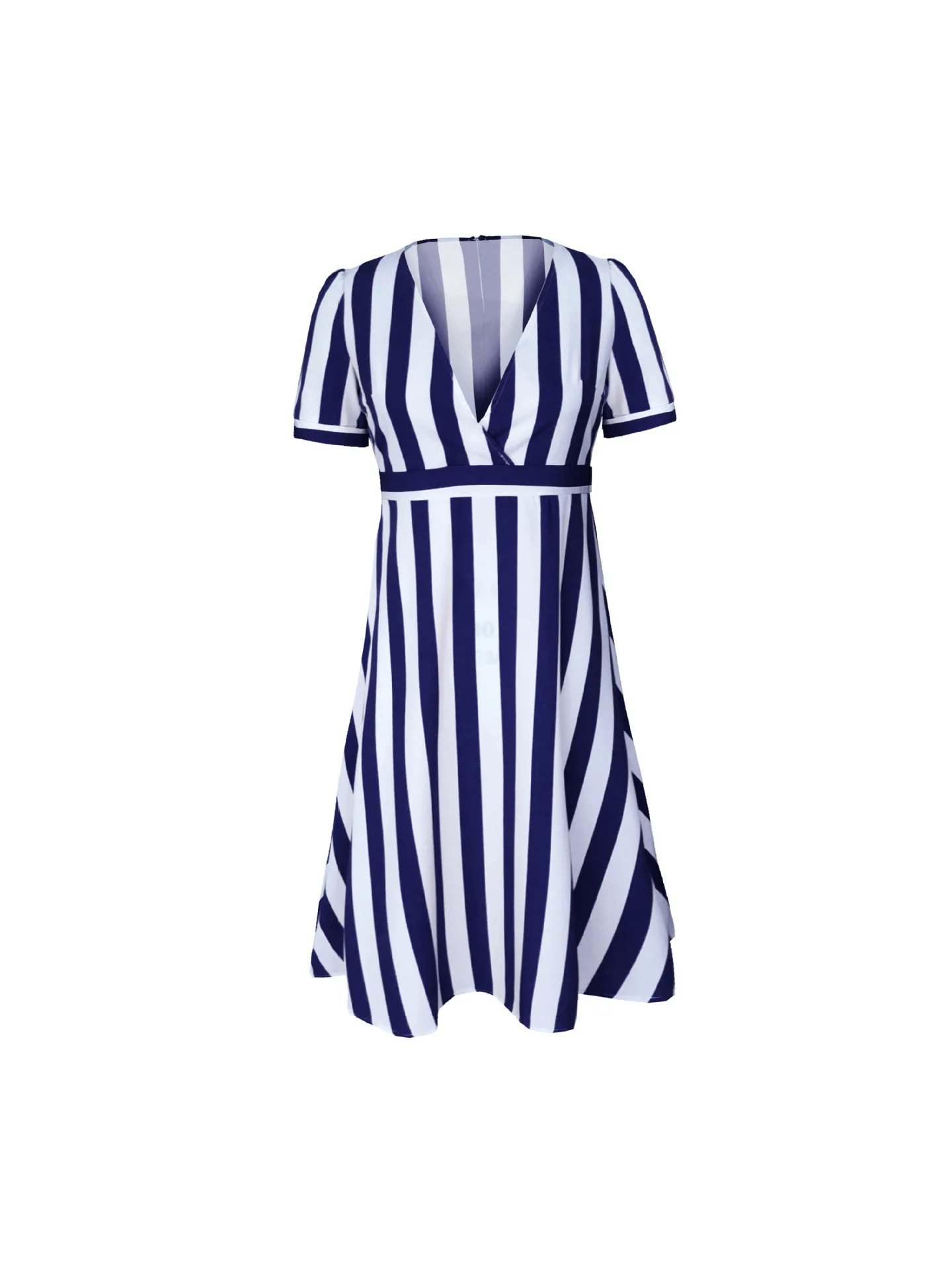 2021 Summer Women's Fashion Casual Stripe Deep V Neck Patchwork Short Sleeve Zippers A Line Knee Lenght Dress Ladies Basic Slim