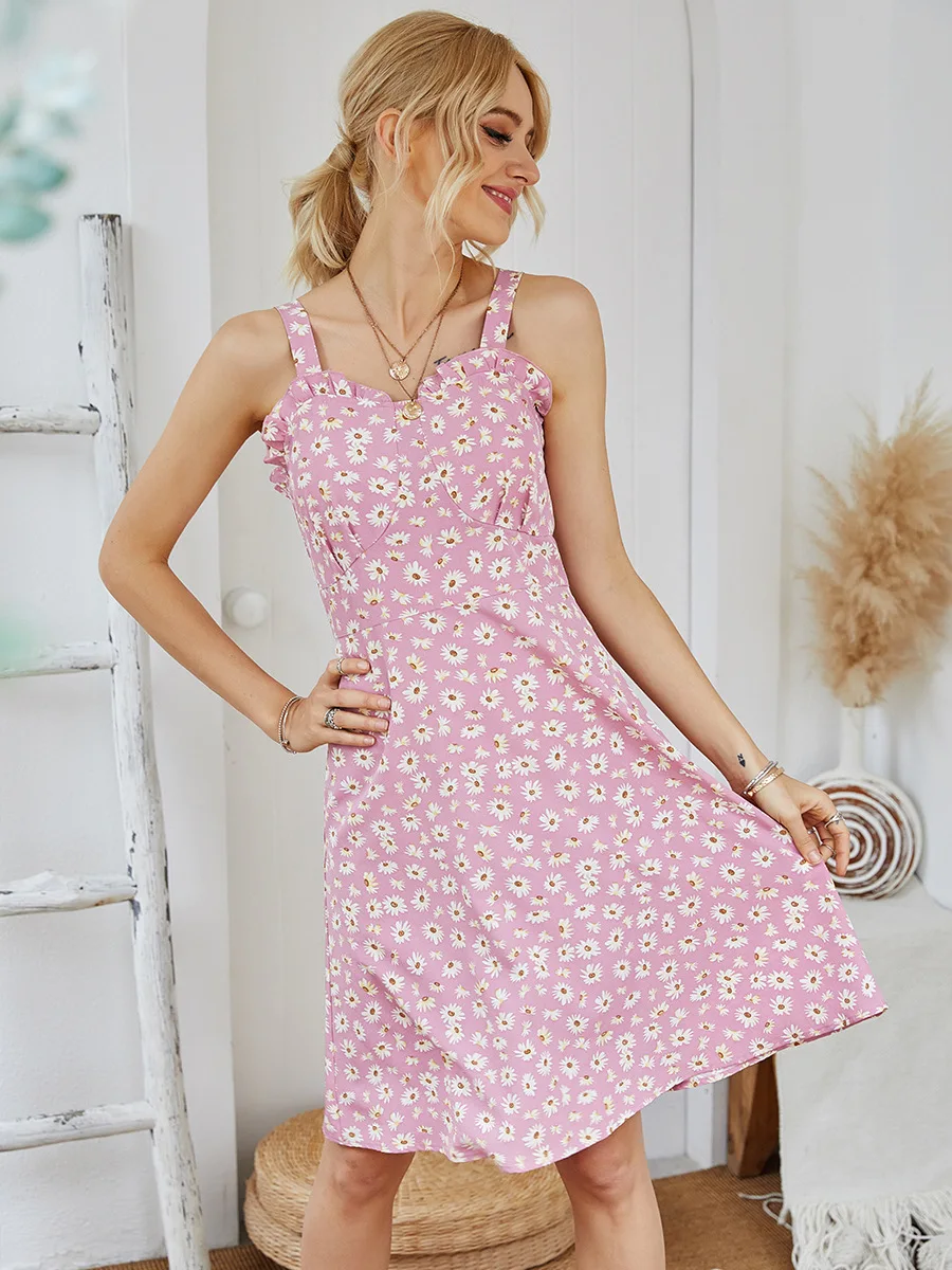 2021 Summer Women's Fashion Sexy Floral Print V Neck Spaghetti Straps Ruffle Sleeveless Backless Empire Knee Lenght Dress Ladies