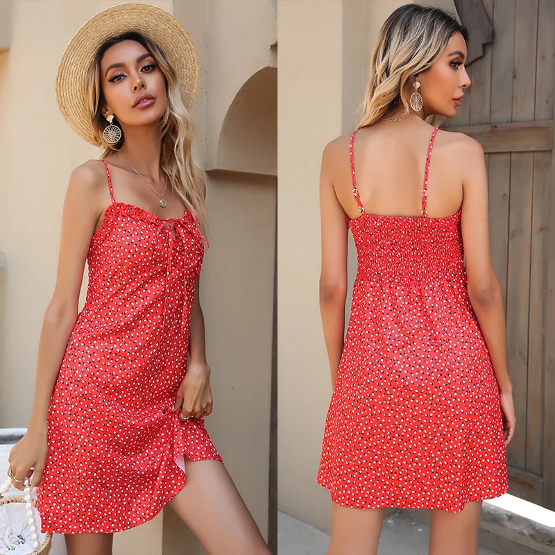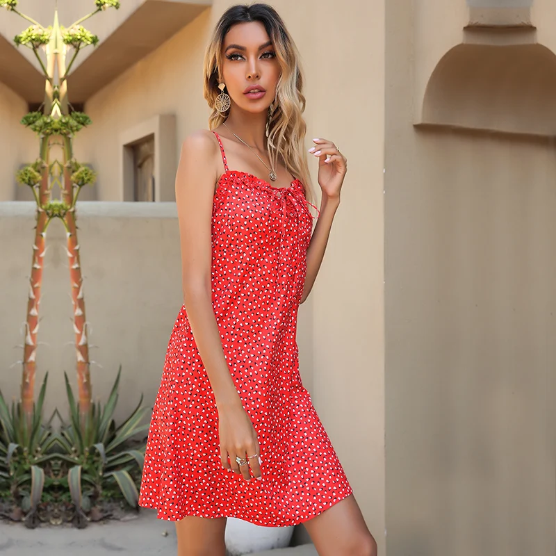 2021 Summer Women's Fashion Sexy Print V Neck Sapghetti Straps Bow Sleeveless Backless Shirring Ruffles A Line Mini Dress Ladies