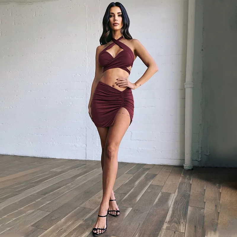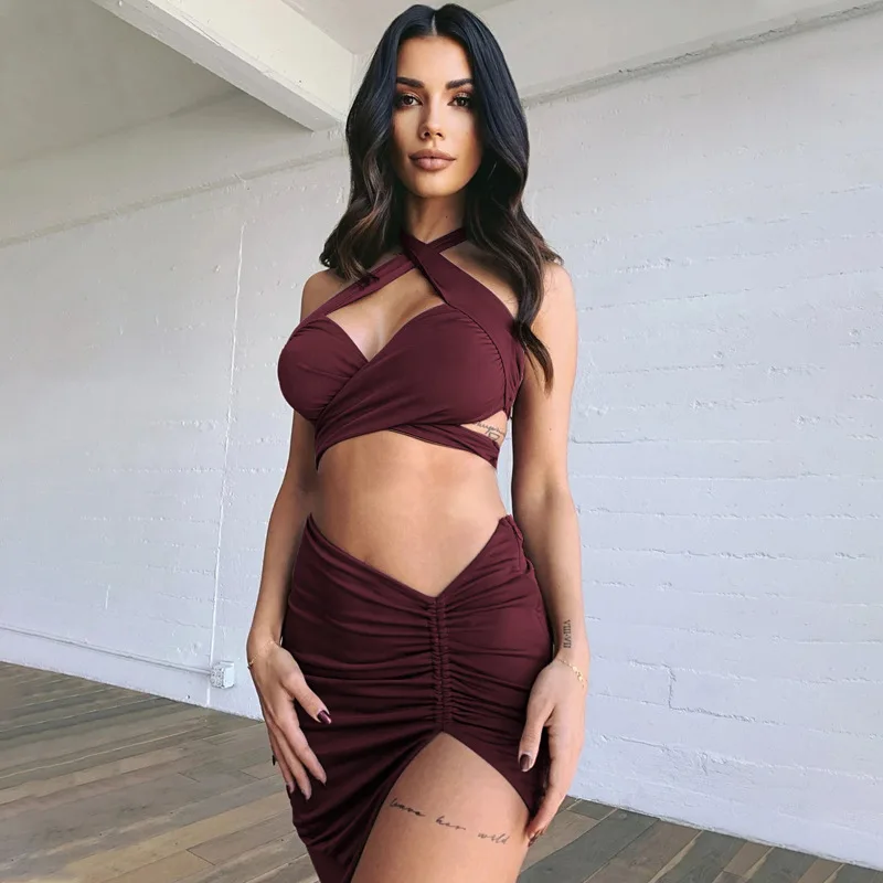 2021 Summer Women's New Style Bowknot Cross-Tie Cropped Top with Oblique Split Short Skirt Set