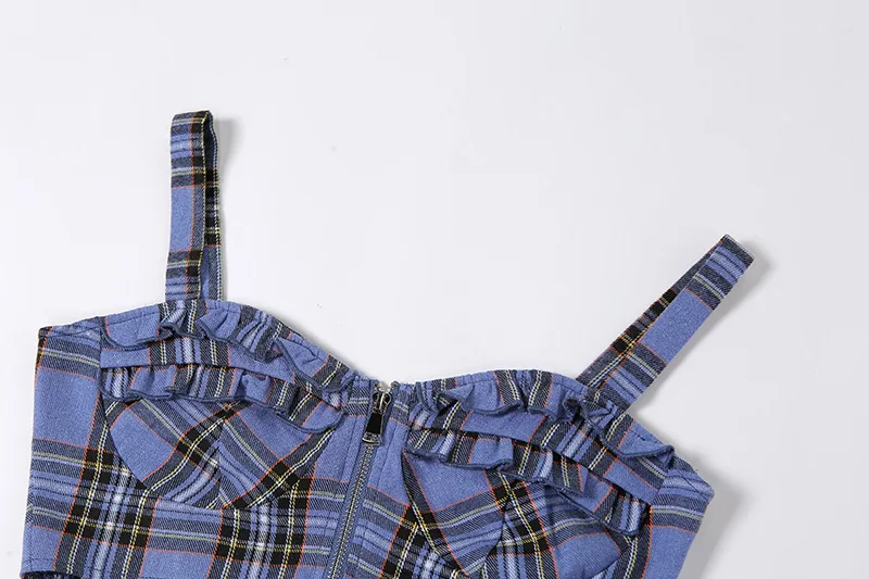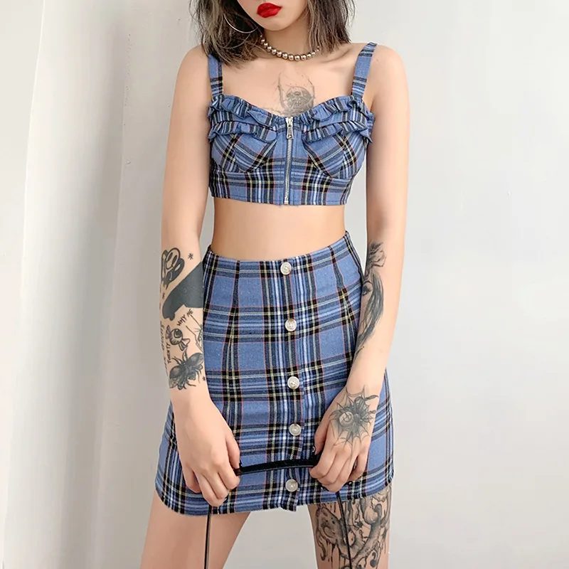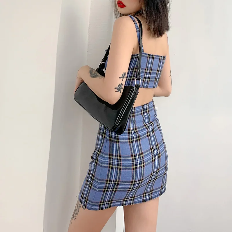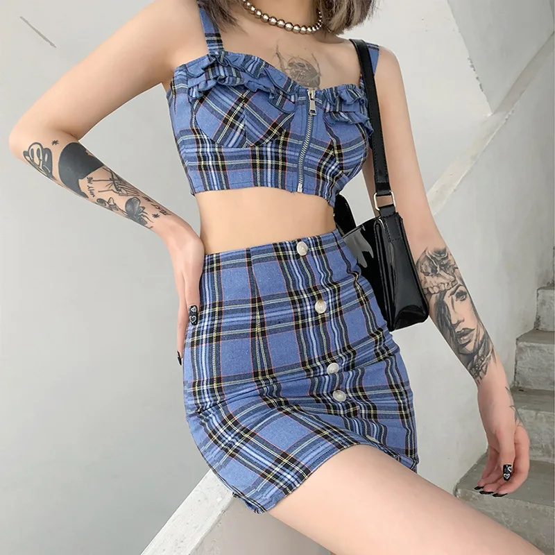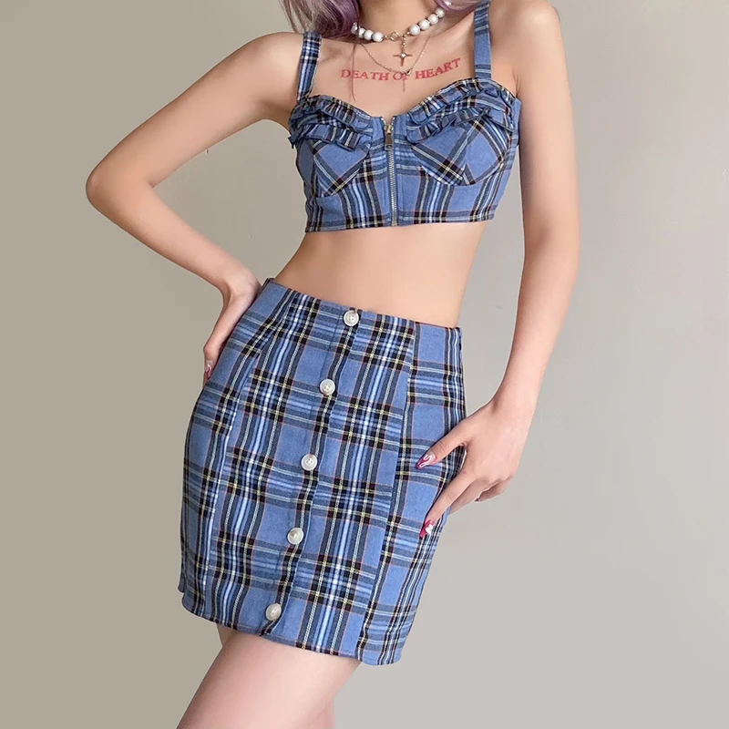 2021 Summer Women's New Style Plaid Sling Zipper Cardigan Bag Hip Skirt Two-Piece Suit