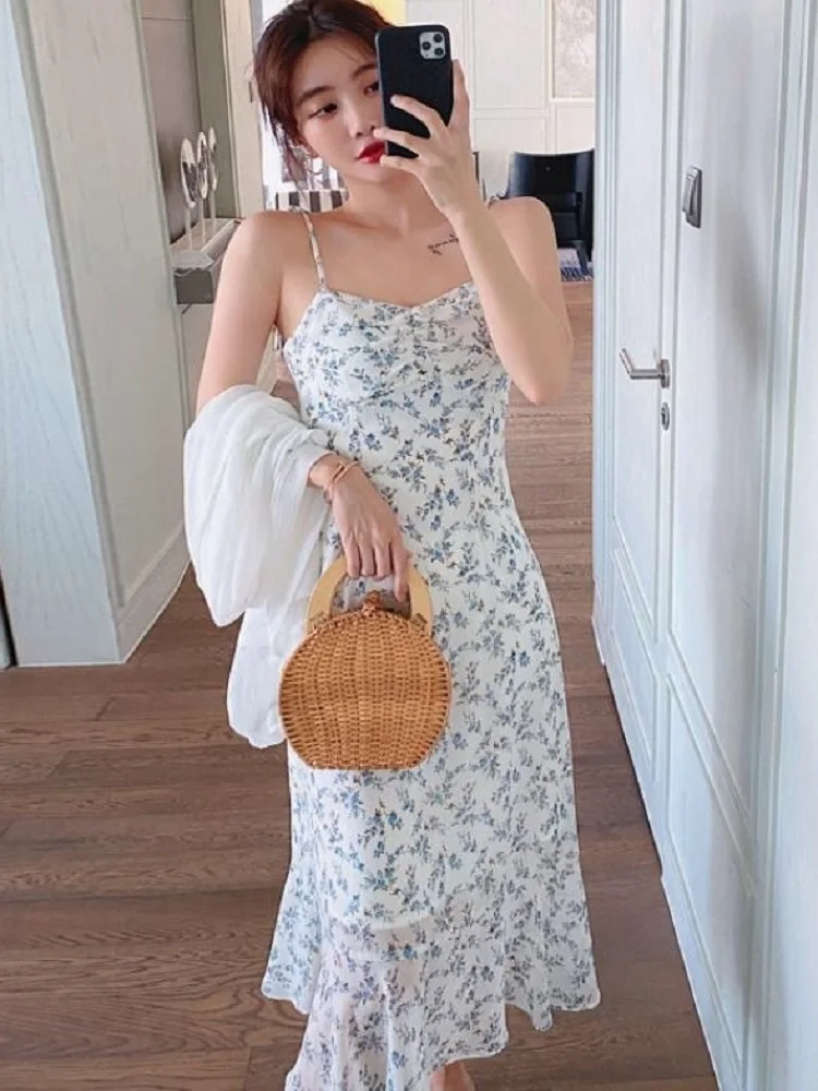 2021 Summer Women's New Tight-Fitting Floral Suspender Skirt Off-The-Shoulder Dress Mid-Length Skirt Super Fairy Beach Outing