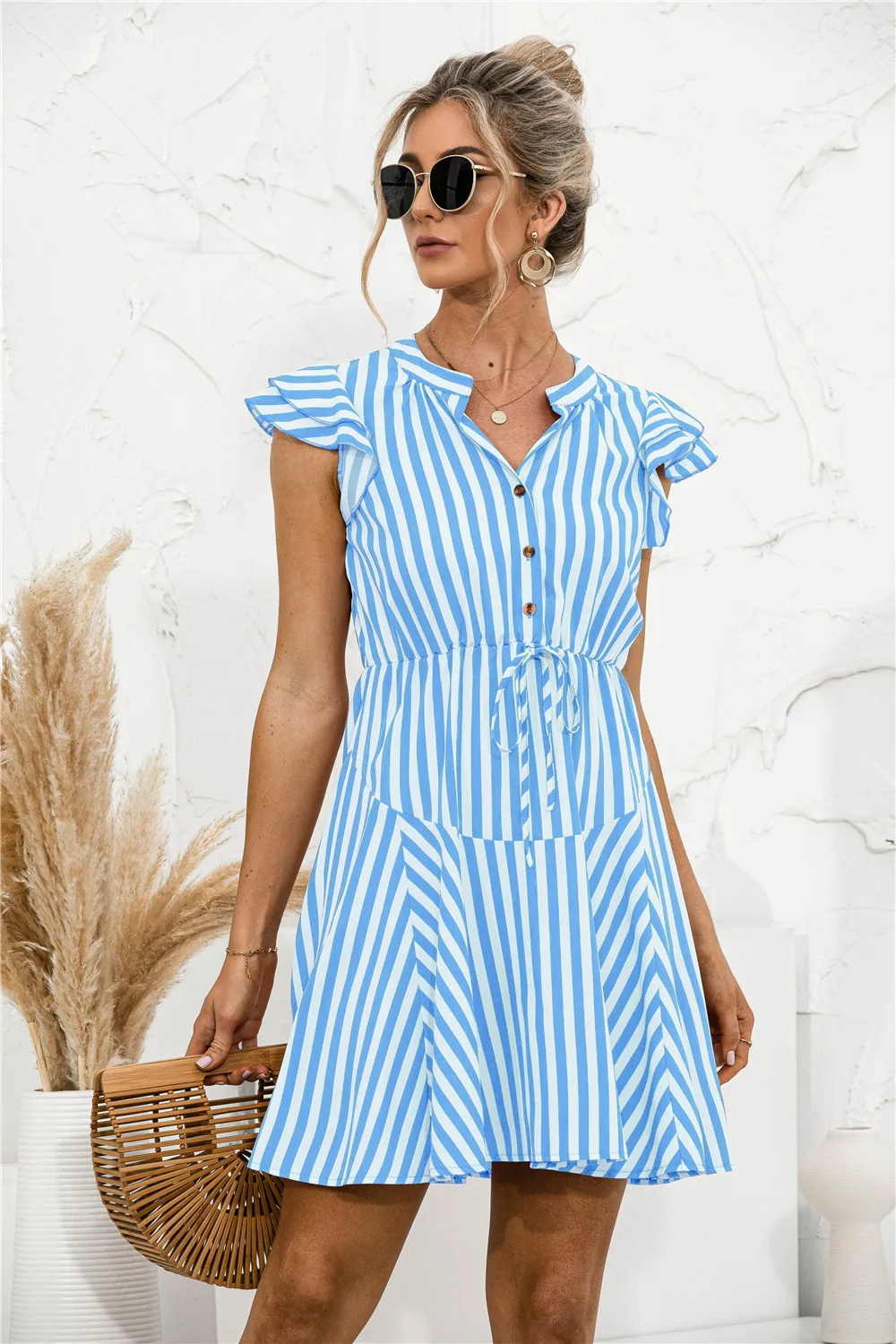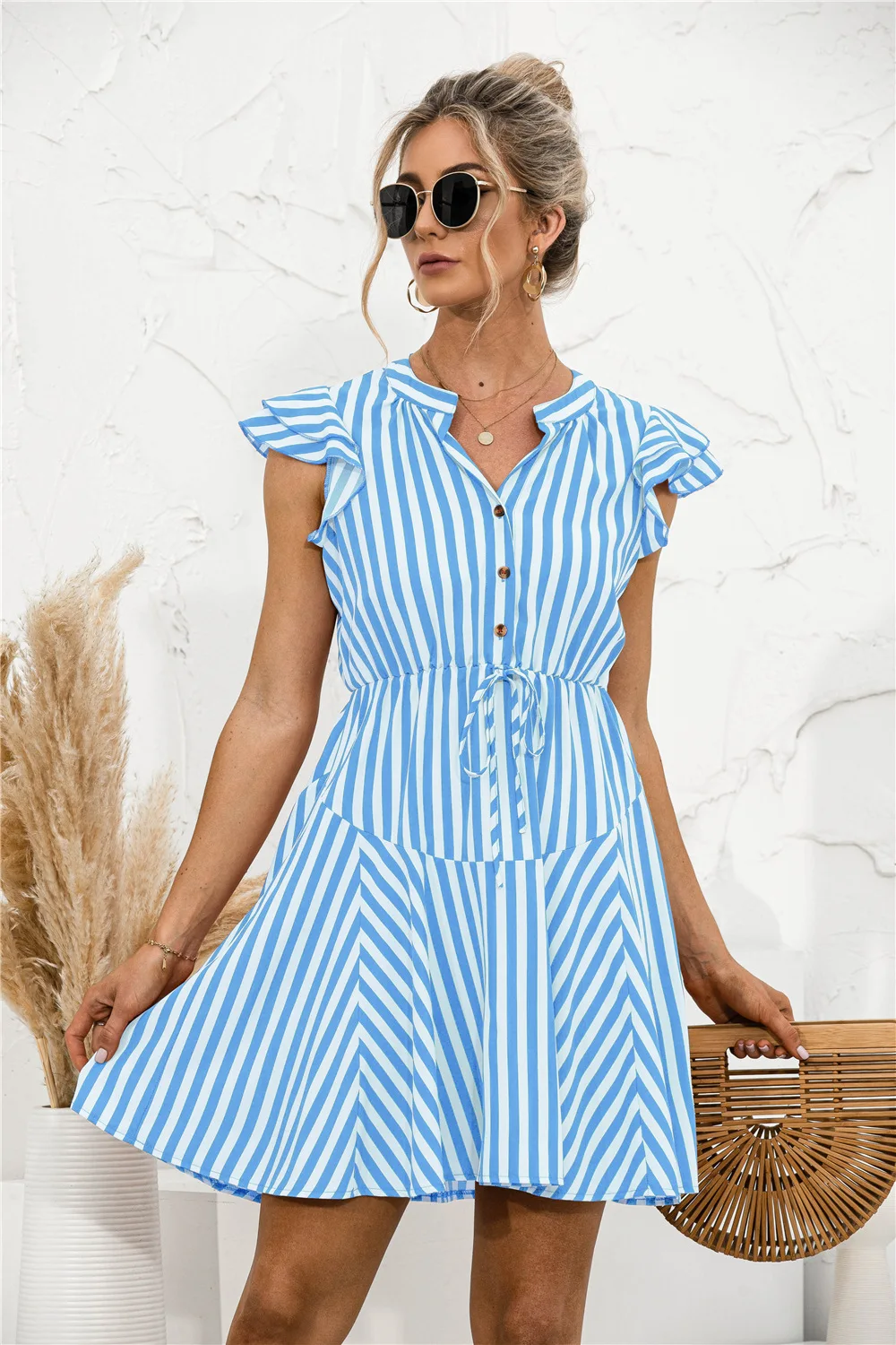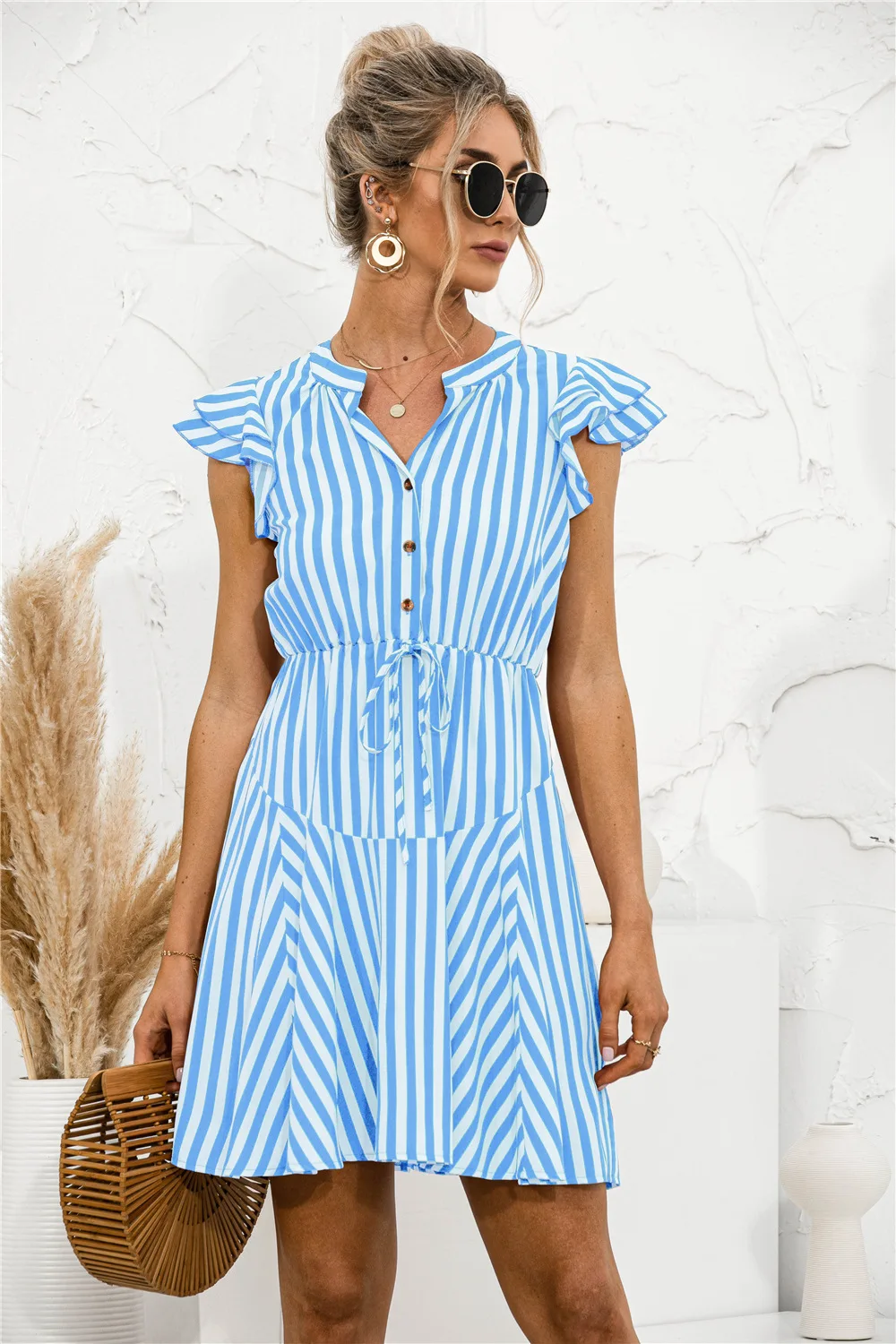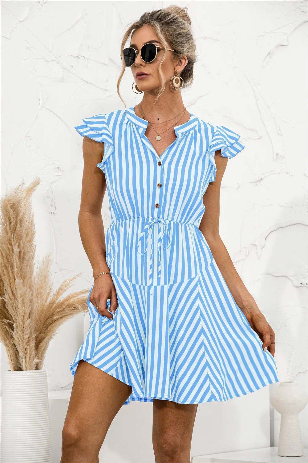 2021 Sunner New Women's Fashion Sexy Stripe V Neck Buttons Lace Up Flying Sleeve Tunic Empire A Line Mini Dress Lady Basic Slim