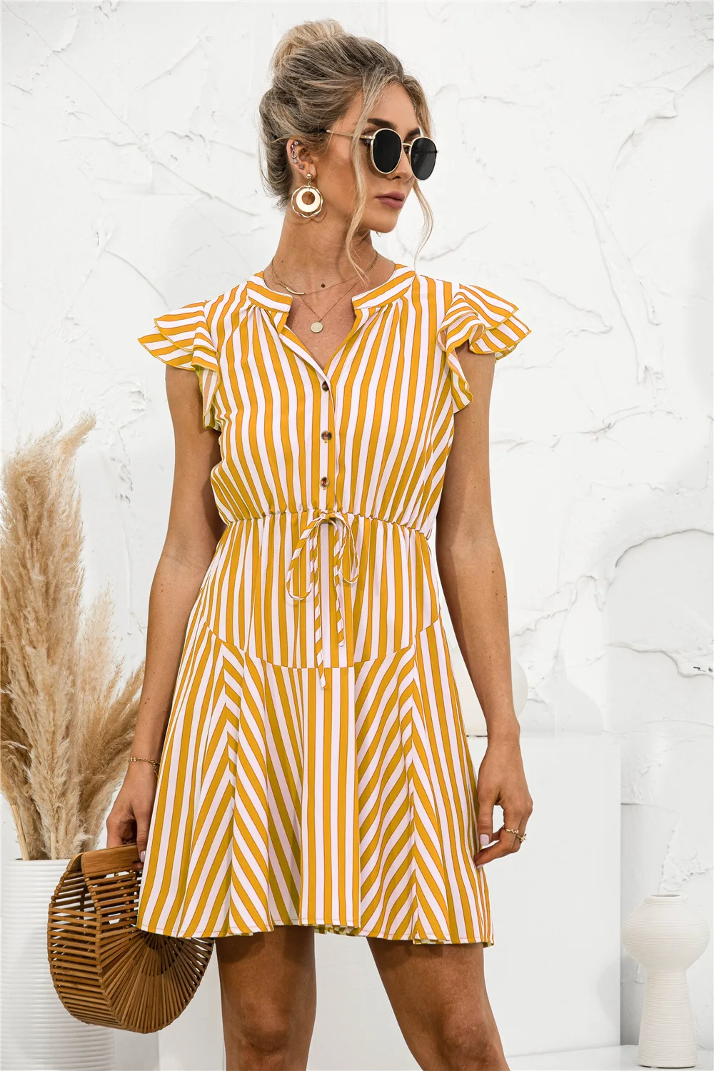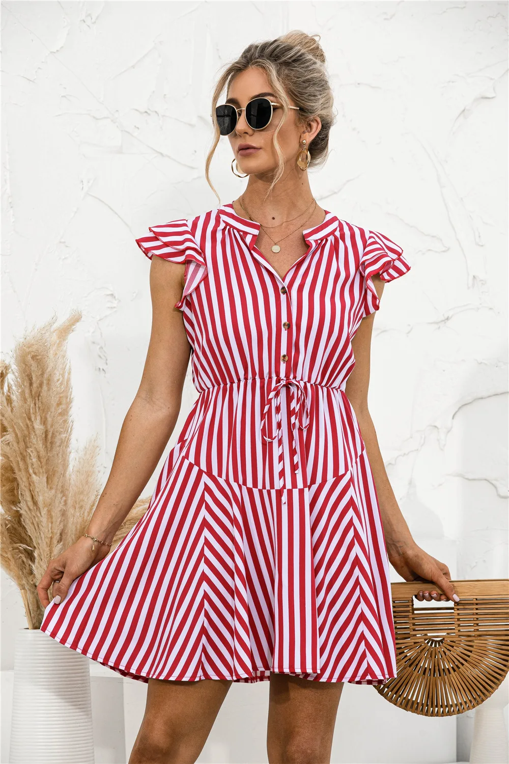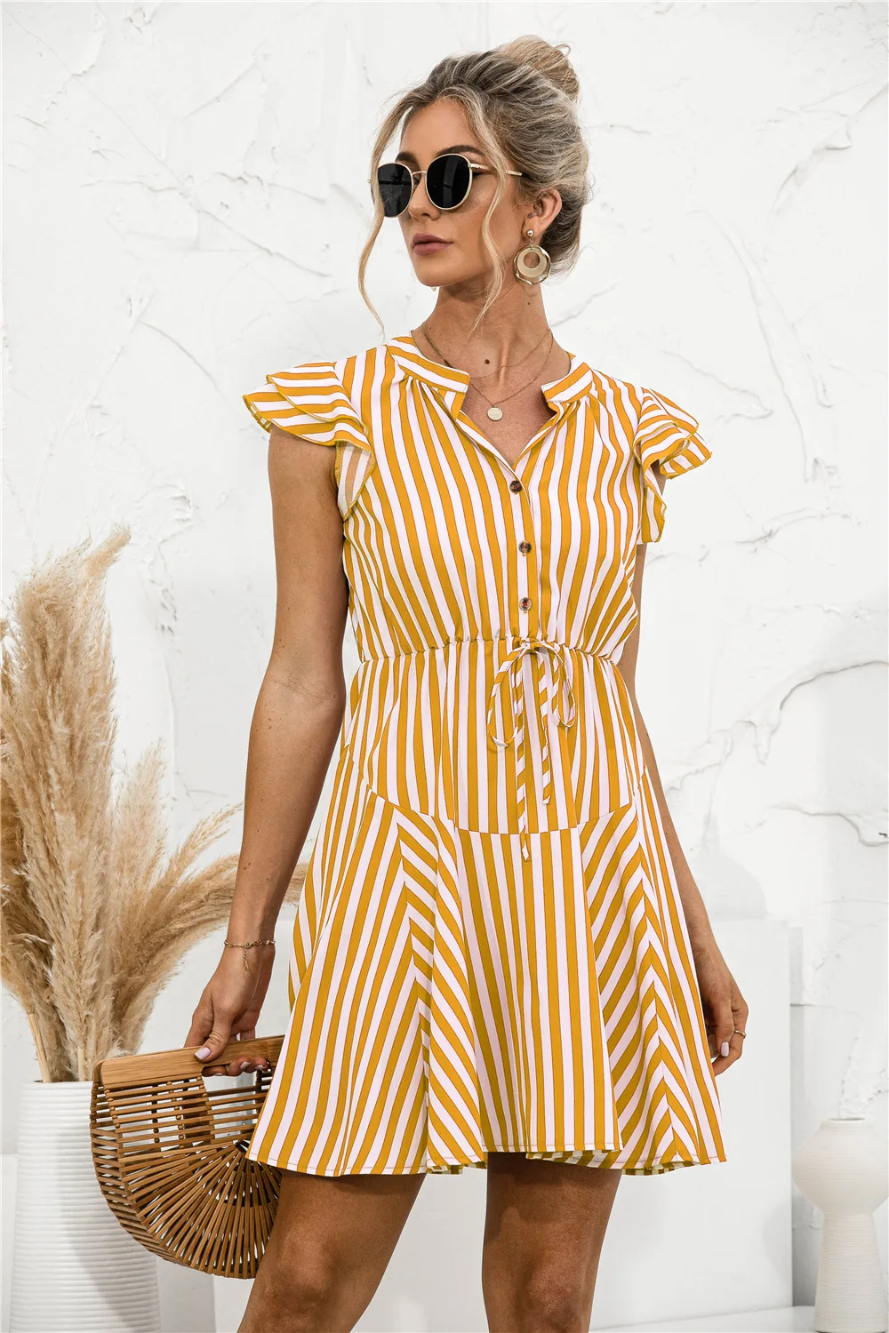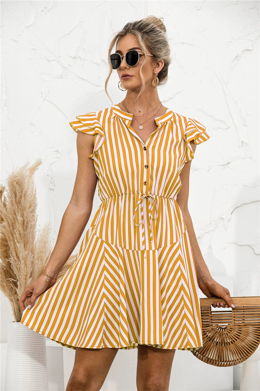 2021 Sunner New Women's Fashion Sexy Stripe V Neck Buttons Lace Up Flying Sleeve Tunic Empire A Line Mini Dress Lady Basic Slim