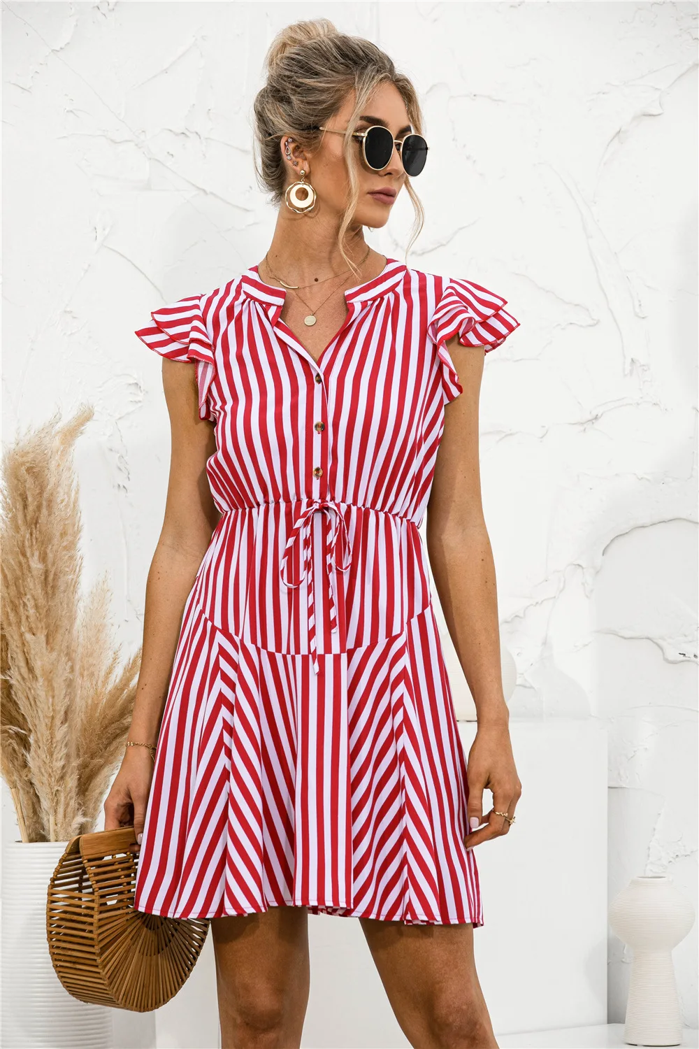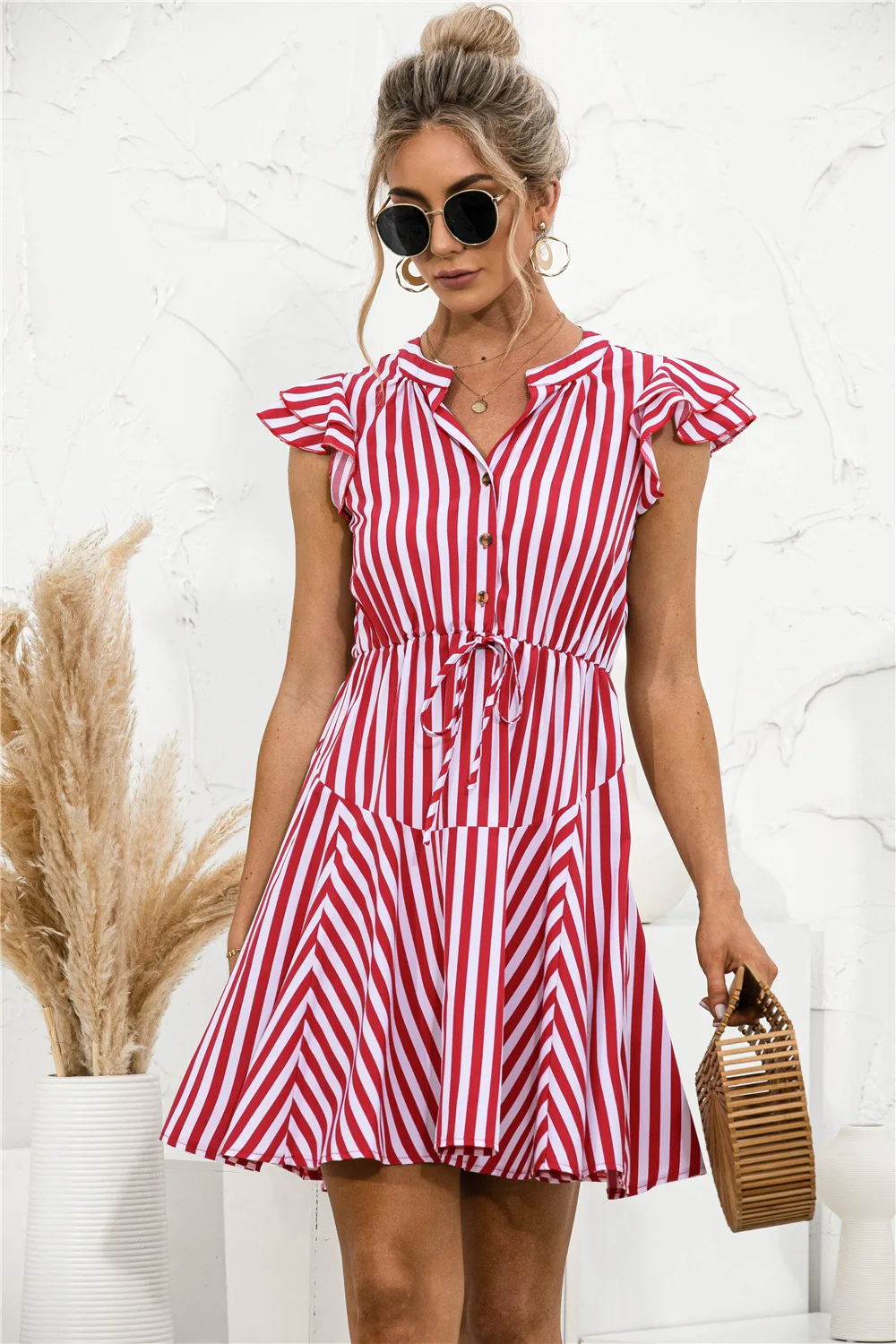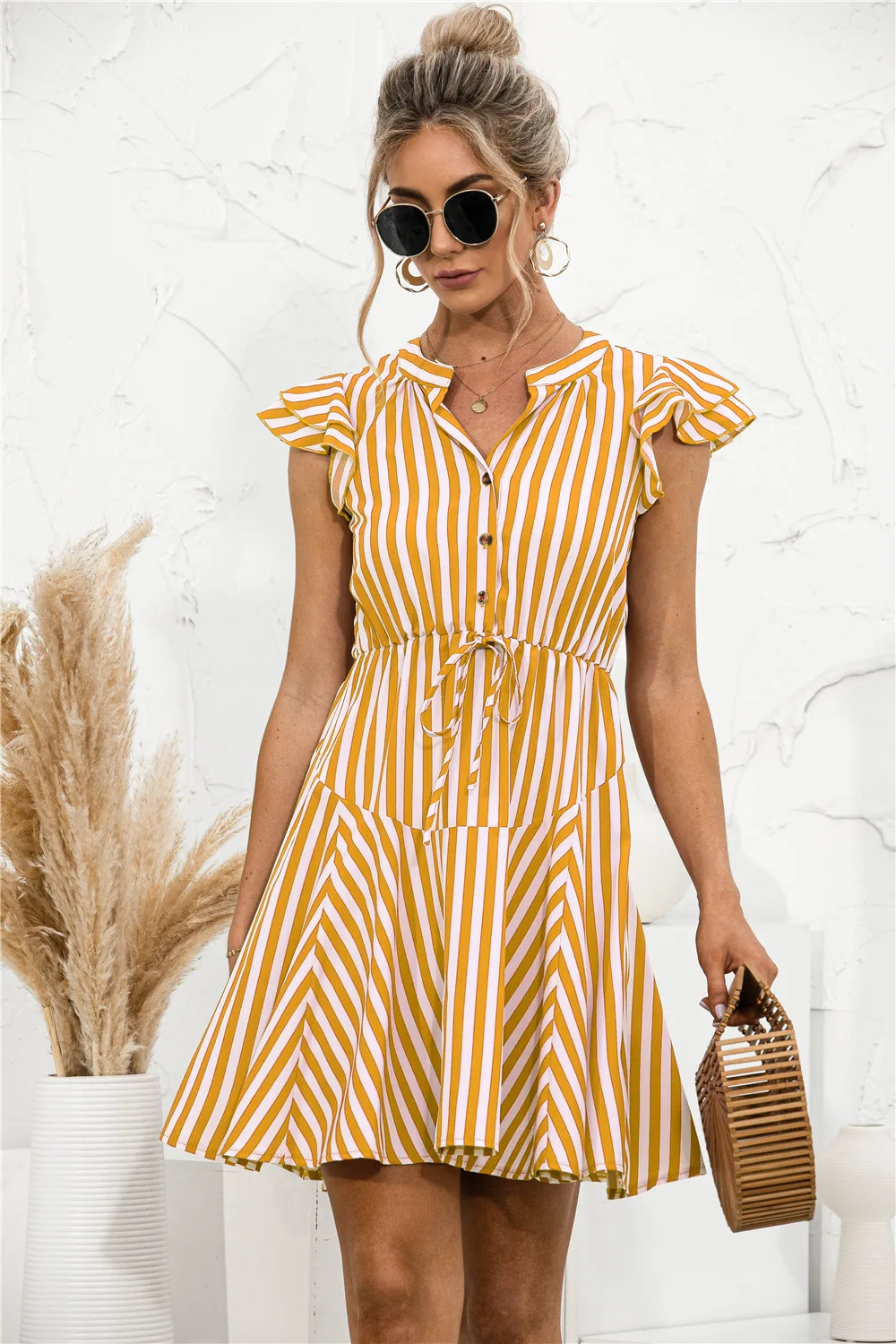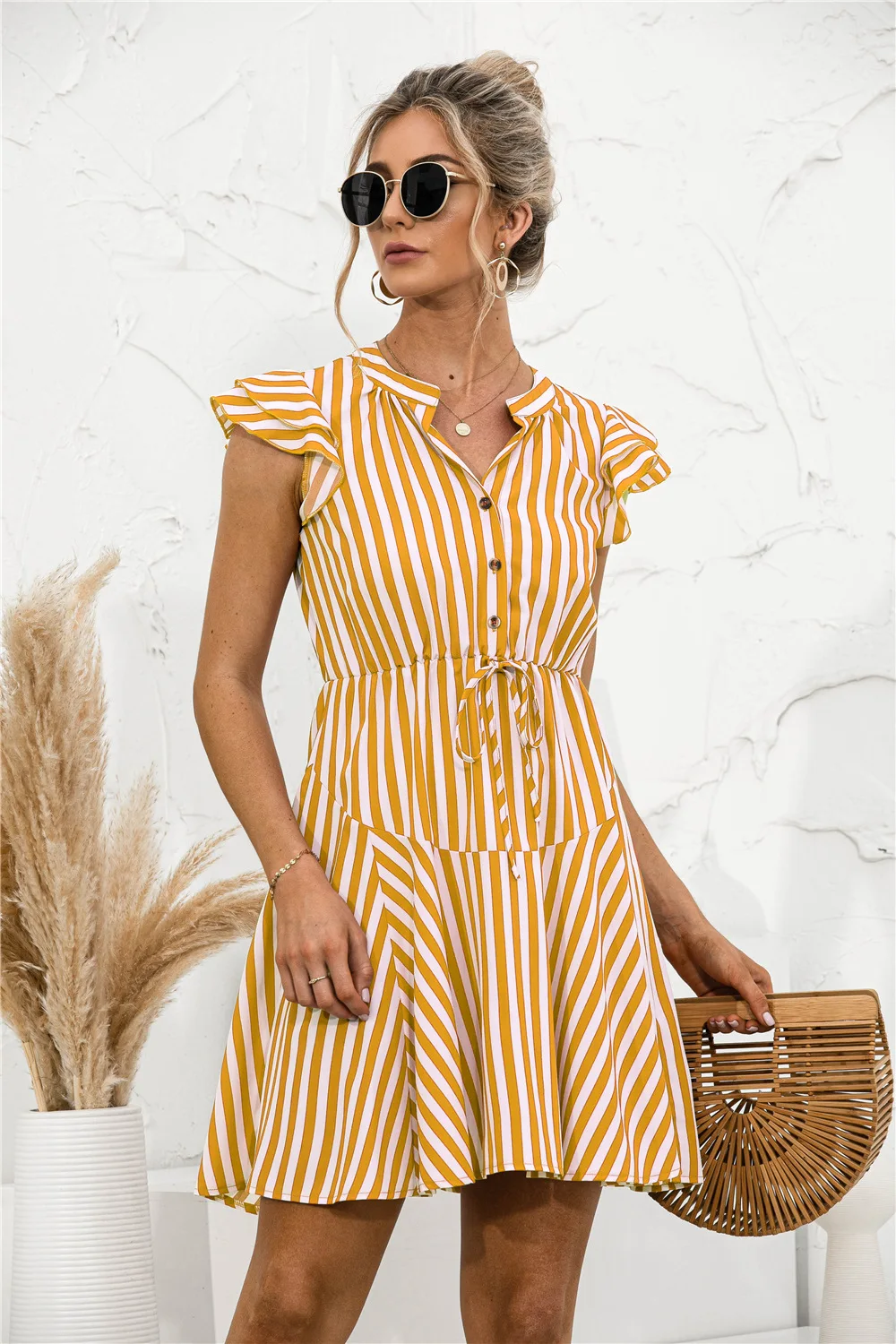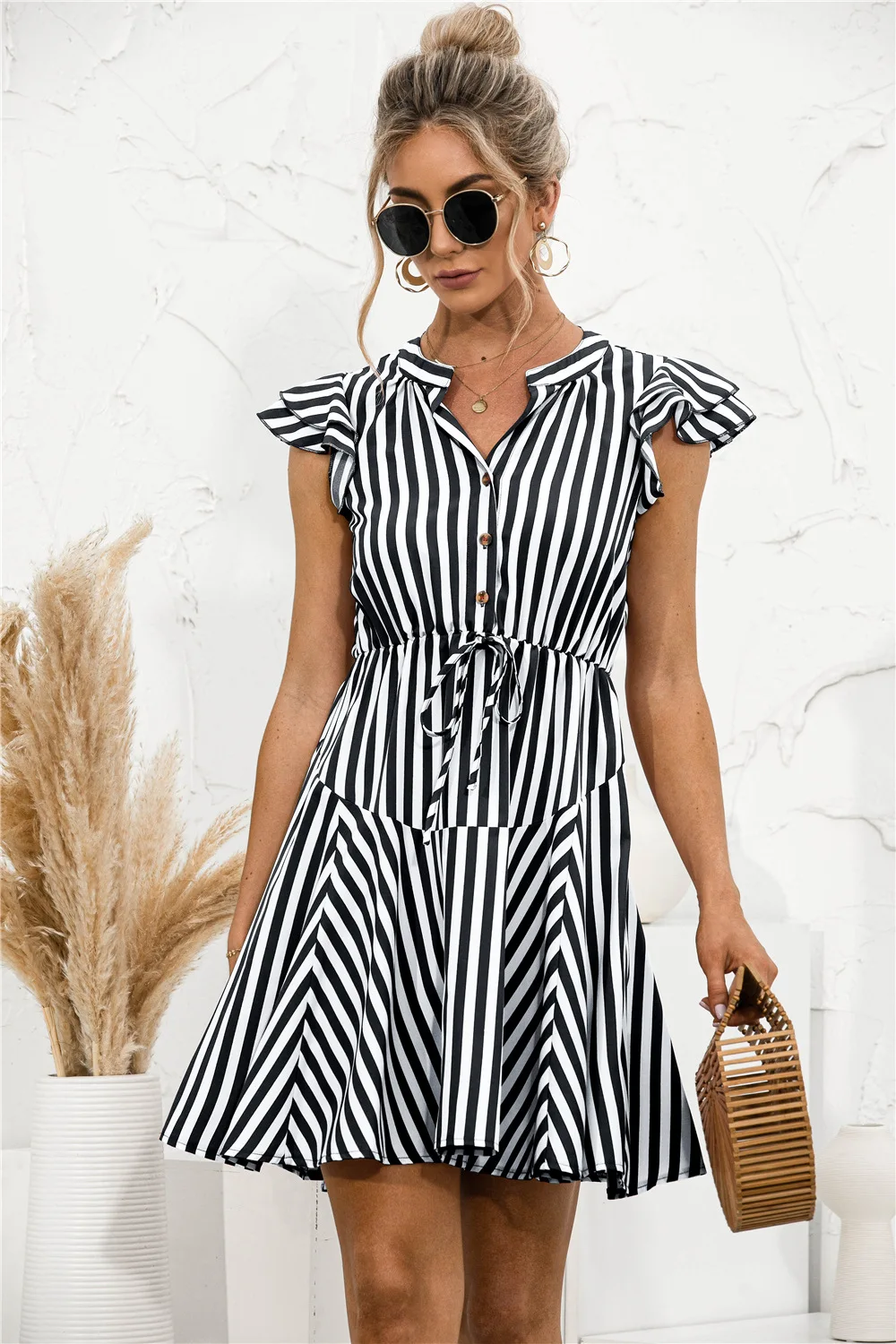 2021 Sunner New Women's Fashion Sexy Stripe V Neck Buttons Lace Up Flying Sleeve Tunic Empire A Line Mini Dress Lady Basic Slim