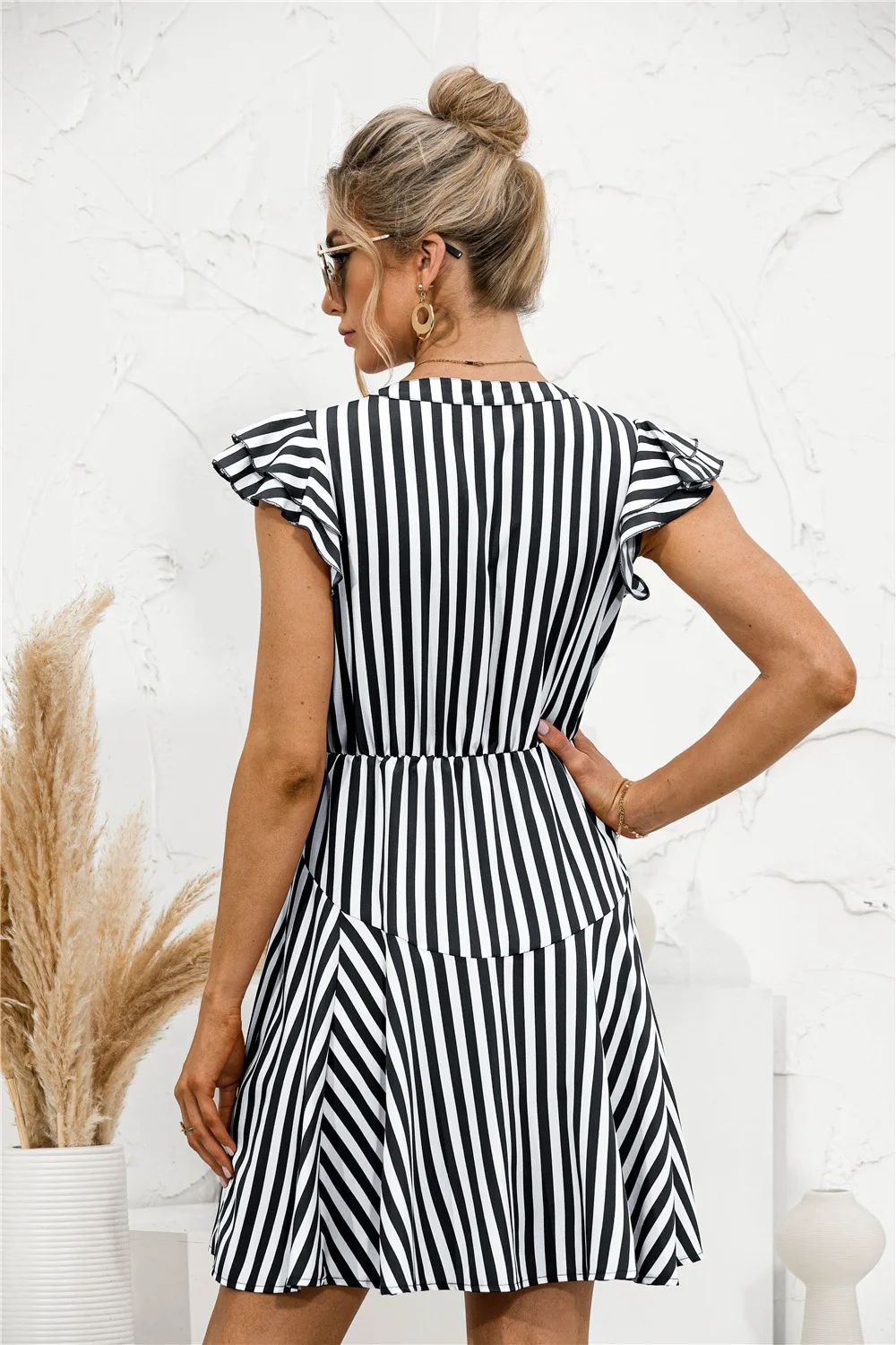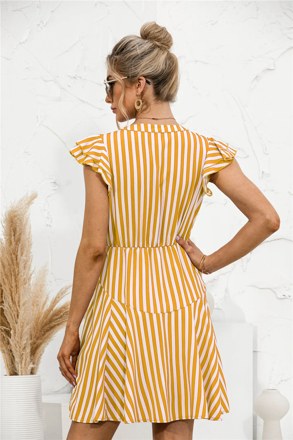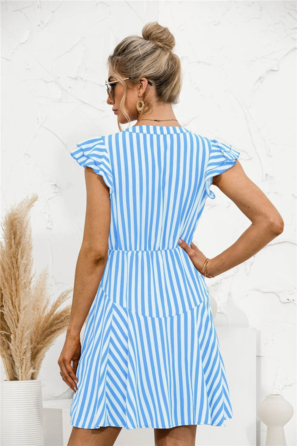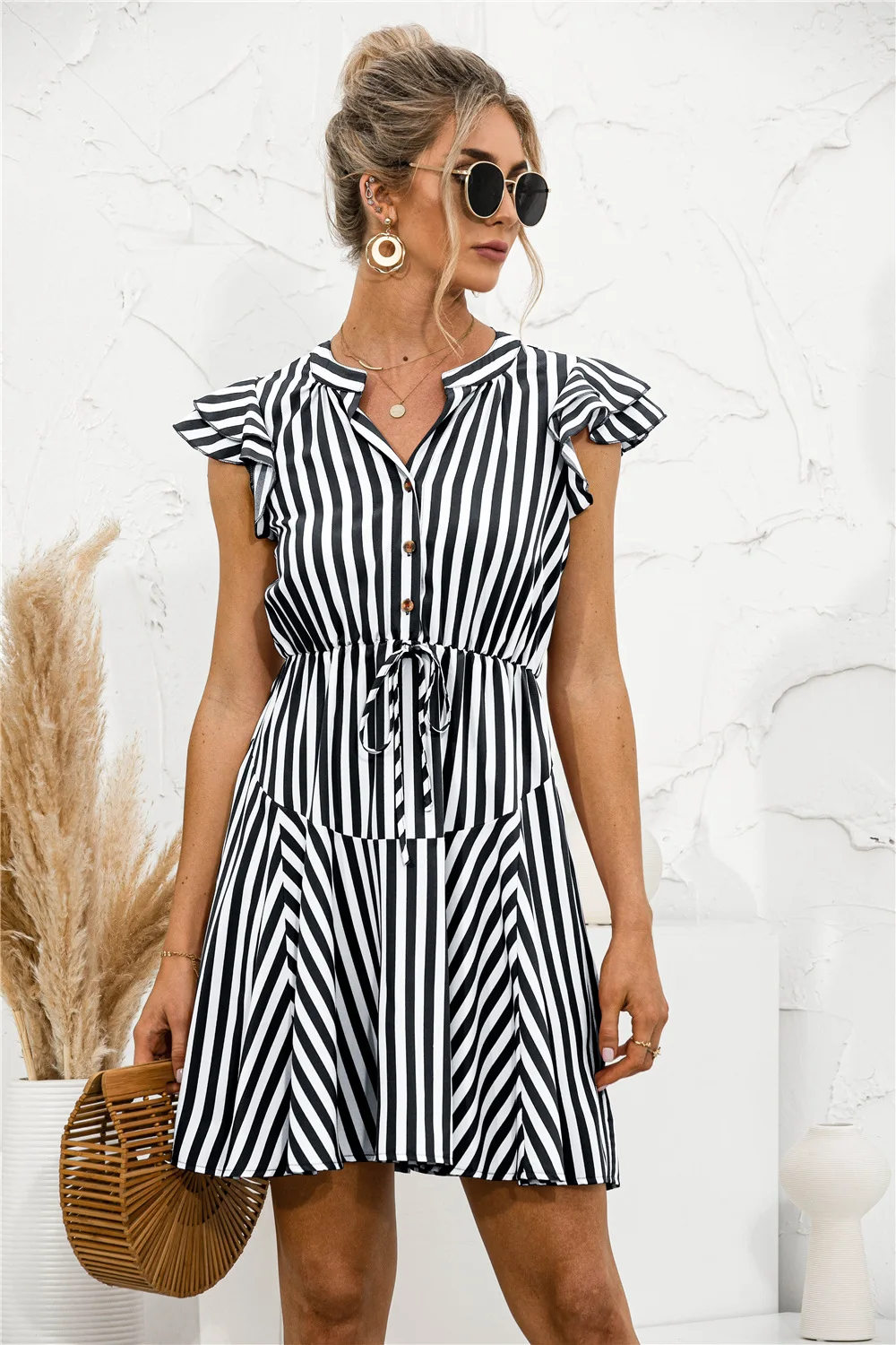 2021 Sunner New Women's Fashion Sexy Stripe V Neck Buttons Lace Up Flying Sleeve Tunic Empire A Line Mini Dress Lady Basic Slim