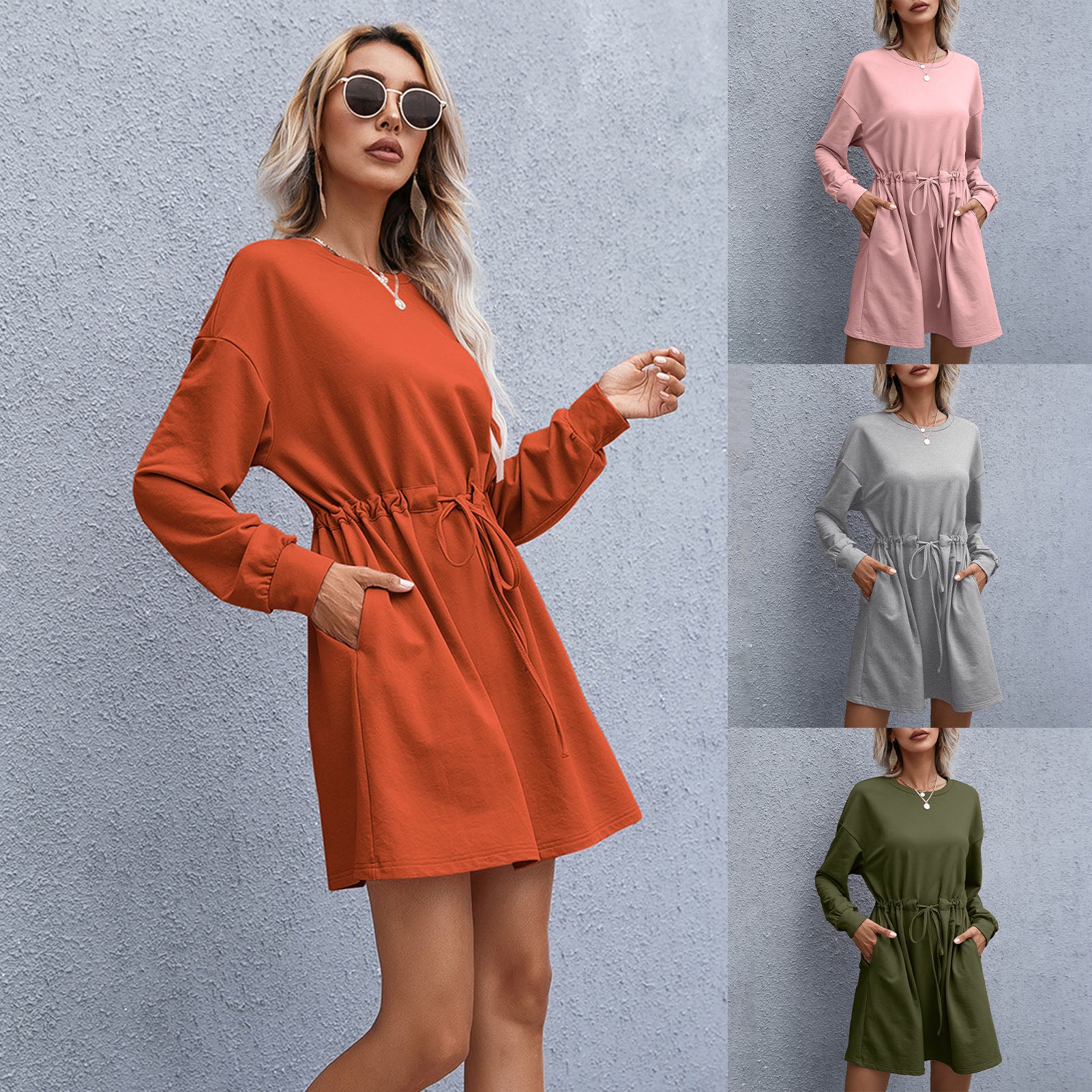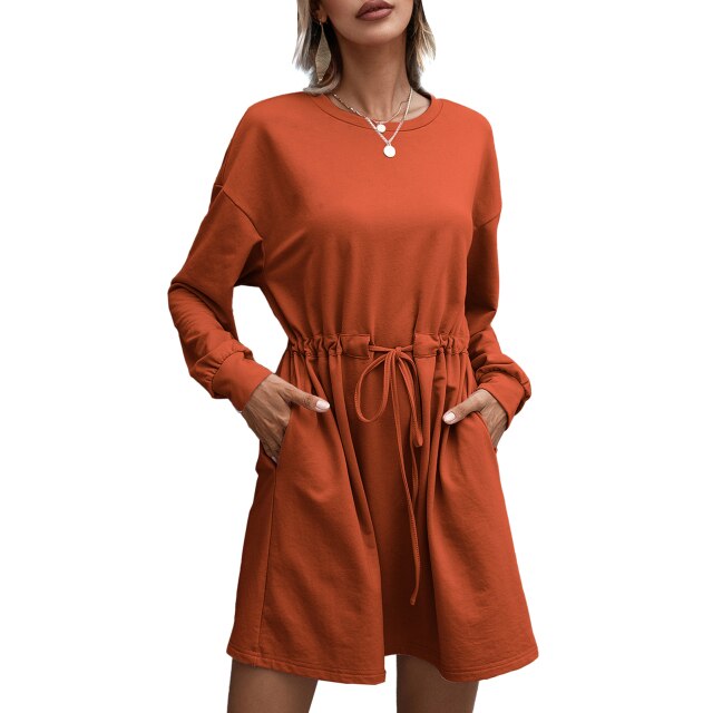 This mini dress features a loose fit, drawstring high waist, side pockets, o neck, and long sleeves. It is comfortable for your skin and shapes a better body figure. Easily create a casual and chic style with boots and a necklace.