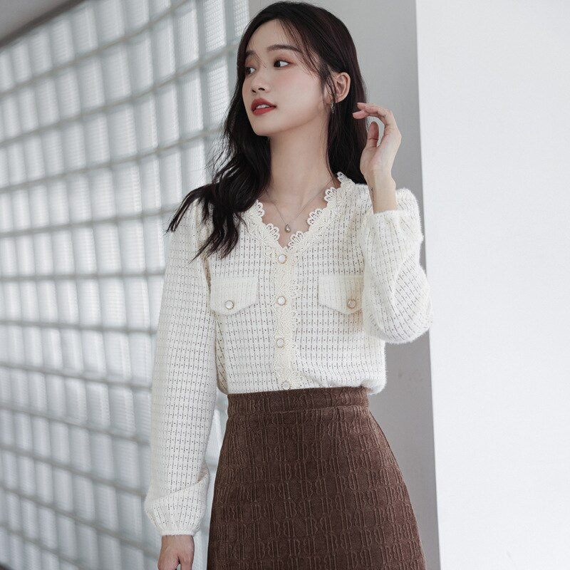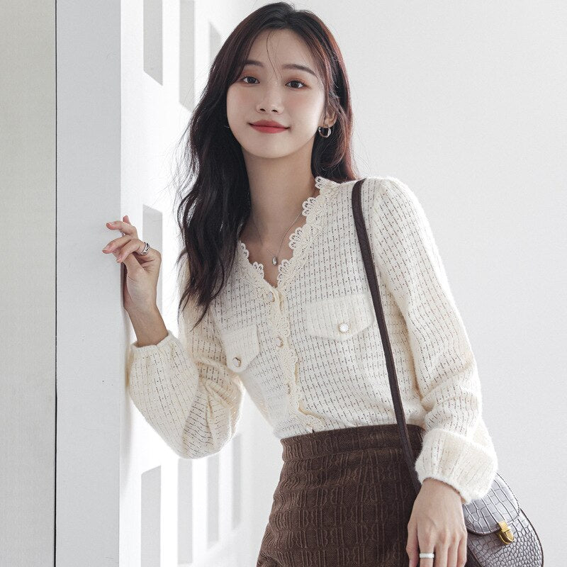 2021 Women Spring and Autumn New French retro V-neck Hollow Lace Shirt Female Design Sense Niche Puff Sleeve Blouse