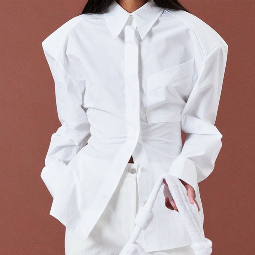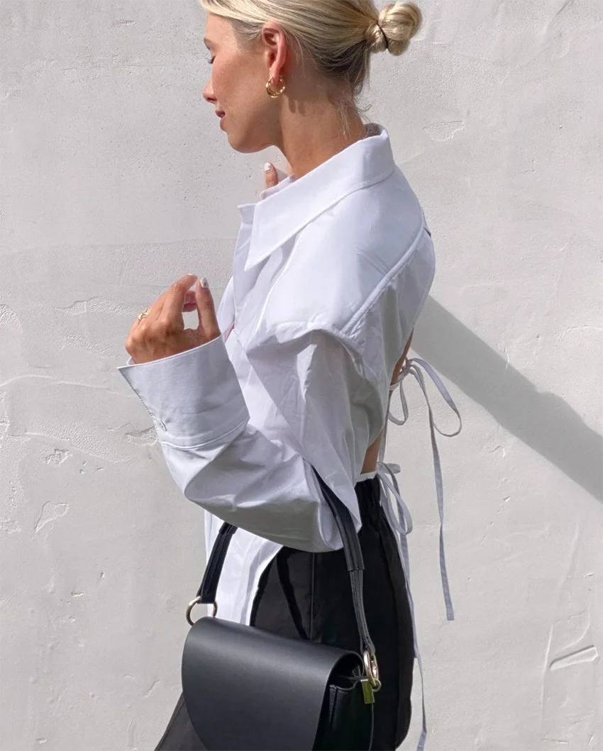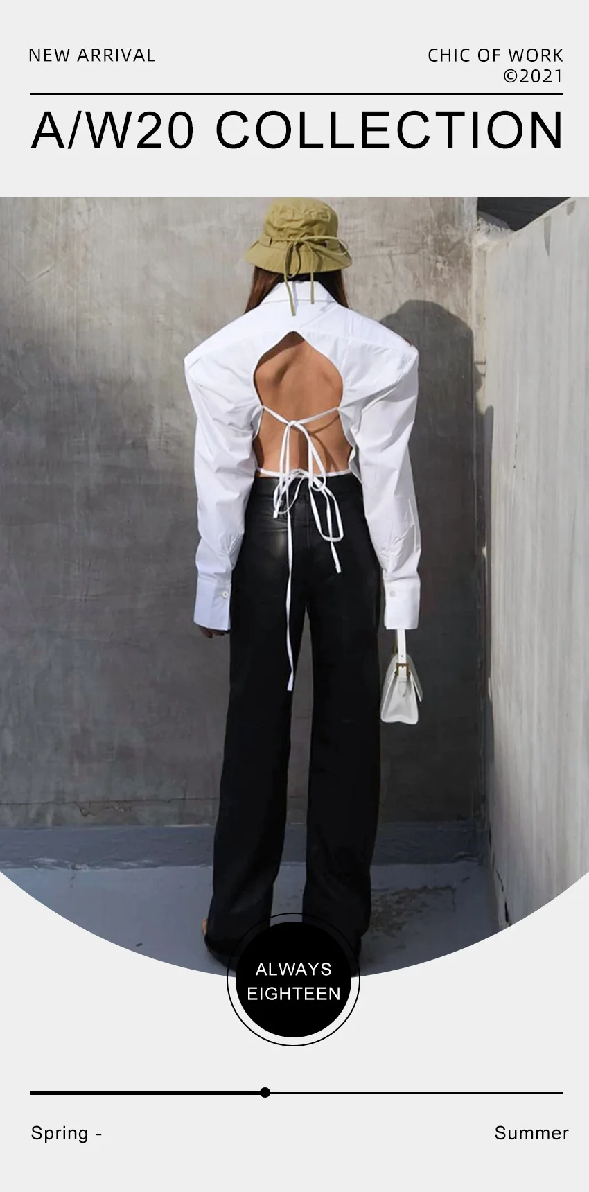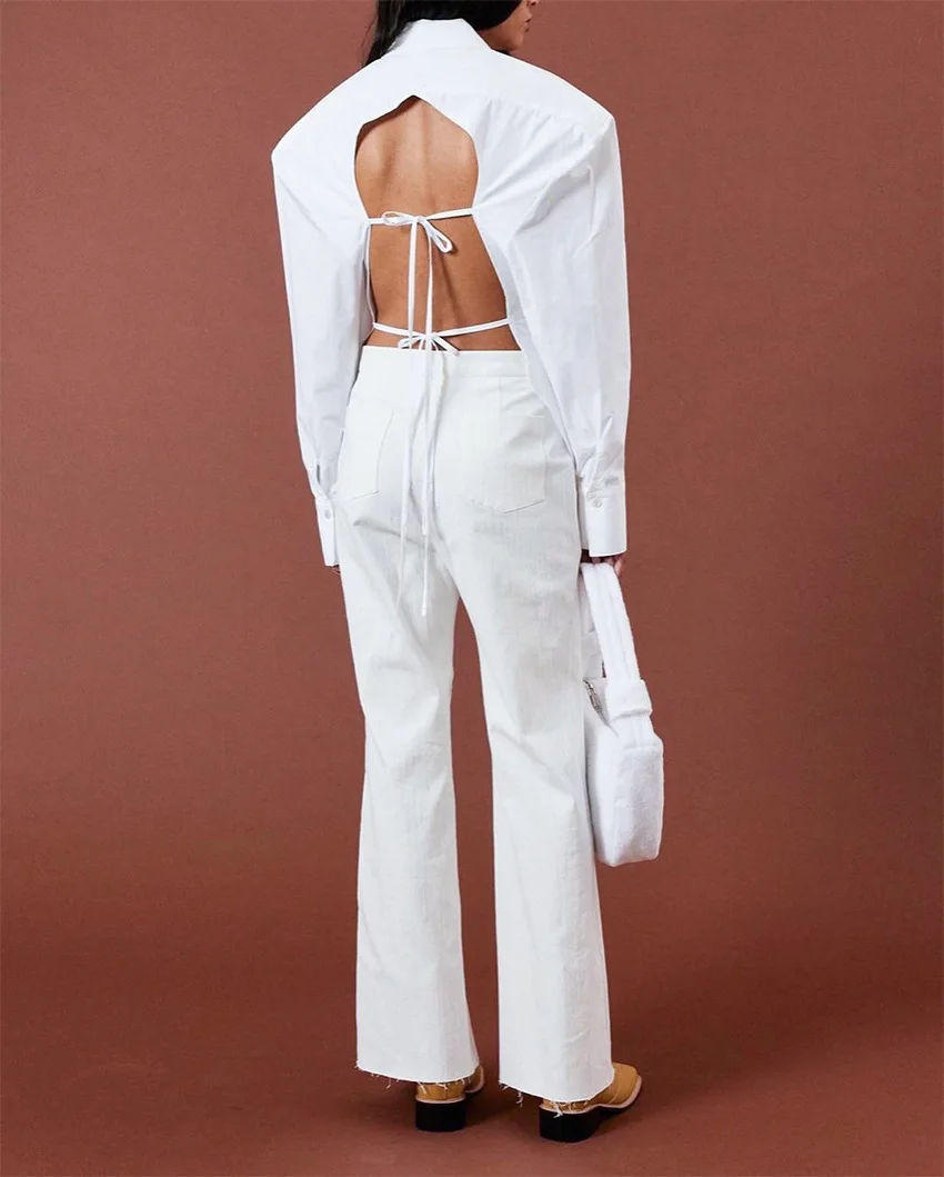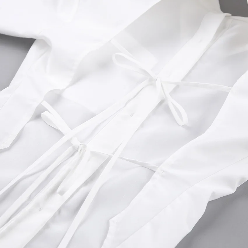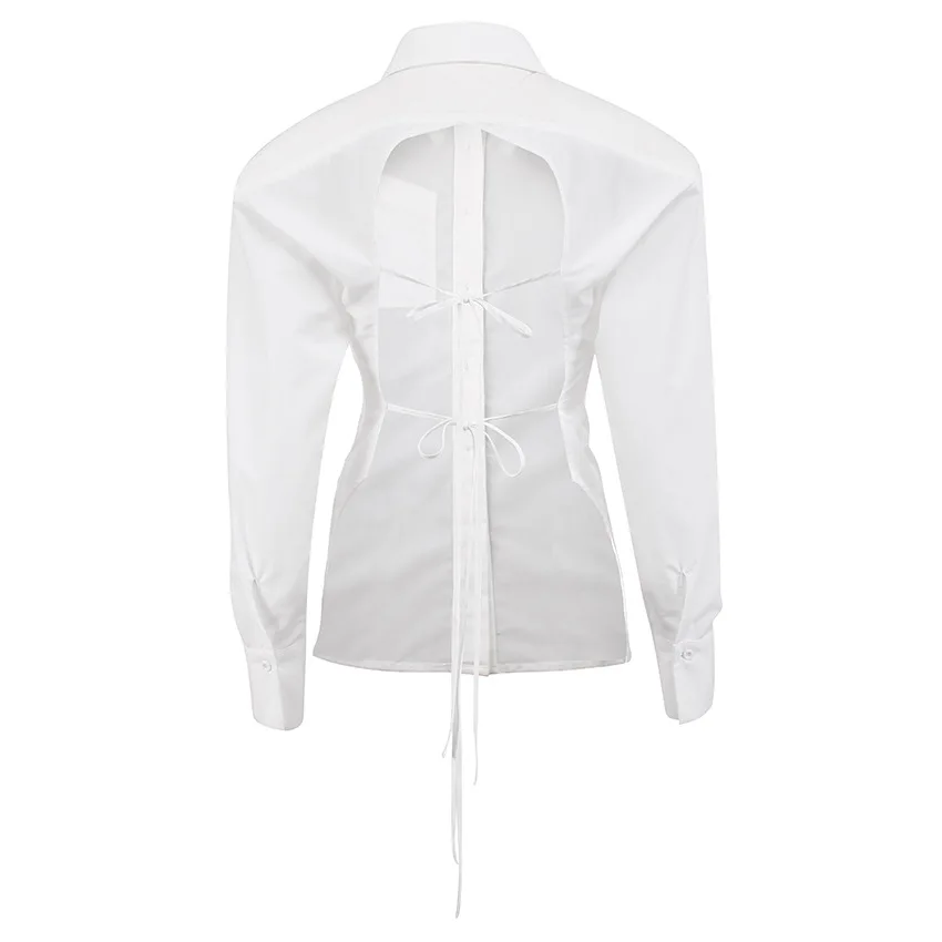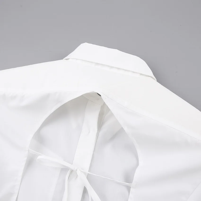 2022 Spring Fall Fashion Backless White Shirt Point Collar Shirt Long Sleeve Button Cardigan Casual Women‘s Clothes Work Streetw