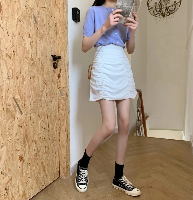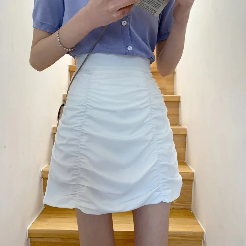 2022 Summer New Ins A-Line Skirt Sexy Pleated Short Skirt High Waist Thin Retro Hip Wrap Solid Color Puffy Skirt