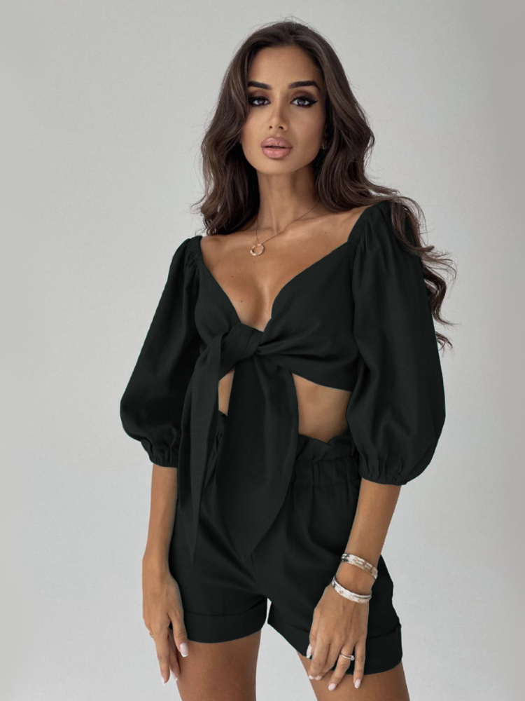2022Spring and Summer New Product Pure Color Fashion Sexy Cotton Linen Cardigan Top Pocket Shorts Casual Suit Set Woman 2 Pieces