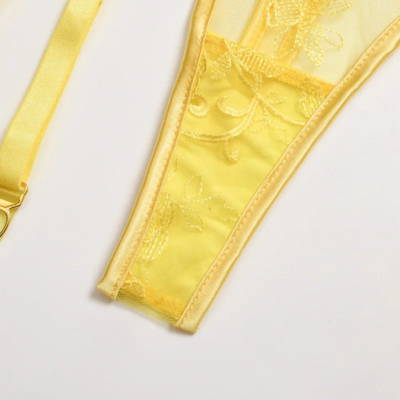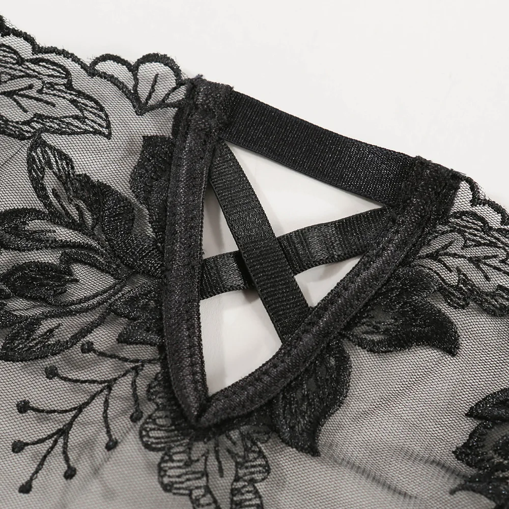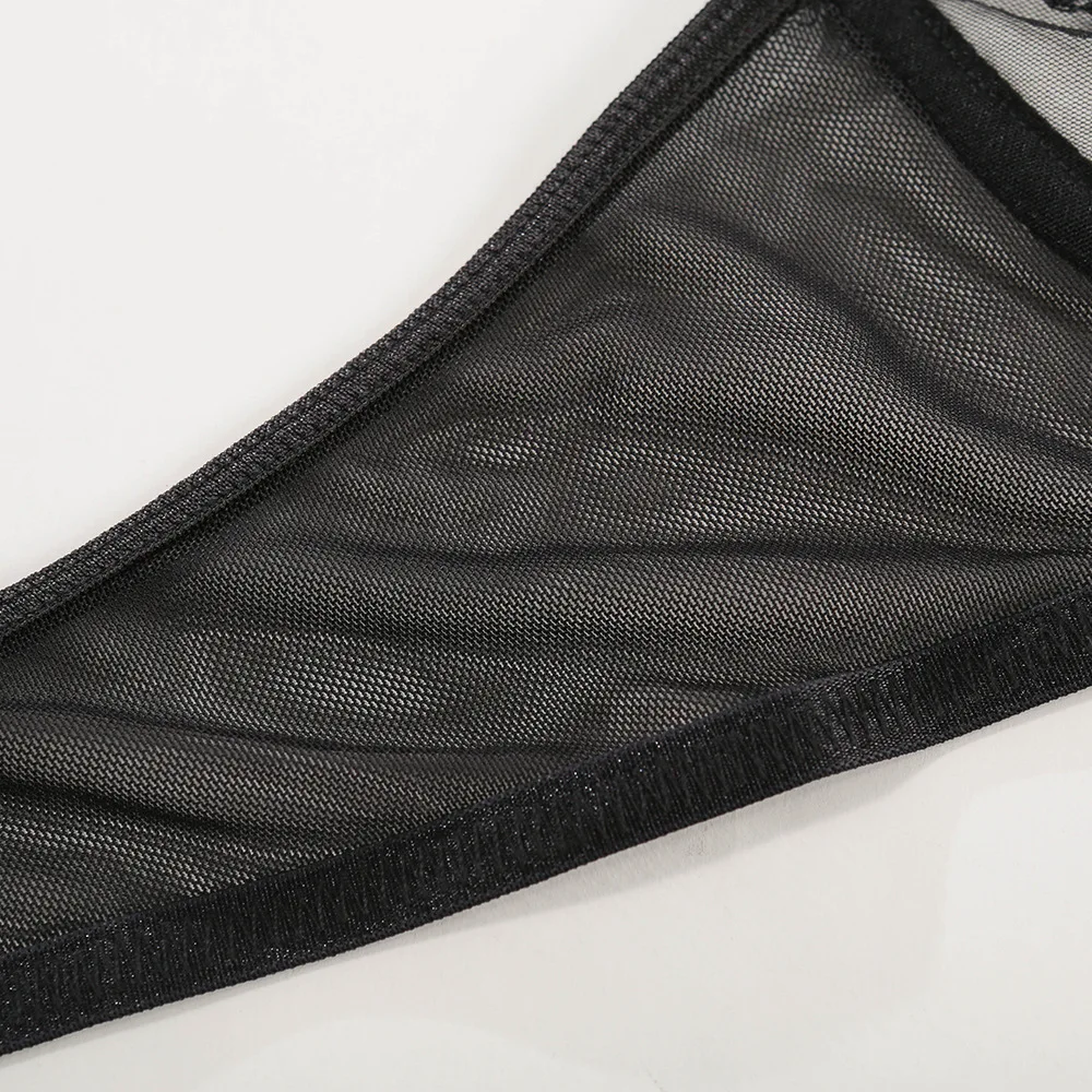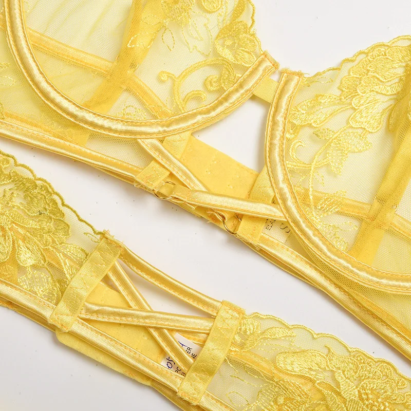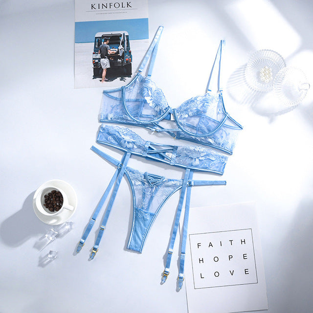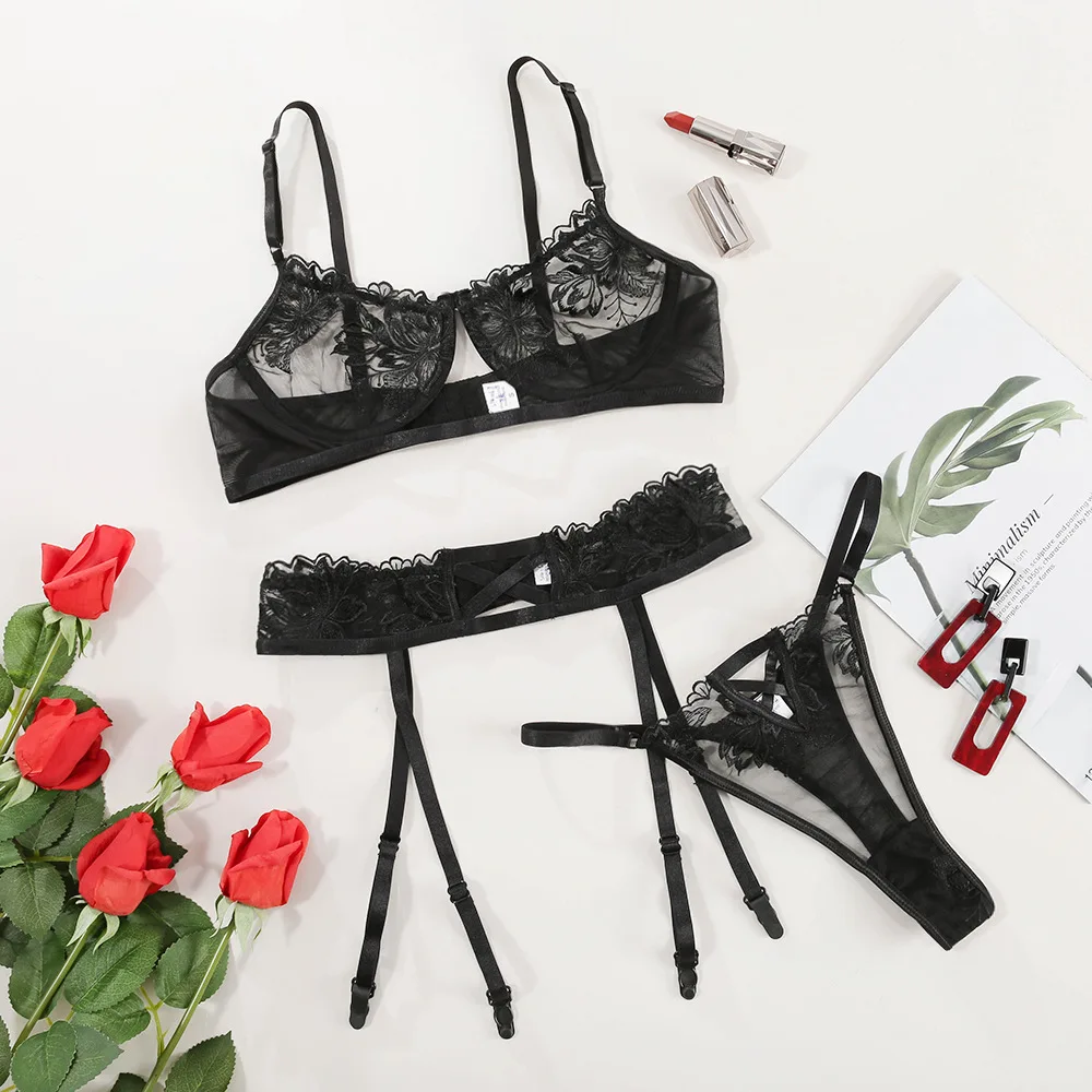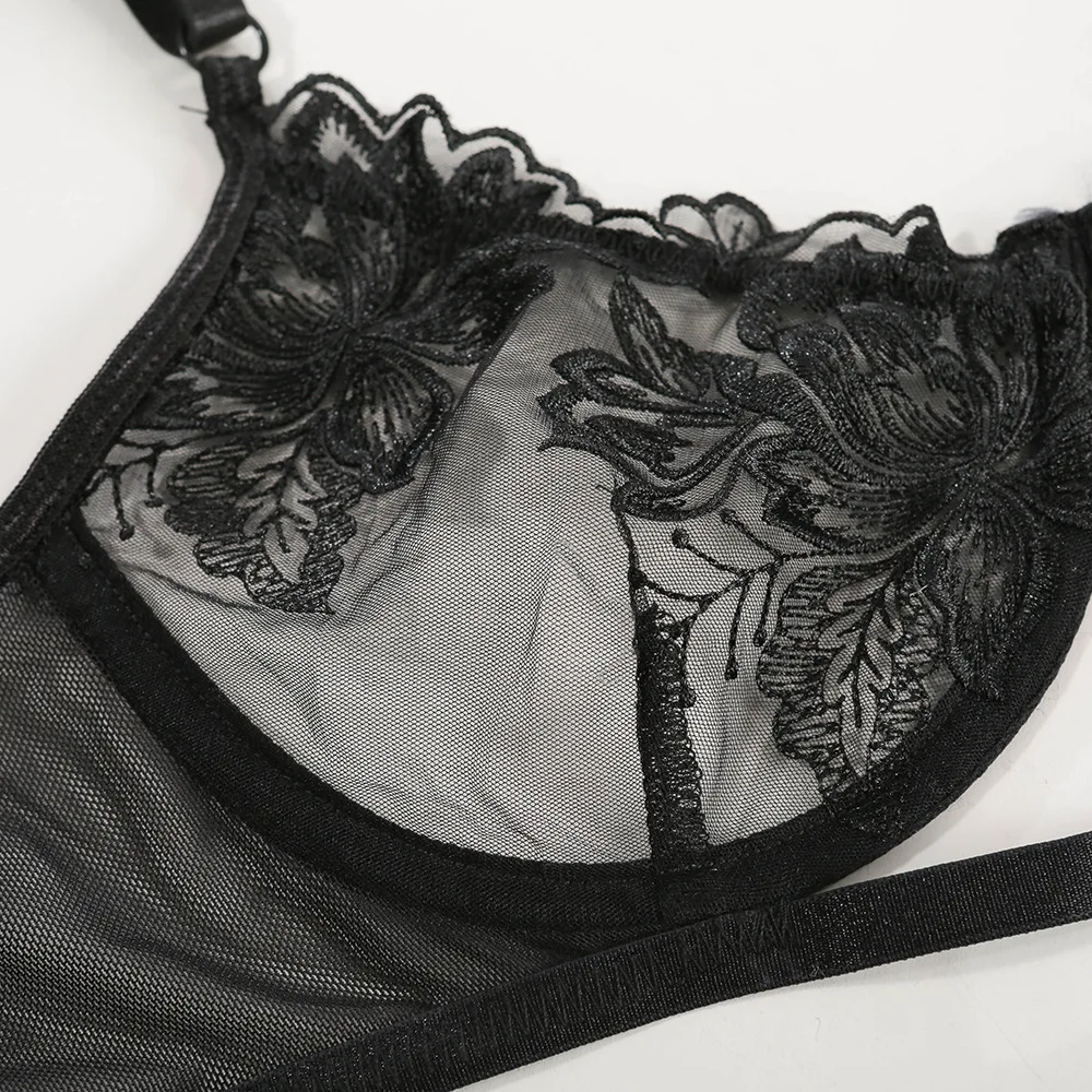 3 Piece Set Women's Thong Underwear Set Mesh Lace Transparent Bra Sexy Embroidery Flower Erotic Lingerie Erotic Costumes