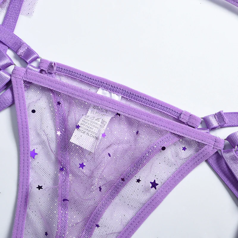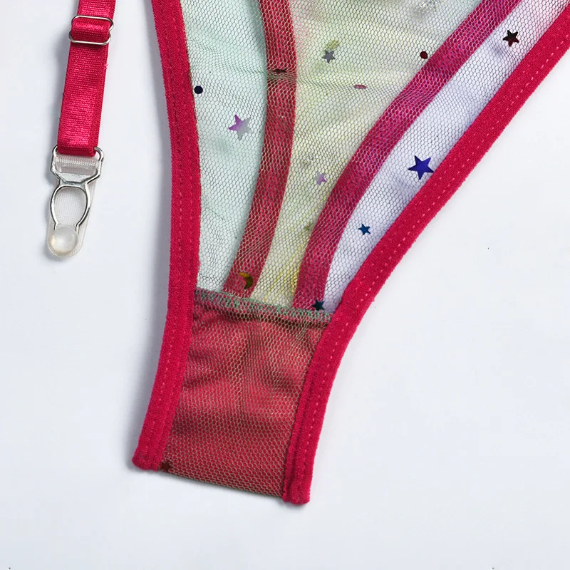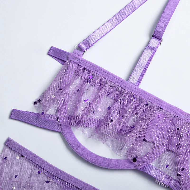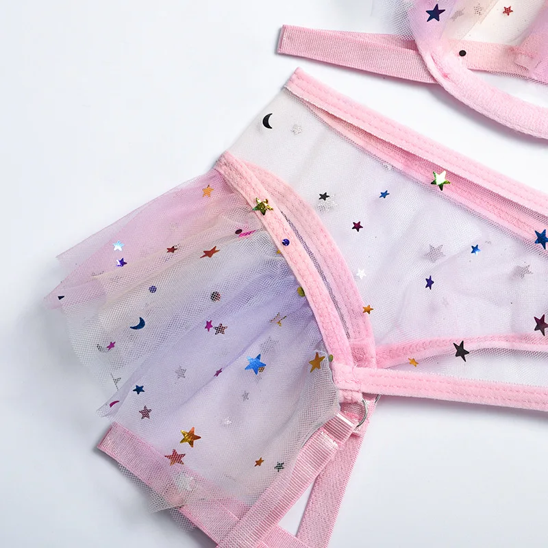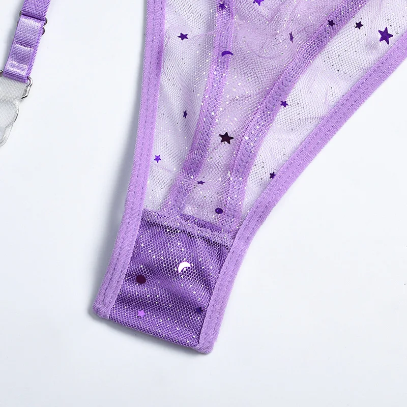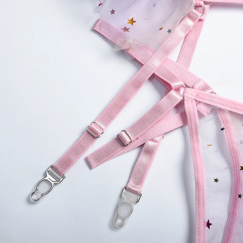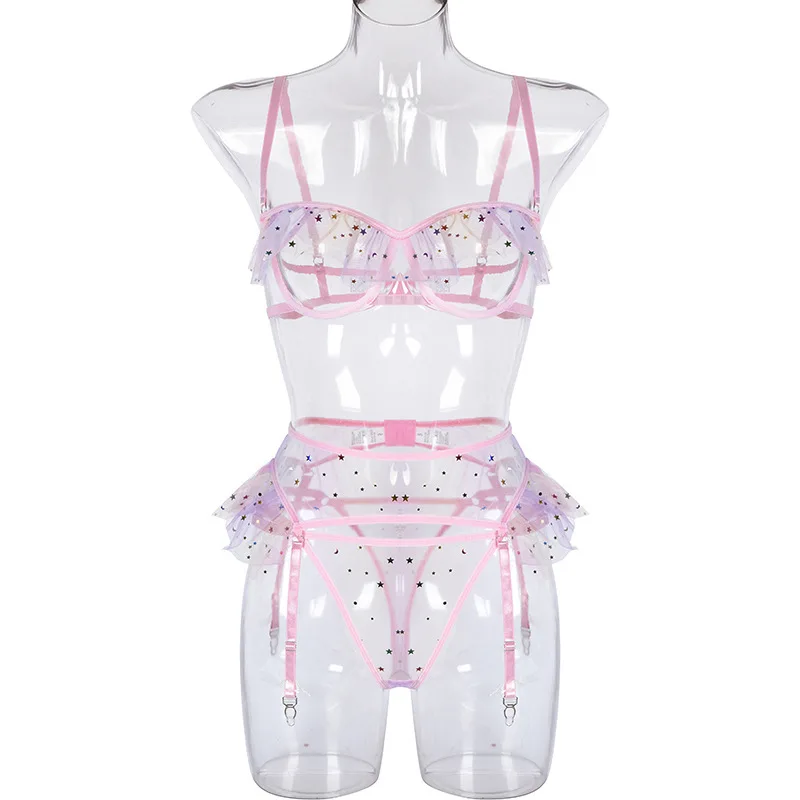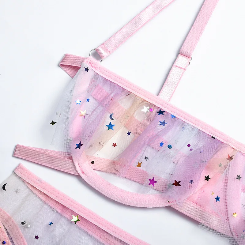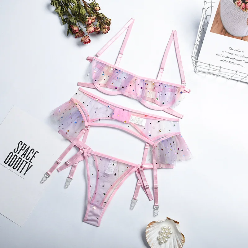 3 Pieces Lace Hollow Sexy Bra and Panties Set Bright Stars Girl Heart Underwear Suit Contrast Sequin Mesh Garters Lingerie Set