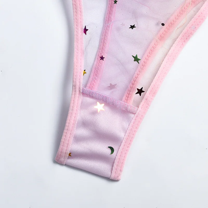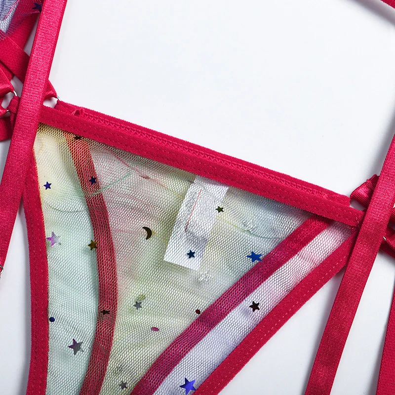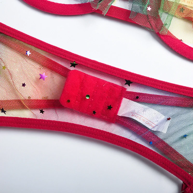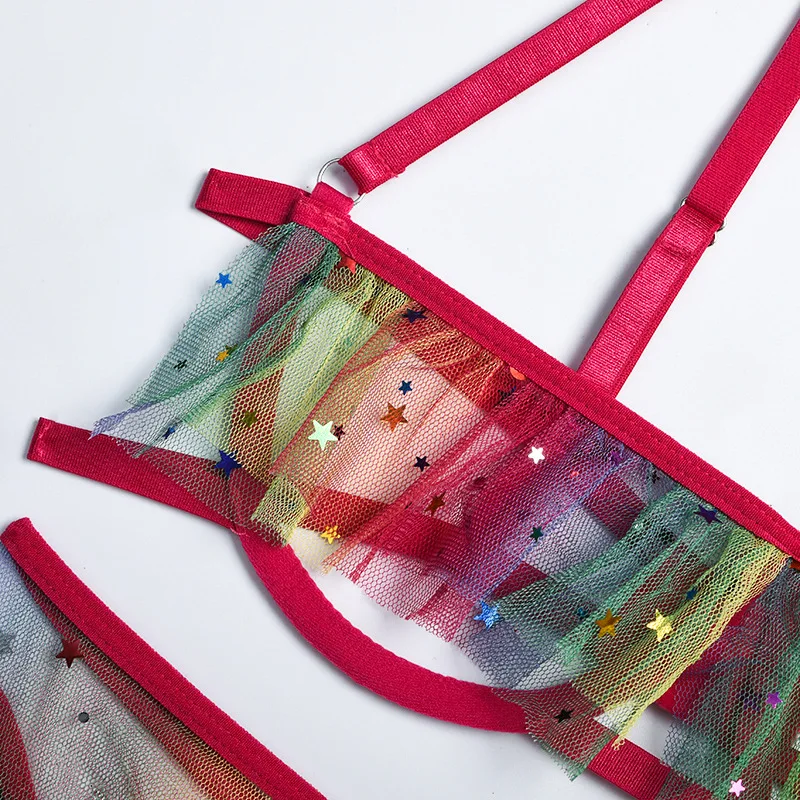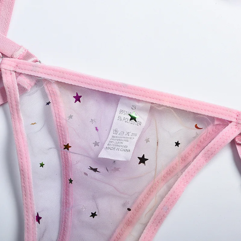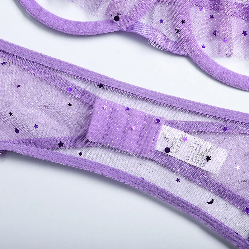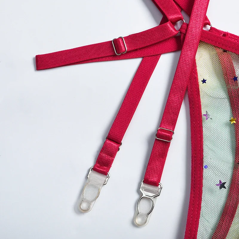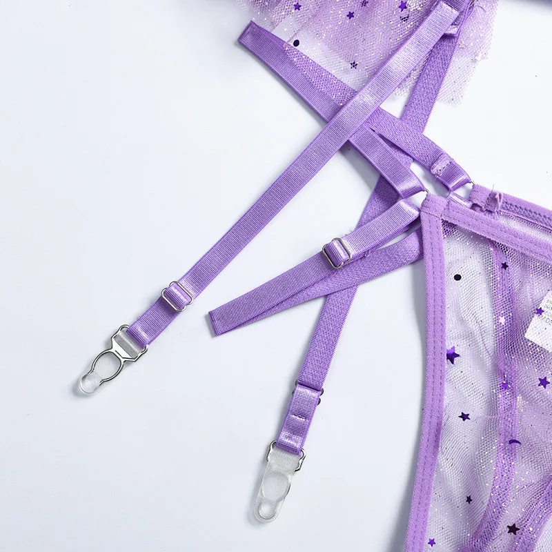 3 Pieces Lace Hollow Sexy Bra and Panties Set Bright Stars Girl Heart Underwear Suit Contrast Sequin Mesh Garters Lingerie Set