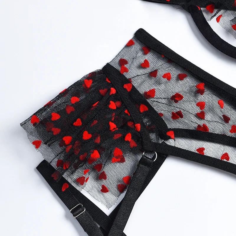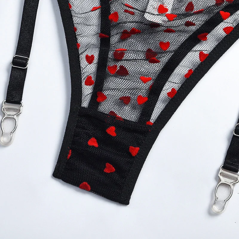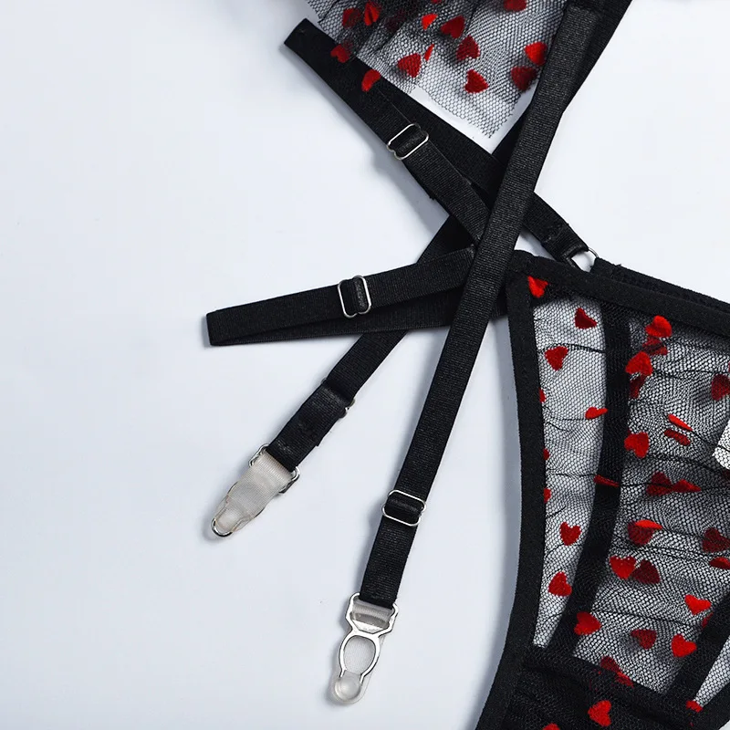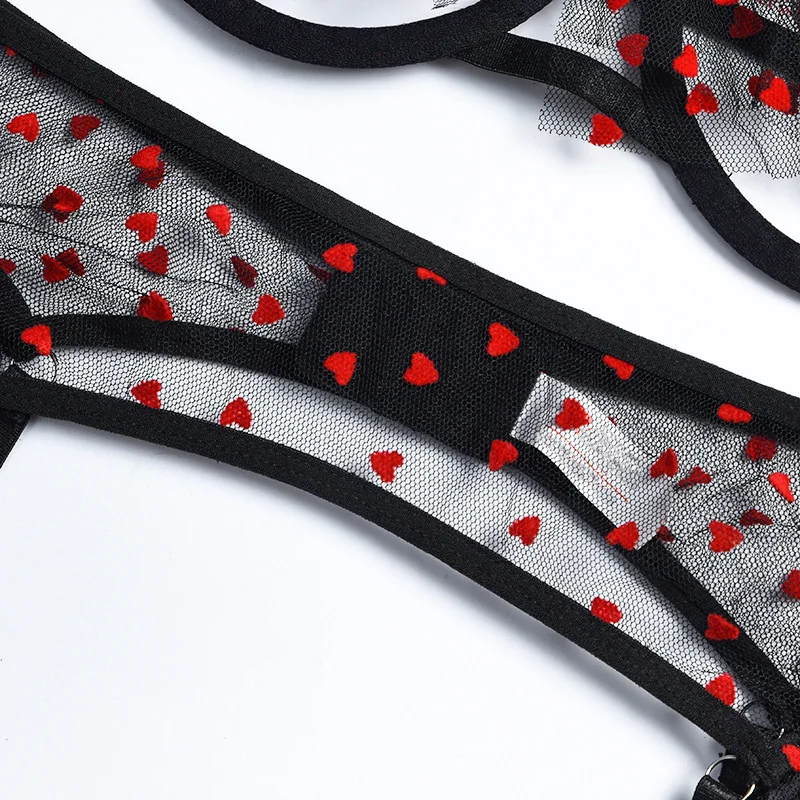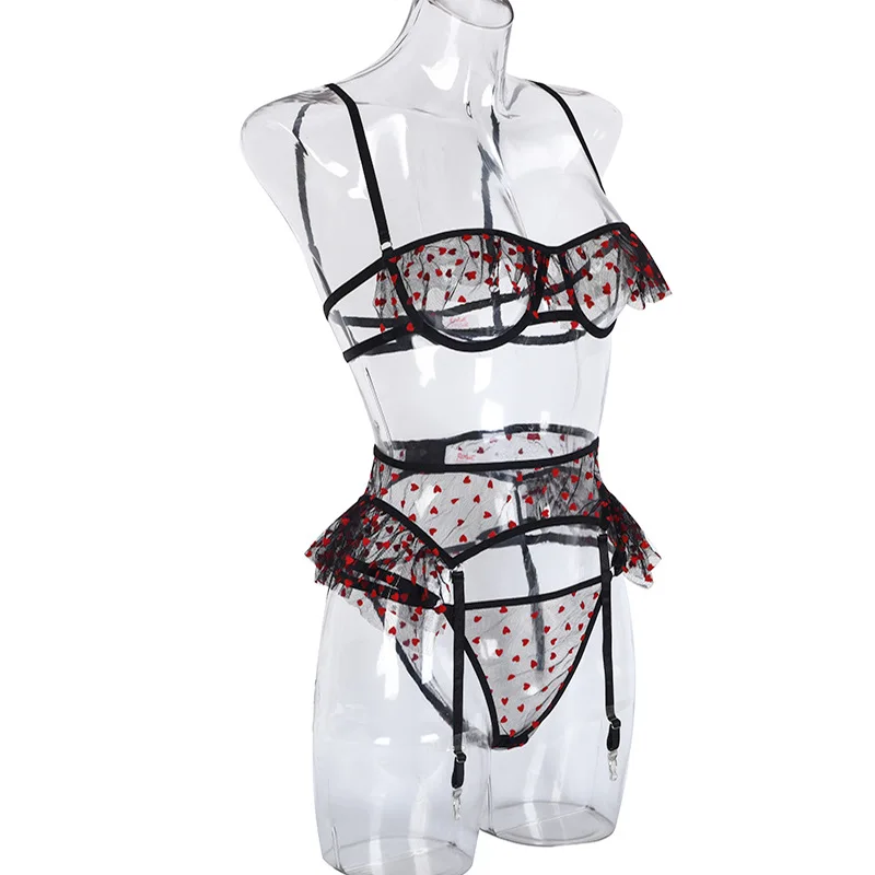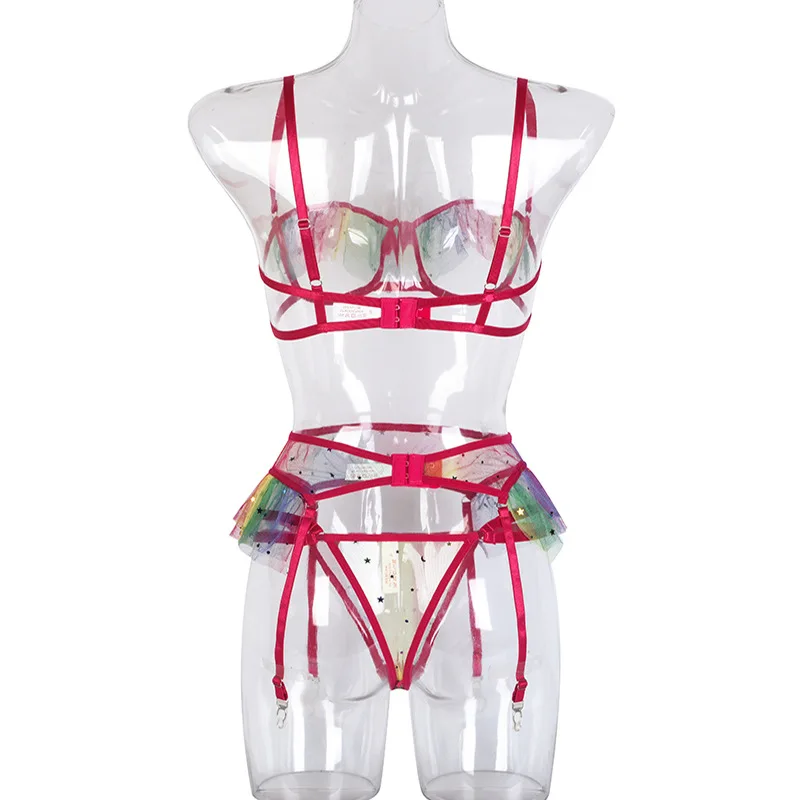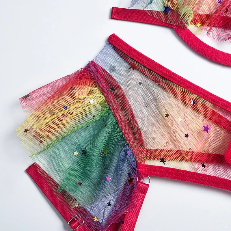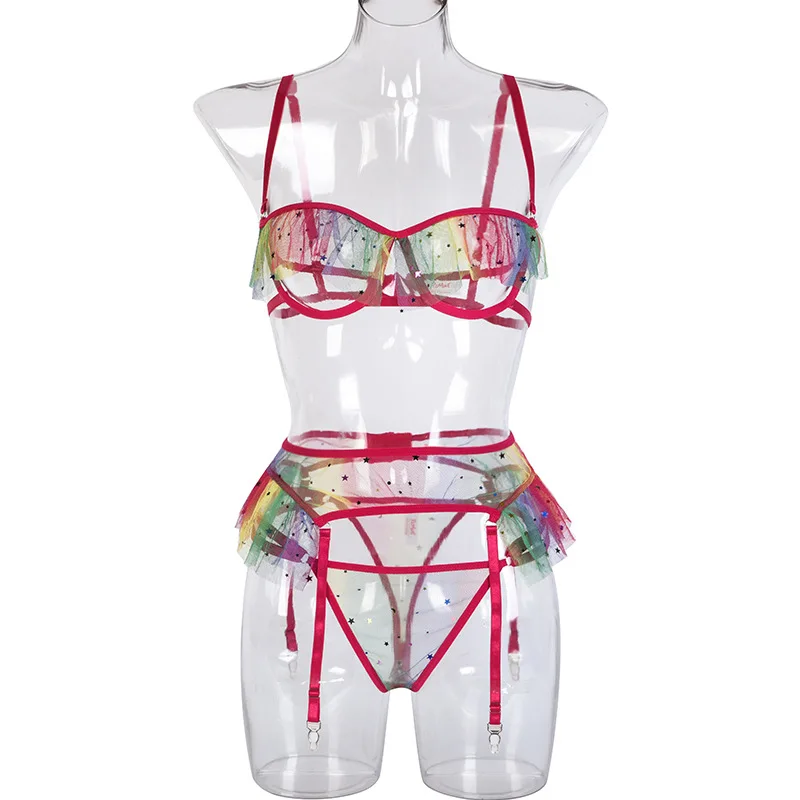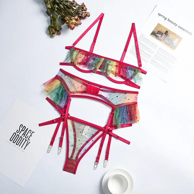 3 Pieces Lace Hollow Sexy Bra and Panties Set Bright Stars Girl Heart Underwear Suit Contrast Sequin Mesh Garters Lingerie Set