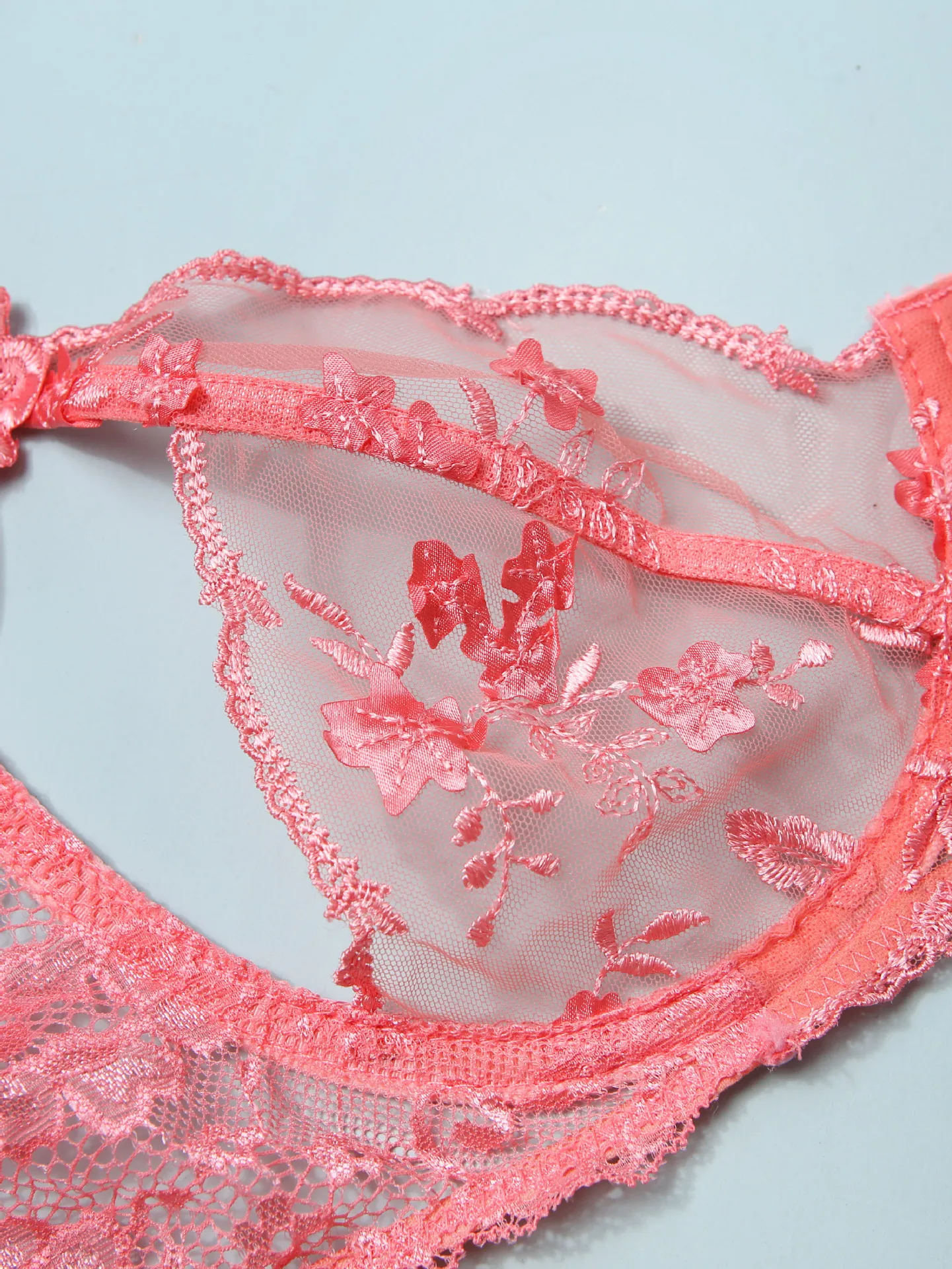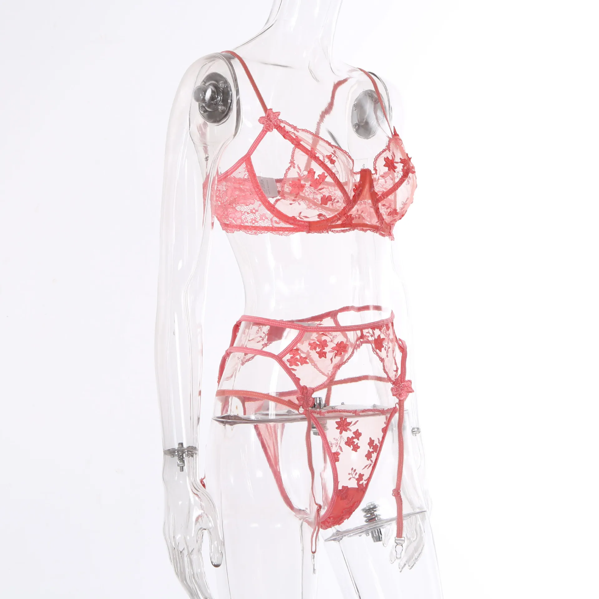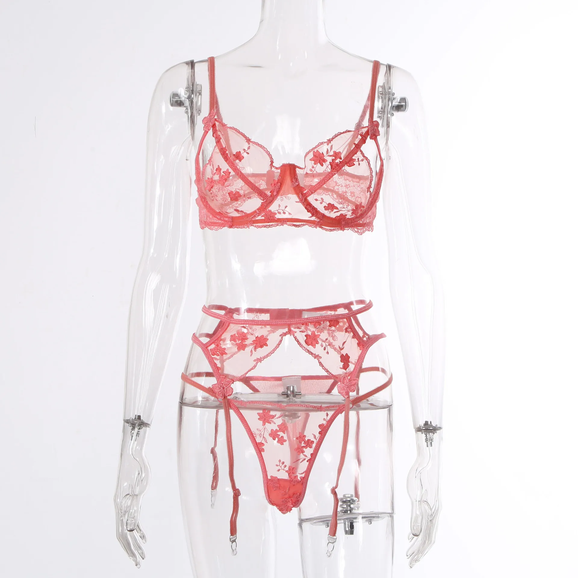 3 Pieces Set Sensual Lingerie Transparent Lace Transparent Underwear Floral Embroidery Underwire Bra and Thong Set with Garters